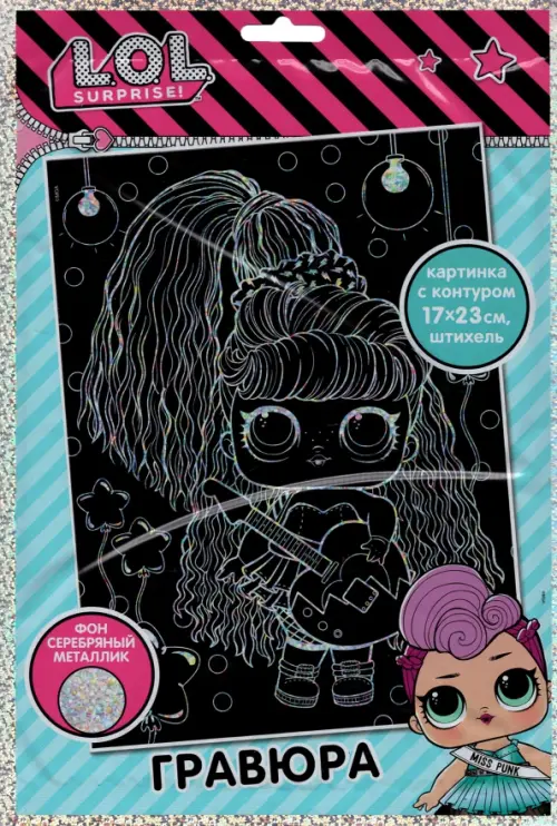 Гравюра - удивительный вид творчества, а с популярными героинями ЛОЛ становится интересным. Собери всю коллекцию ярких изображений, сделанных своими руками у себя дома! Набор для творчества включает в себя: Многослойная основа - металлизированное покрытие с черным грунтом и контурным рисунком для процарапывания сверху.