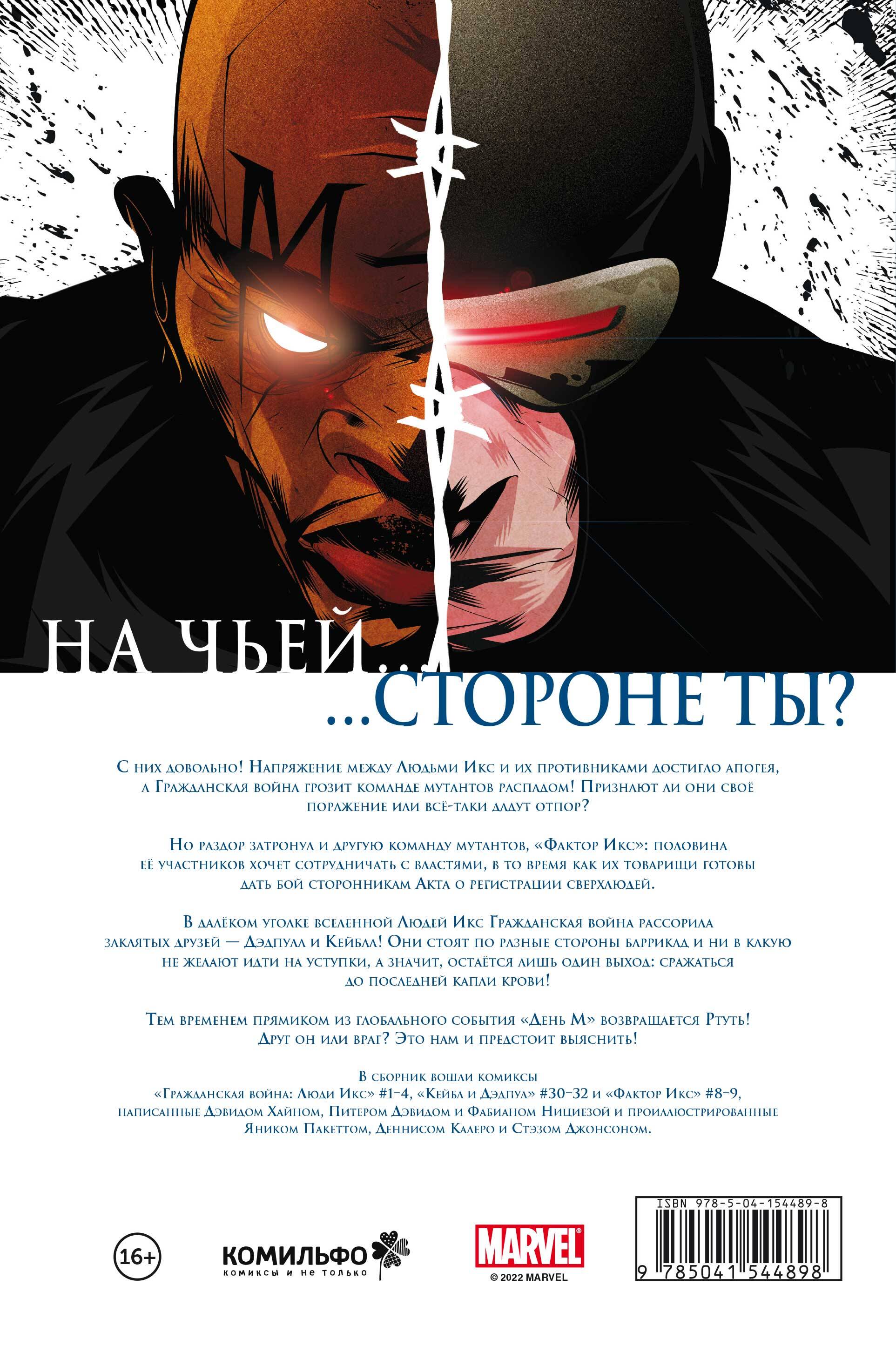 На чьей стороне ты? С них довольно! Напряжение между Людьми Икс и их противниками достигло апогея, а Гражданская война грозит команде мутантов распадом! Признают ли они своё поражение или всё-таки дадут отпор? Но раздор затронул и другую команду мутантов, «Фактор Икс»: половина её участников хочет сотрудничать с властями, в то время как их товарищи готовы дать бой сторонникам Акта о регистрации сверхлюдей. В далёком уголке вселенной Людей Икс Гражданская война рассорила заклятых друзей - Дэдпула и Кейбла! Они стоят по разные стороны баррикад и ни в какую не желают идти на уступки, а значит, остаётся лишь один выход: сражаться до последней капли крови! Тем временем прямиком из глобального события «День М» возвращается Ртуть! Друг он или враг? Это нам и предстоит выяснить! В сборник вошли комиксы «Гражданская война: Люди Икс» #1-4, «Кейбл и Дэдпул» #30-32 и «Фактор Икс» #8-9, написанные Дэвидом Хайном, Питером Дэвидом и Фабианом Нициезой и проиллюстрированные Яником Пакеттом, Деннисом Калеро и Стэзом Джонсоном.| Издательство | ООО "Издательство "Эксмо" |