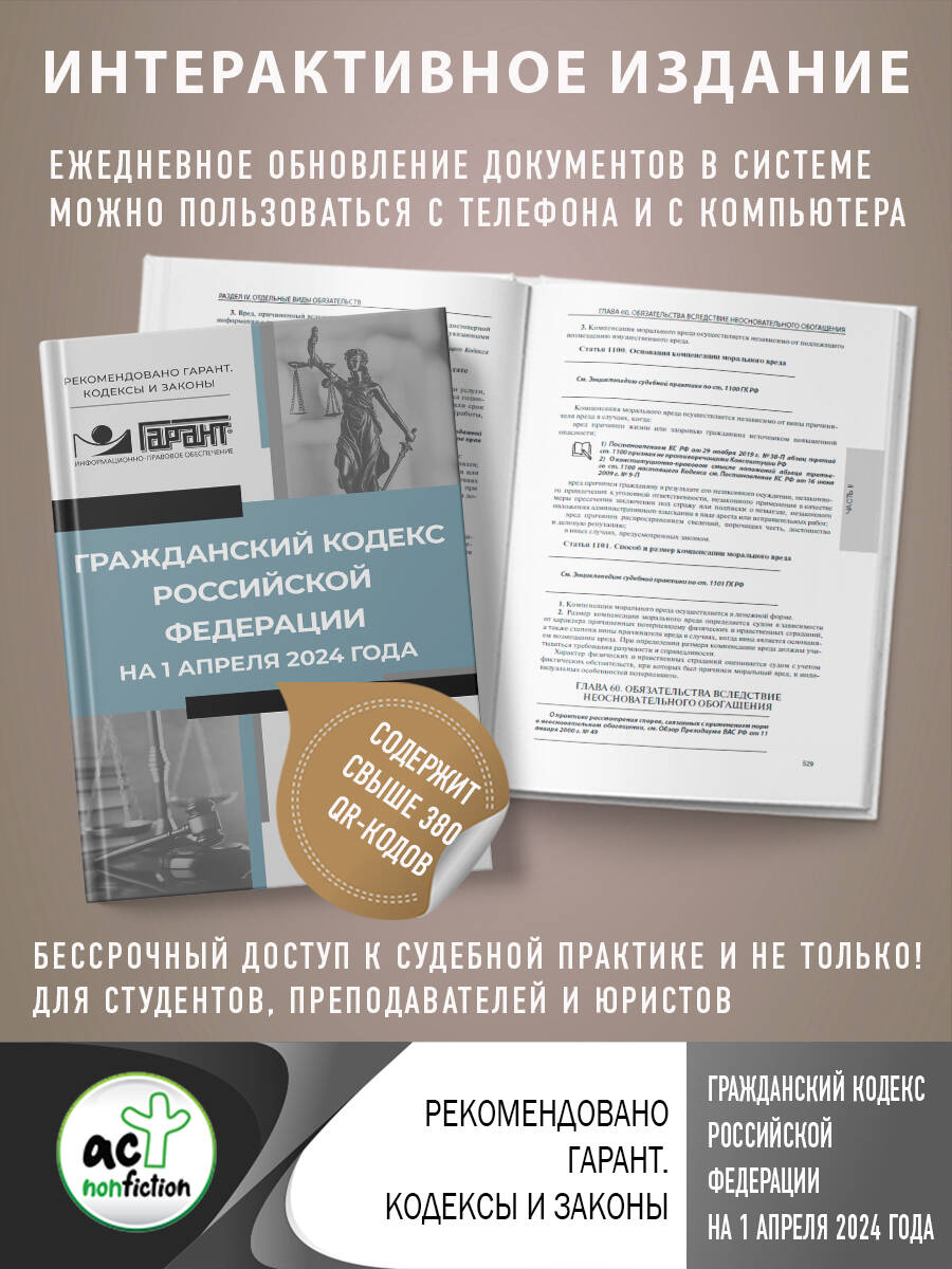 Аннотация: Гражданский кодекс Российской Федерации на 1 апреля 2024 года. QR-коды с судебной практикой в подарок