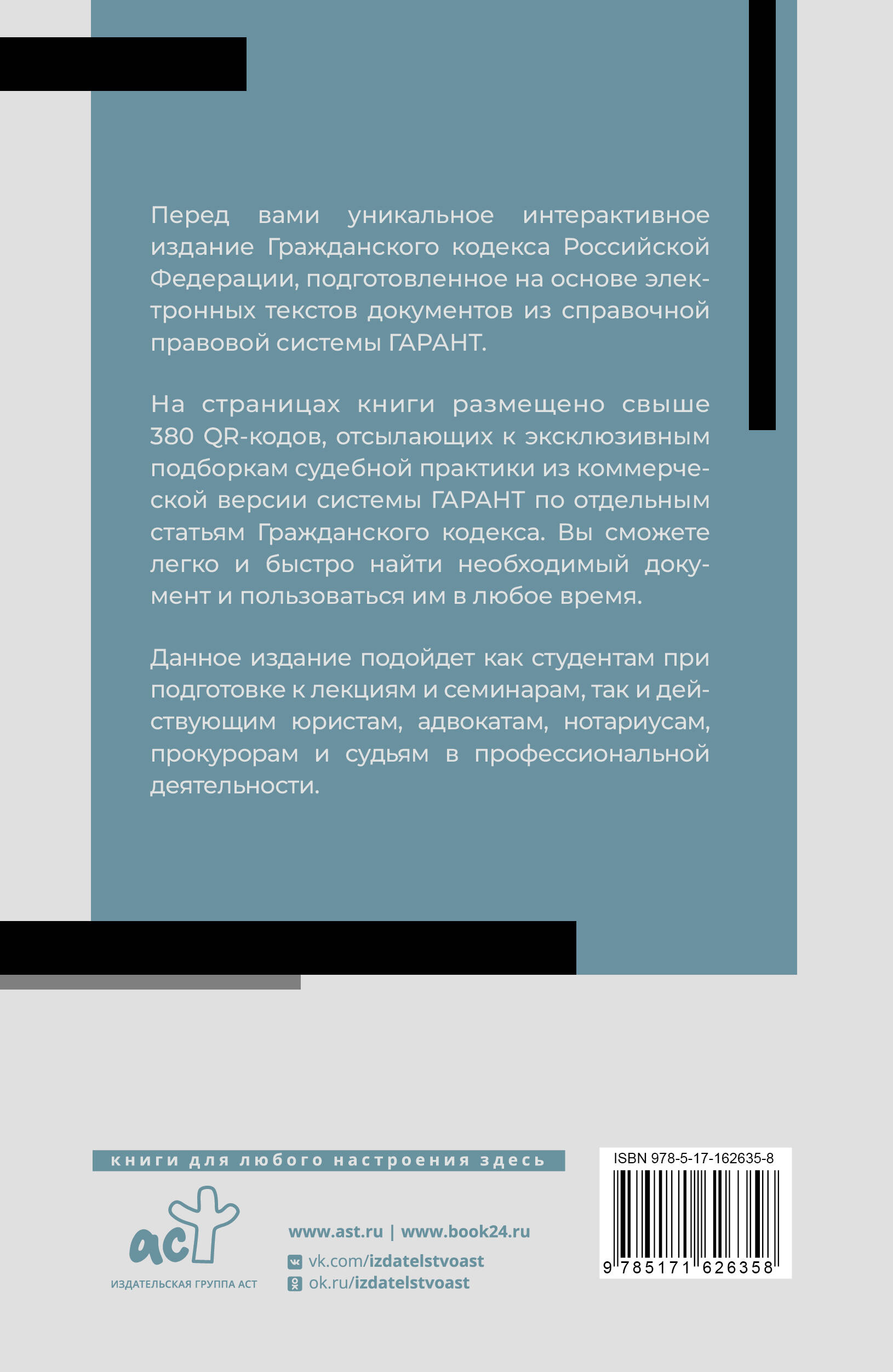 Перед вами уникальное интерактивное издание Гражданского кодекса Российской Федерации по состоянию на 1 апреля 2024 года, подготовленное на основе электронных текстов документов из справочной правовой системы "ГАРАНТ". На страницах книги размещено свыше 380 QR-кодов, перейдя по которым вы получите постоянный доступ: - к эксклюзивным материалам системы ГАРАНТ в формате Энциклопедий судебной практики; - к полному содержанию Постановлений Пленумов Верховного Суда и Высшего Арбитражного Суда РФ, связанных с применением отдельных положений Гражданского кодекса; - к обзорам правоприменительной практики судов общей юрисдикции и арбитражных судов РФ; - к самой свежей редакции ГК, которая поможет вам быть в курсе всех последних изменений! Вам больше не придется тратить время на поиск судебной практики, поскольку в данной книге уже собраны все важнейшие судебные акты, которые доступны в приложении "ГАРАНТ". Благодаря данной книге вы сможете подробно изучить содержание правовых норм, легко и быстро подготовить правовую позицию по любому судебному спору, а также в любое время пользоваться актуальными электронными документами. Издание подойдет как студентам при подготовке к лекциям и семинарам, так и действующим юристам, адвокатам, нотариусам, прокурорам и судьям в профессиональной деятельности. В текст кодекса внесены все изменения, опубликованные в официальных источниках на момент подписания в печать.| Издательство | Издательство "АСТ" |