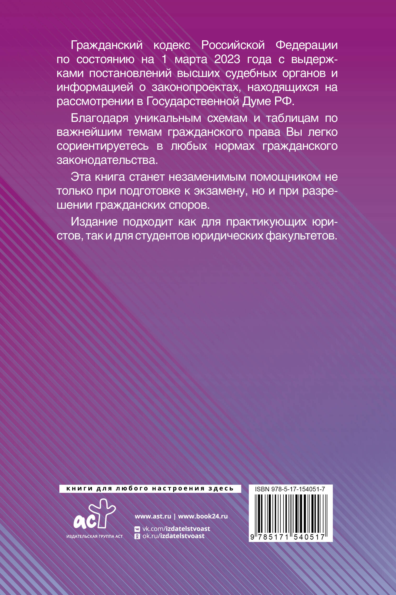 Гражданский кодекс Российской Федерации по состоянию на 1 марта 2023 года с выдержками постановлений высших судебных органов и информацией о законопроектах, находящихся на рассмотрении в Государственной Думе РФ. Благодаря уникальным схемам и таблицам по важнейшим темам гражданского права Вы легко сориентируетесь в любых нормах гражданского законодательства. Эта книга станет незаменимым помощником не только при подготовке к экзамену, но и при разрешении гражданских споров. Издание подходит как для практикующих юристов, так и для студентов юридических факультетов.| Издательство | ИЗДАТЕЛЬСТВО "АСТ" |