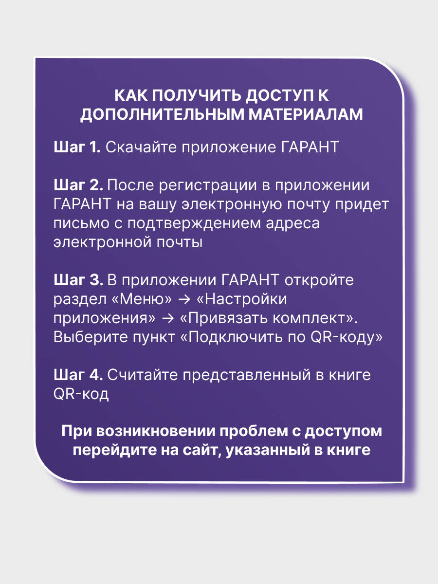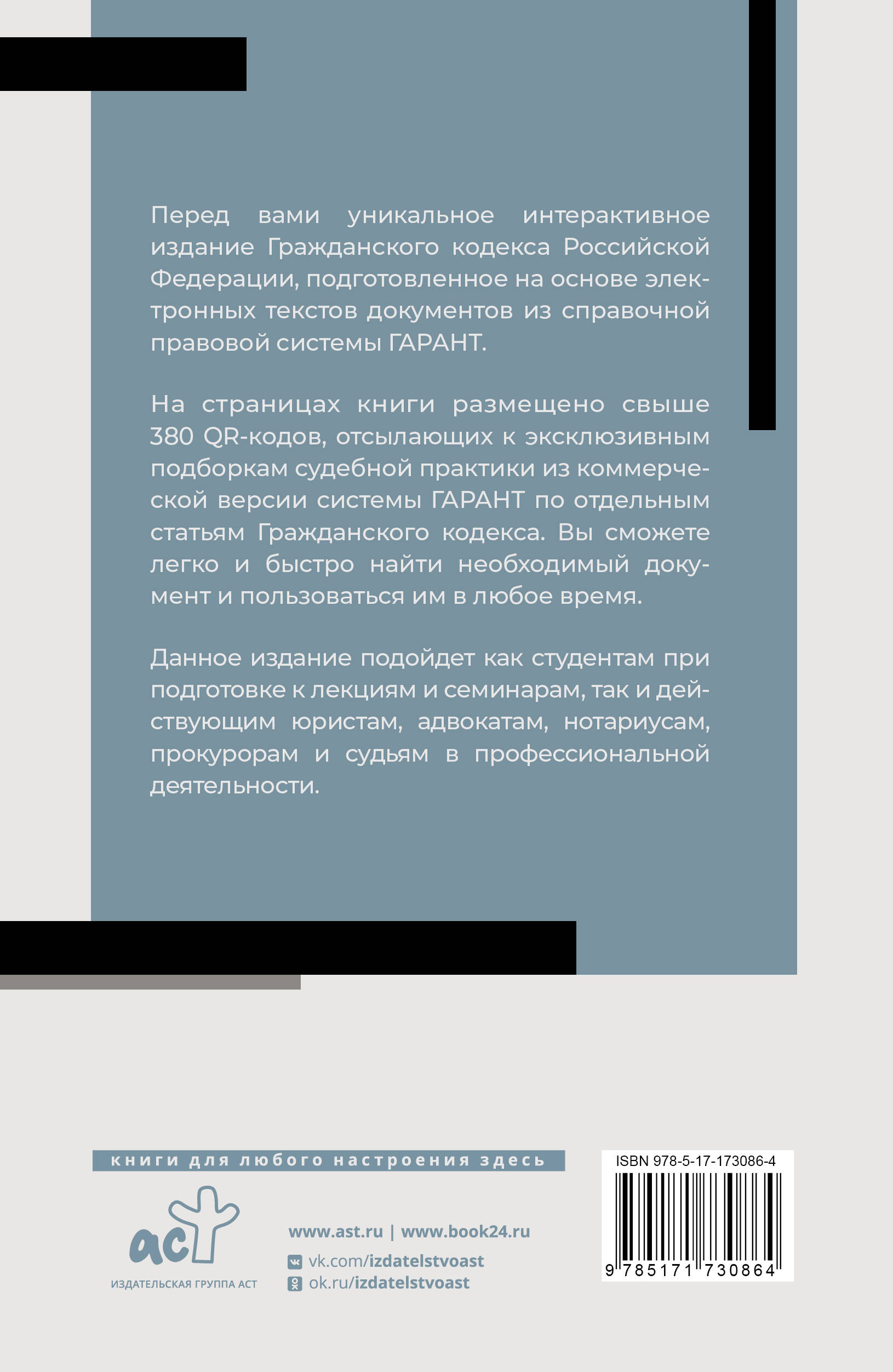 Перед вами уникальное интерактивное издание Гражданского кодекса Российской Федерации по состоянию на 1 марта 2025 года, подготовленное на основе электронных текстов документов из справочной правовой системы ГАРАНТ. На страницах книги размещено свыше 380 QR-кодов, перейдя по которым вы получите доступ: - к эксклюзивным материалам системы ГАРАНТ в формате Энциклопедии судебной практики; - к полному содержанию Постановлений Пленумов Верховного Суда и Высшего Арбитражного Суда РФ, связанных с применением отдельных положений Гражданского кодекса; - к обзорам правоприменительной практики судов общей юрисдикции и арбитражных судов РФ; - к самой свежей редакции ГК, которая поможет вам быть в курсе всех последних изменений! Вам больше не придется тратить время на поиск судебной практики, поскольку в данной книге уже собраны все важнейшие судебные акты, которые доступны в приложении ГАРАНТ. Вы сможете подробно изучить содержание правовых норм, легко и быстро подготавливать правовые позиции по судебным спорам, а также пользоваться актуальными электронными документами. Издание подойдет как студентам при подготовке к лекциям и семинарам, так и действующим юристам, адвокатам, нотариусам, прокурорам и судьям в профессиональной деятельности. В текст кодекса внесены все изменения, опубликованные в официальных источниках на момент подписания в печать. Доступ к дополнительным материалам действует до 28 февраля 2026 года.| Издательство | Издательство "АСТ" |