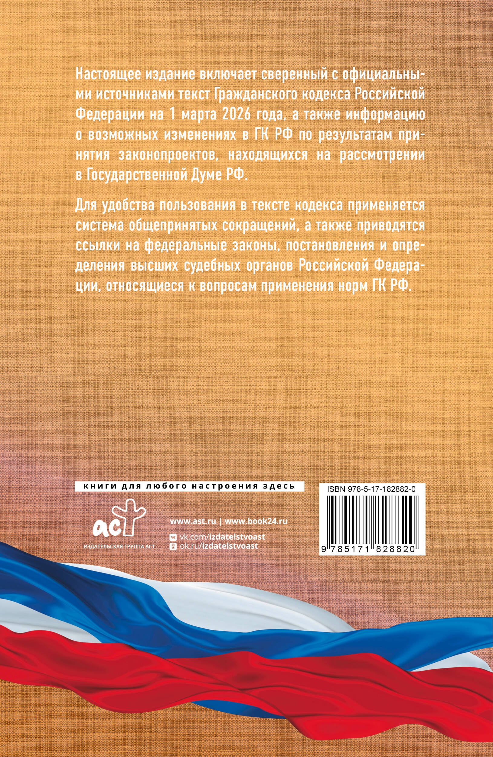 Данное издание Гражданского кодекса Российской Федерации сверено с официальным источником и приводится по состоянию на 1 марта 2026 года. Кодекс содержит все 4 части, а также учитывает все изменения, опубликованные в официальных источниках на момент подписания издания в печать. В издании представлена информация о возможных изменениях в ГК РФ по результатам принятия законопроектов, находящихся на рассмотрении в Государственной Думе РФ. Для более удобного использования в тексте кодекса применяется система сокращенного написания отдельных слов и выражений, а также приводятся ссылки на федеральные законы, постановления и определения высших судебных органов Российской Федерации, относящиеся к вопросам применения норм гражданского права.| Издательство | Издательство "АСТ" |