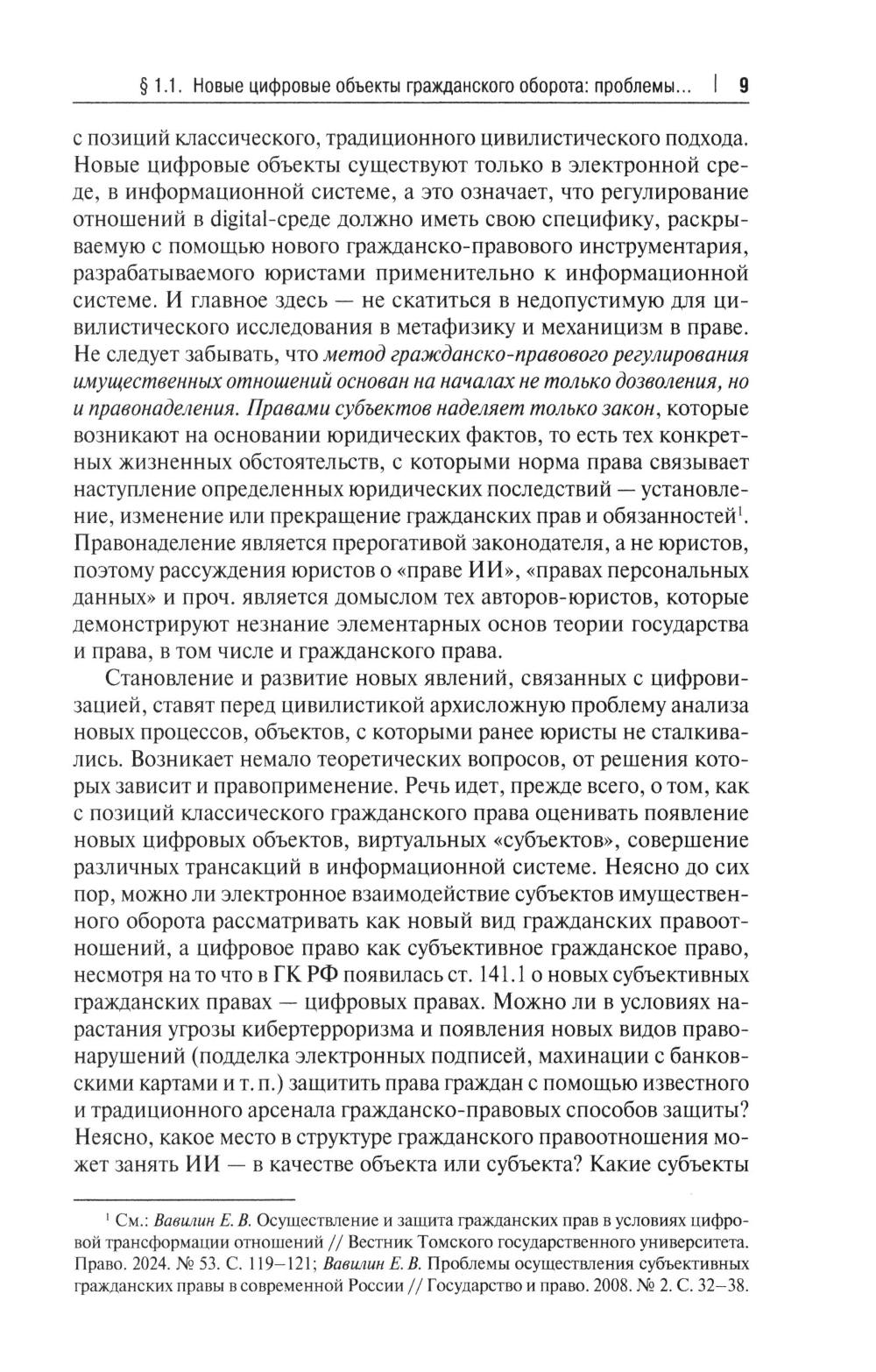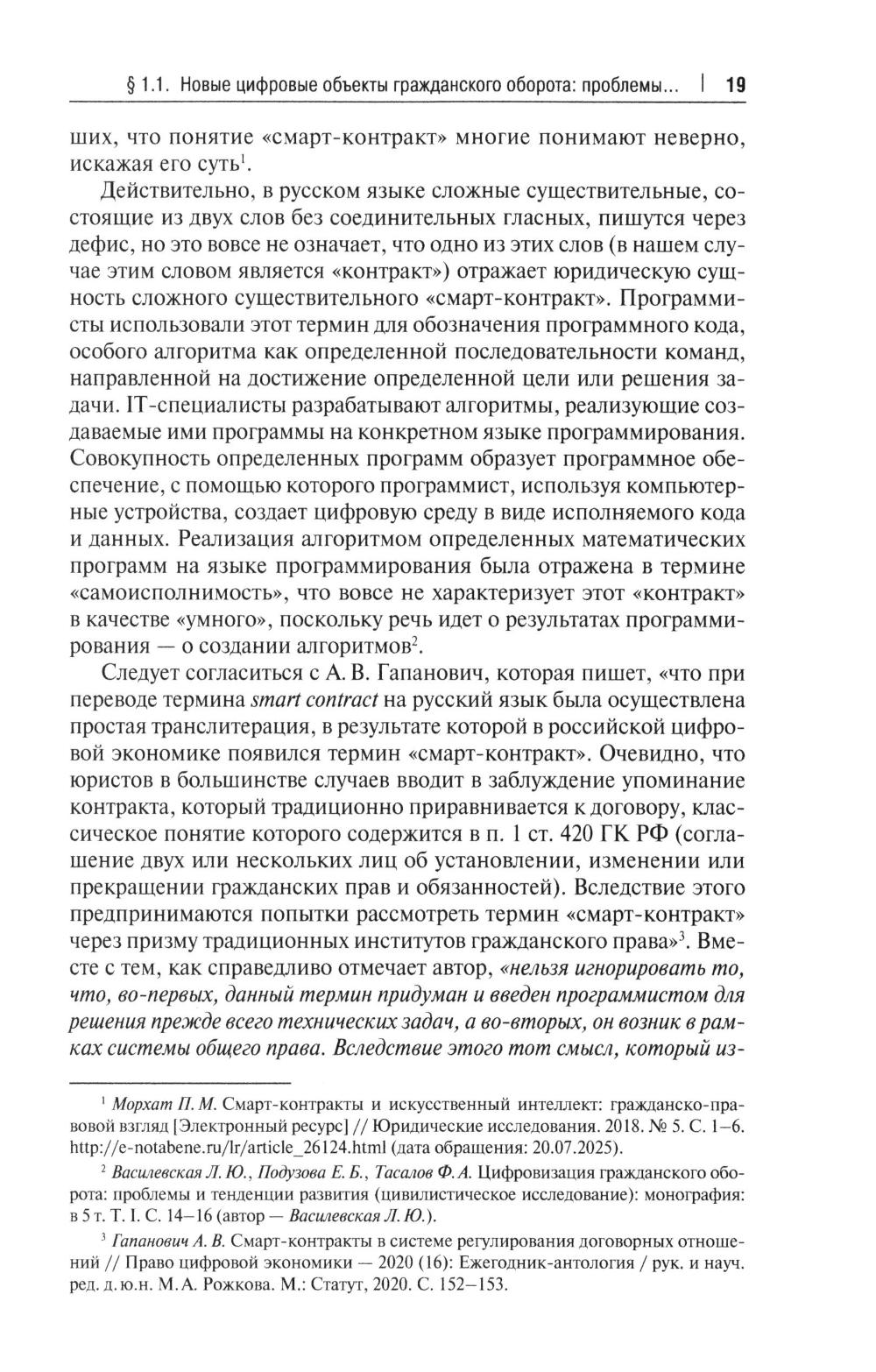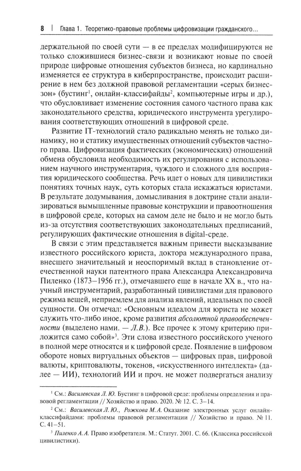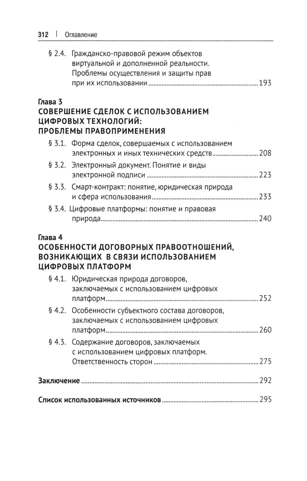 Представленная монография посвящена наиболее актуальным и востребованным на практике нерешенным проблемам гражданского оборота в условиях цифровизации и предназначена для изучения вопросов гражданско-правового регулирования отношений цифровизации гражданского оборота. В работе дана юридическая характеристика цифровых объектов и сделок, совершаемых при помощи электронных и иных технических средств, смарт-контрактов, отношений с использованием инновационных цифровых платформ. Выявлена специфика договорного оформления изучаемых отношений и их нормативной регламентации, проанализированы актуальные проблемы правового регулирования отношений в наиболее востребованных сферах. Установлены недостатки в законодательной регламентации рассматриваемых отношений, сделаны предложения по их решению. Позиция авторов обоснована с учетом актуальных направлений развития гражданского законодательства и современных подходов в правоприменительной практике к разрешению соответствующих споров. Это позволяет использовать данную монографию руководителям правовых департаментов, подразделений, обеспечивающих информационную безопасность юридических лиц и органов государственной власти, представителям правоохранительных органов, адвокатуры, нотариата и судейского сообщества, иным правоприменителям для обоснования принимаемых решений. В книге подробно рассмотрены практические проблемы, связанные с использованием цифровых технологий в различных сферах деятельности, что представляет интерес для бизнес-сообщества, в частности компаний, работающих в сфере маркетинга в социальных сетях (SMM), а также для практикующих юристов, специализирующихся на правовом сопровождении передачи, обработки и хранения цифровой информации. Материал монографии базируется на комплексном анализе большого количества источников. Работа будет полезна для обучающихся высших учебных заведений уровней бакалавриата, магистратуры, специалитета и преподавателей юридических дисциплин. Критический анализ современных доктринальных и практических подходов к регламентации отношений в условиях цифровизации выступает хорошей основой для подробного изучения рассматриваемой проблематики в ходе обучения по юридическим, экономическим и информационным образовательным профилям. Законодательство приведено по состоянию на 15 августа 2025 г.