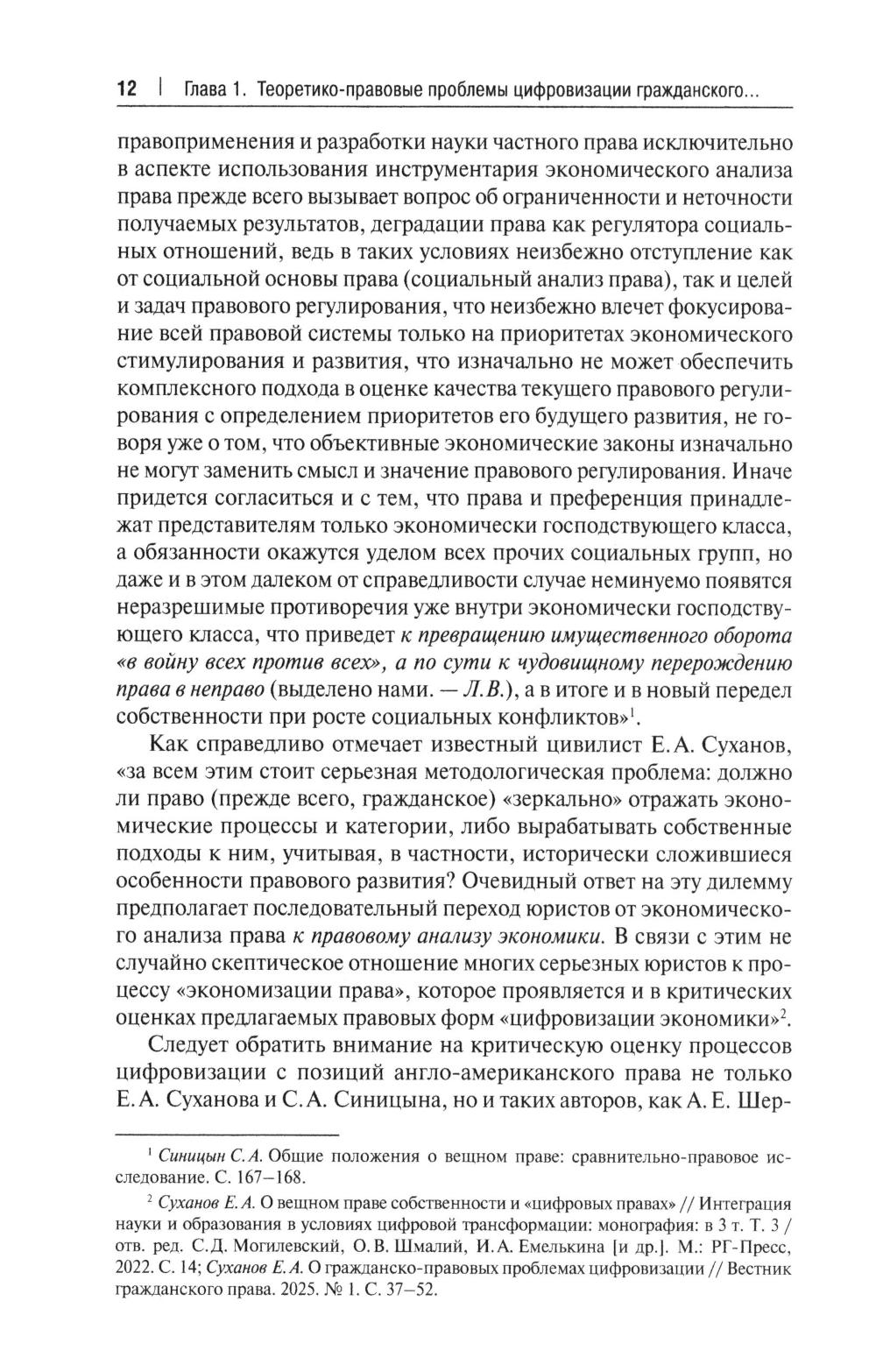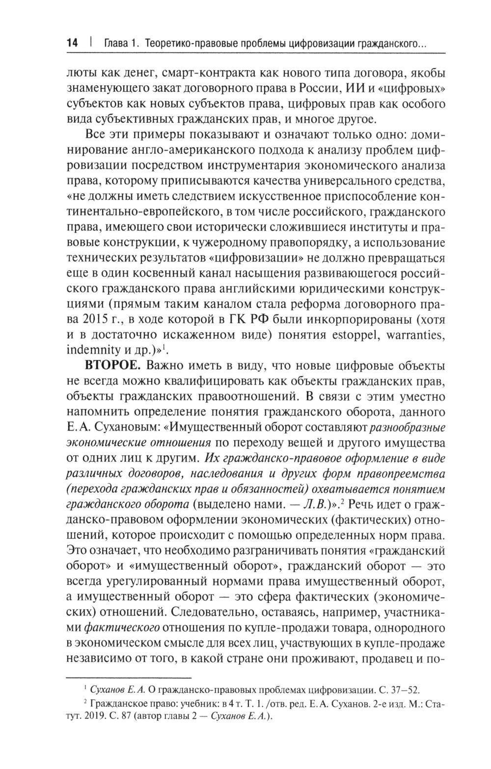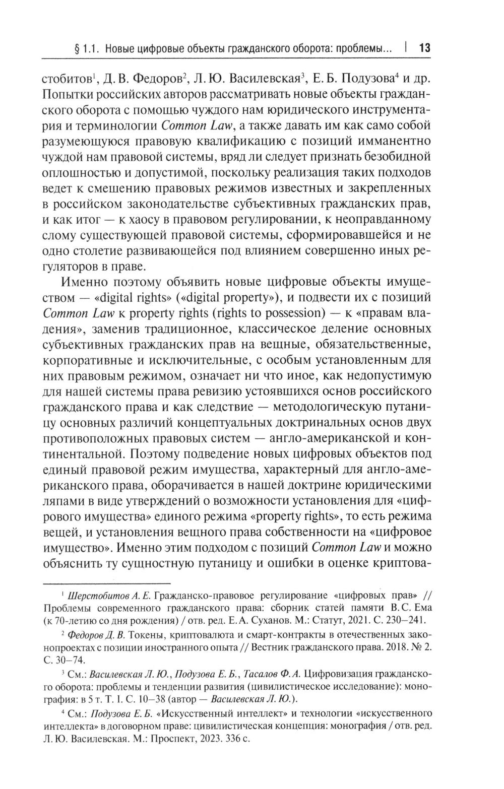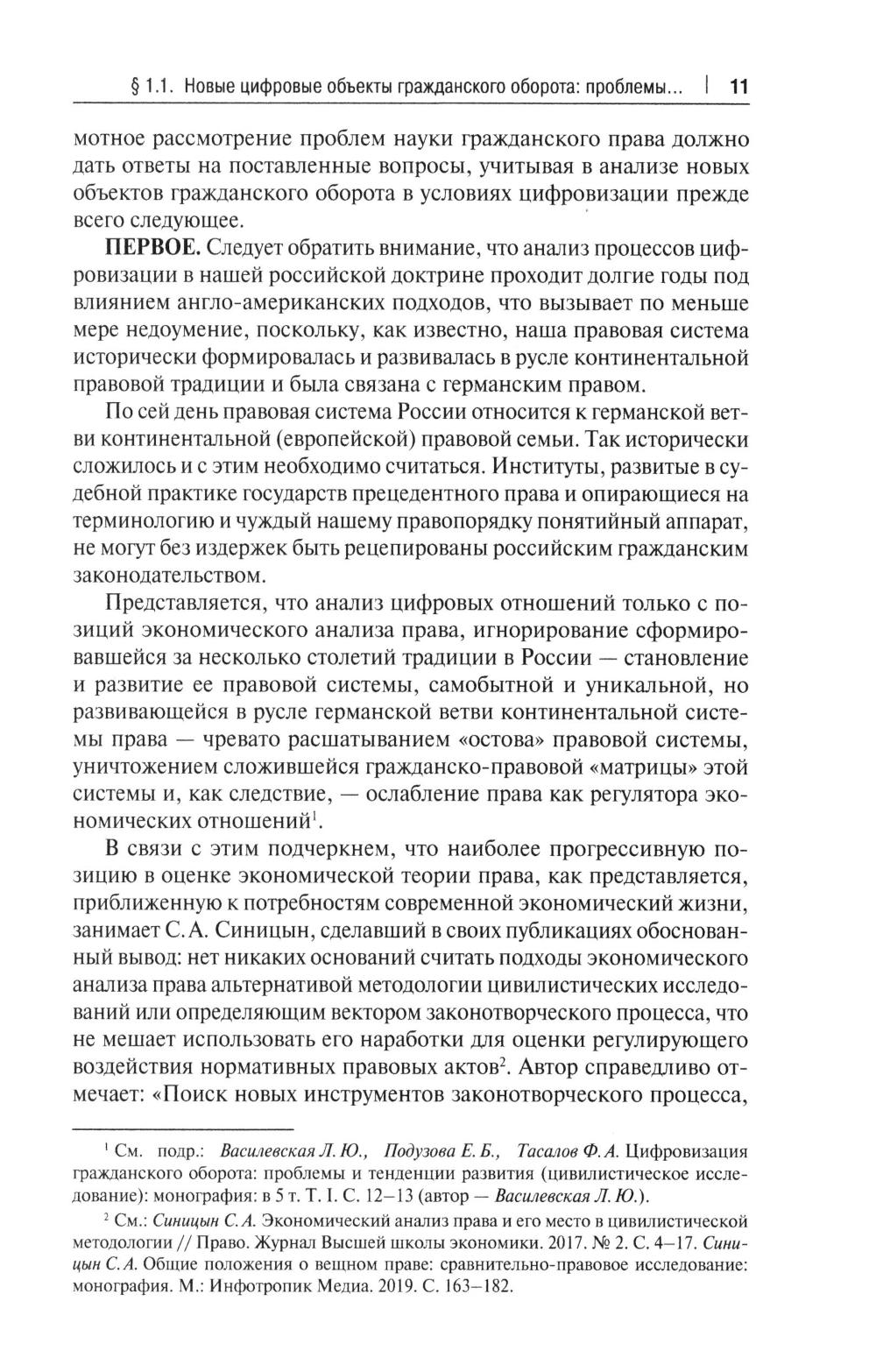 Представленная монография посвящена наиболее актуальным и востребованным на практике нерешенным проблемам гражданского оборота в условиях цифровизации и предназначена для изучения вопросов гражданско-правового регулирования отношений цифровизации гражданского оборота. В работе дана юридическая характеристика цифровых объектов и сделок, совершаемых при помощи электронных и иных технических средств, смарт-контрактов, отношений с использованием инновационных цифровых платформ. Выявлена специфика договорного оформления изучаемых отношений и их нормативной регламентации, проанализированы актуальные проблемы правового регулирования отношений в наиболее востребованных сферах. Установлены недостатки в законодательной регламентации рассматриваемых отношений, сделаны предложения по их решению. Позиция авторов обоснована с учетом актуальных направлений развития гражданского законодательства и современных подходов в правоприменительной практике к разрешению соответствующих споров. Это позволяет использовать данную монографию руководителям правовых департаментов, подразделений, обеспечивающих информационную безопасность юридических лиц и органов государственной власти, представителям правоохранительных органов, адвокатуры, нотариата и судейского сообщества, иным правоприменителям для обоснования принимаемых решений. В книге подробно рассмотрены практические проблемы, связанные с использованием цифровых технологий в различных сферах деятельности, что представляет интерес для бизнес-сообщества, в частности компаний, работающих в сфере маркетинга в социальных сетях (SMM), а также для практикующих юристов, специализирующихся на правовом сопровождении передачи, обработки и хранения цифровой информации. Материал монографии базируется на комплексном анализе большого количества источников. Работа будет полезна для обучающихся высших учебных заведений уровней бакалавриата, магистратуры, специалитета и преподавателей юридических дисциплин. Критический анализ современных доктринальных и практических подходов к регламентации отношений в условиях цифровизации выступает хорошей основой для подробного изучения рассматриваемой проблематики в ходе обучения по юридическим, экономическим и информационным образовательным профилям. Законодательство приведено по состоянию на 15 августа 2025 г.