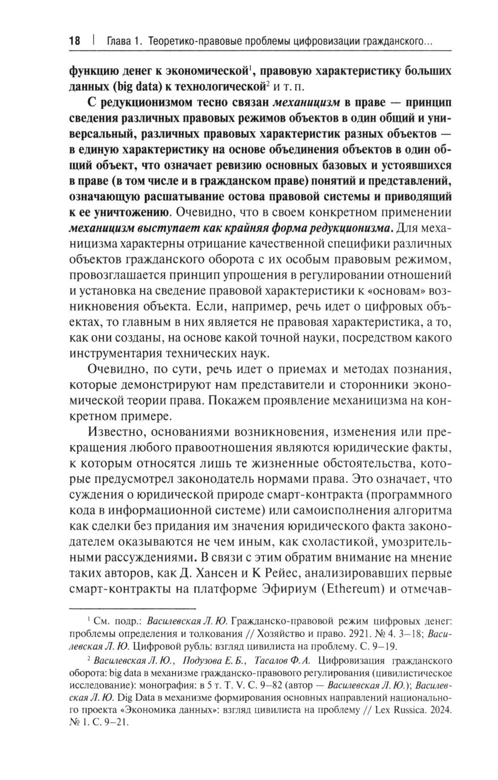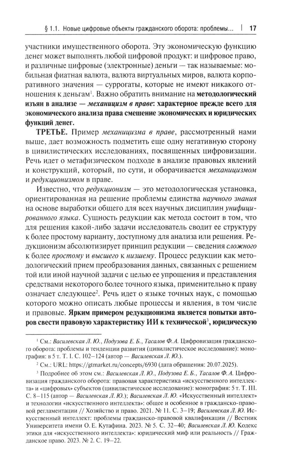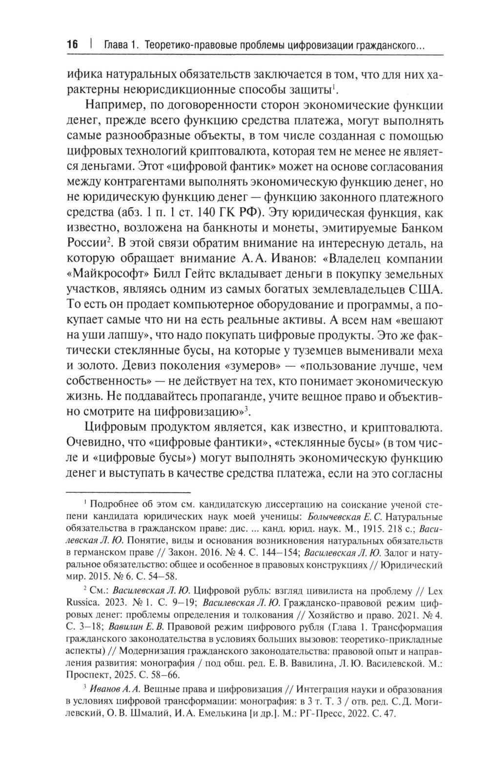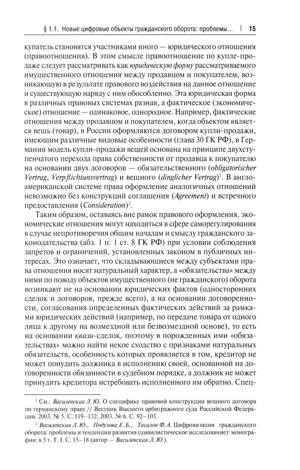 Представленная монография посвящена наиболее актуальным и востребованным на практике нерешенным проблемам гражданского оборота в условиях цифровизации и предназначена для изучения вопросов гражданско-правового регулирования отношений цифровизации гражданского оборота. В работе дана юридическая характеристика цифровых объектов и сделок, совершаемых при помощи электронных и иных технических средств, смарт-контрактов, отношений с использованием инновационных цифровых платформ. Выявлена специфика договорного оформления изучаемых отношений и их нормативной регламентации, проанализированы актуальные проблемы правового регулирования отношений в наиболее востребованных сферах. Установлены недостатки в законодательной регламентации рассматриваемых отношений, сделаны предложения по их решению. Позиция авторов обоснована с учетом актуальных направлений развития гражданского законодательства и современных подходов в правоприменительной практике к разрешению соответствующих споров. Это позволяет использовать данную монографию руководителям правовых департаментов, подразделений, обеспечивающих информационную безопасность юридических лиц и органов государственной власти, представителям правоохранительных органов, адвокатуры, нотариата и судейского сообщества, иным правоприменителям для обоснования принимаемых решений. В книге подробно рассмотрены практические проблемы, связанные с использованием цифровых технологий в различных сферах деятельности, что представляет интерес для бизнес-сообщества, в частности компаний, работающих в сфере маркетинга в социальных сетях (SMM), а также для практикующих юристов, специализирующихся на правовом сопровождении передачи, обработки и хранения цифровой информации. Материал монографии базируется на комплексном анализе большого количества источников. Работа будет полезна для обучающихся высших учебных заведений уровней бакалавриата, магистратуры, специалитета и преподавателей юридических дисциплин. Критический анализ современных доктринальных и практических подходов к регламентации отношений в условиях цифровизации выступает хорошей основой для подробного изучения рассматриваемой проблематики в ходе обучения по юридическим, экономическим и информационным образовательным профилям. Законодательство приведено по состоянию на 15 августа 2025 г.
