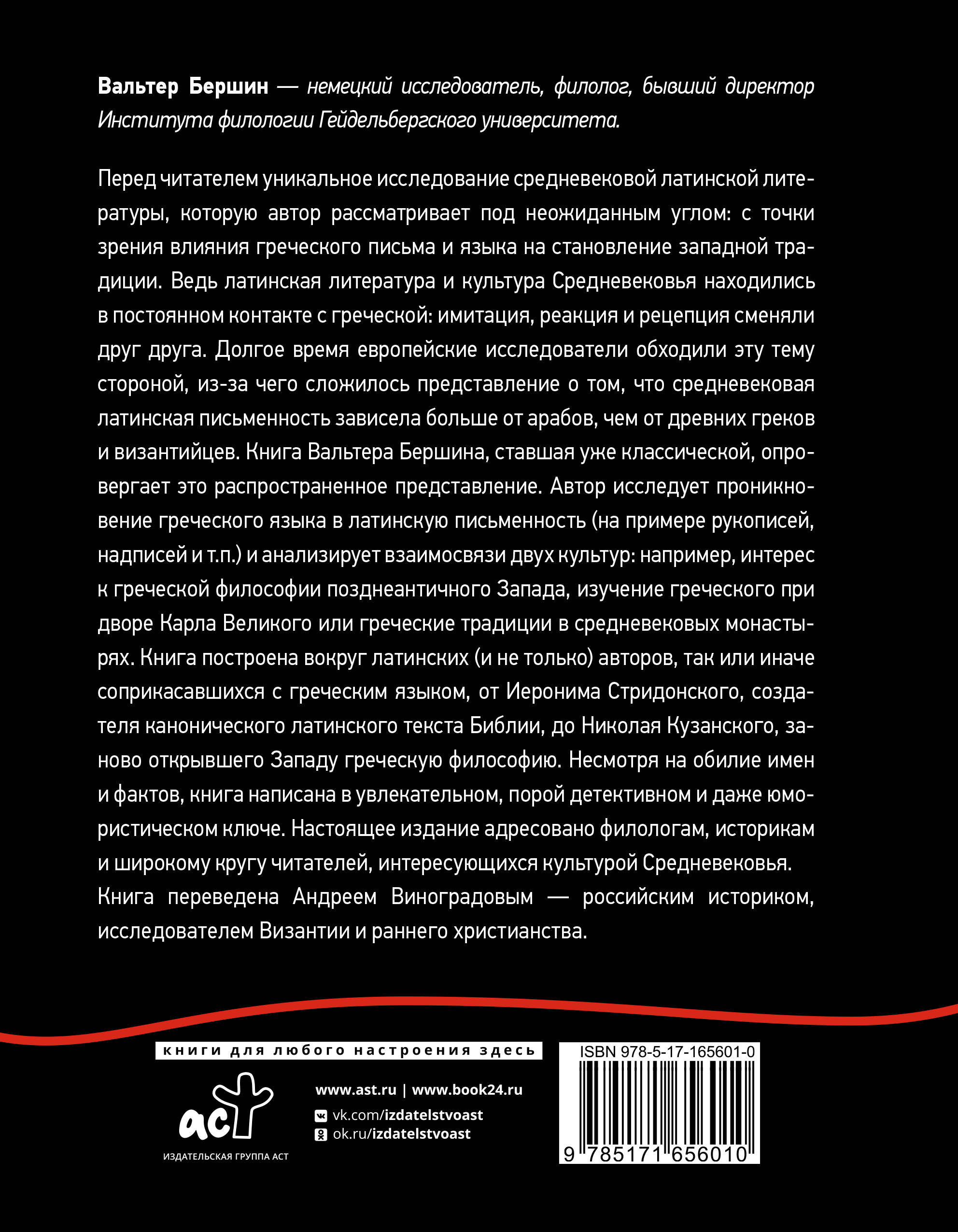 Вальтер Бершин - немецкий исследователь, филолог, бывший директор Института филологии Гейдельбергского университета. Перед читателем уникальное исследование средневековой латинской литературы, которую автор рассматривает под неожиданным углом: с точки зрения влияния греческого письма и языка на становление западной традиции. Ведь латинская литература и культура Средневековья находились в постоянном контакте с греческой: имитация, реакция и рецепция сменяли друг друга. Долгое время европейские исследователи обходили эту тему стороной, из-за чего сложилось представление о том, что средневековая латинская письменность зависела больше от арабов, чем от древних греков и византийцев. Книга Вальтера Бершина, ставшая уже классической, опровергает это распространенное представление. Автор исследует проникновение греческого языка в латинскую письменность (на примере рукописей, надписей и т.п.) и анализирует взаимосвязи двух культур: например, интерес к греческой философии позднеантичного Запада, изучение греческого при дворе Карла Великого или греческие традиции в средневековых монастырях. Книга построена вокруг латинских (и не только) авторов, так или иначе соприкасавшихся с греческим языком, от Иеронима Стридонского, создателя канонического латинского текста Библии, до Нико лая Кузанского, заново открывшего Западу греческую философию. Несмотря на обилие имен и фактов, книга написана в увлекательном, порой детективном и даже юмористическом ключе. Настоящее издание адресовано филологам, историкам и широкому кругу читателей, интересующихся культурой Средневековья. Книга переведена Андреем Виноградовым - российским историком, исследователем Византии и раннего христианства.| Издательство | Издательство "АСТ" |
