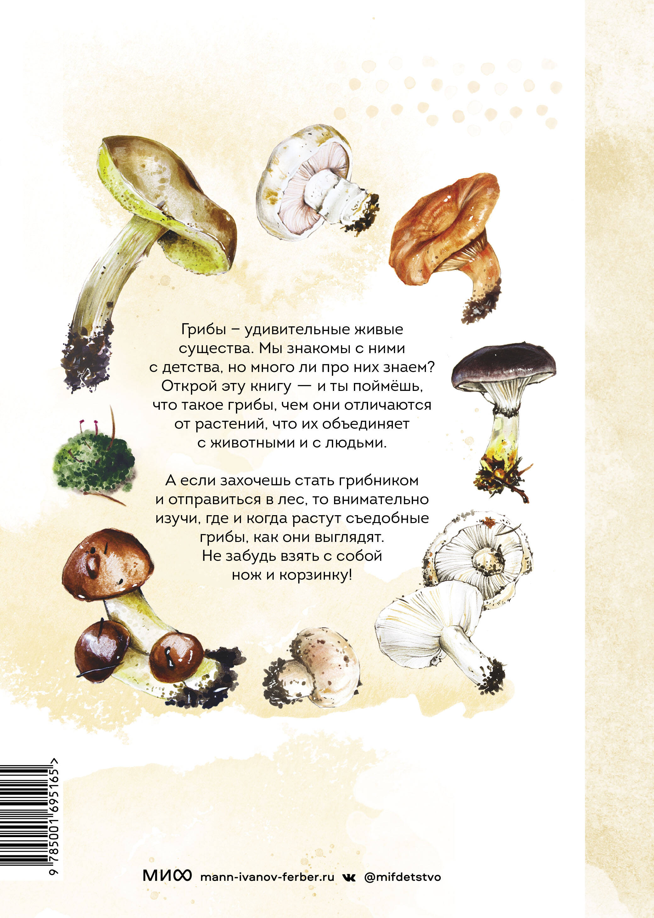 Вроде бы все знают, что такое грибы. Но как только мы попытаемся найти общее между подосиновиком и плесенью, сразу же возникнут трудности. Эта книга поможет разобраться в этом сложном вопросе даже маленьким детям. В книге рассказывается все, что нужно знать о грибах в целом: что это такое, какими они бывают, откуда произошли, какую роль играют в современной экосистеме, какие животные ими питаются, и в частности: какие грибы самые популярные в средней полосе России, как их определить, как собирать и как заготавливать. А еще в этой книге есть удивительные факты и мифы о грибах: придает ли мухомор богатырскую силу? Правда ли, что гриб самый большой живой организм на планете? Можно ли из грибов изготовить чернила? Как читать эту книгу: В книге есть общие сведения о грибах (что это такое, какие бывают виды, как грибы произошли), а есть часть, в которой основные грибы средней полосы России наглядно показаны и рассказаны правила сбора и заготовки грибов. Несмотря на то, что в книге грибы изображены очень реалистично, в свой первый поход в лес обязательно возьми взрослого опытного грибника. Фишки книги: Интересные факты о грибах. Например: Что такое грибные или ведьмины кольца? Существуют ли НАДосиновики и все ли подосиновики растут под осинами? Поможет стать опытным грибником и расскажет, как и где можно собрать богатый грибной урожай. Вариант интересного времяпрепровождения в лесу для всей семьи. Берите книгу с собой и открывайте мир грибов. От Михаила Вишневского - главного специалиста по грибам в России. Родители-грибники тоже будут в восторге. Внимание! Когда читаешь эту книгу, очень хочется кушать! Для кого эта книга: Для любознательных детей в возрасте от 5 лет и их родителей.
