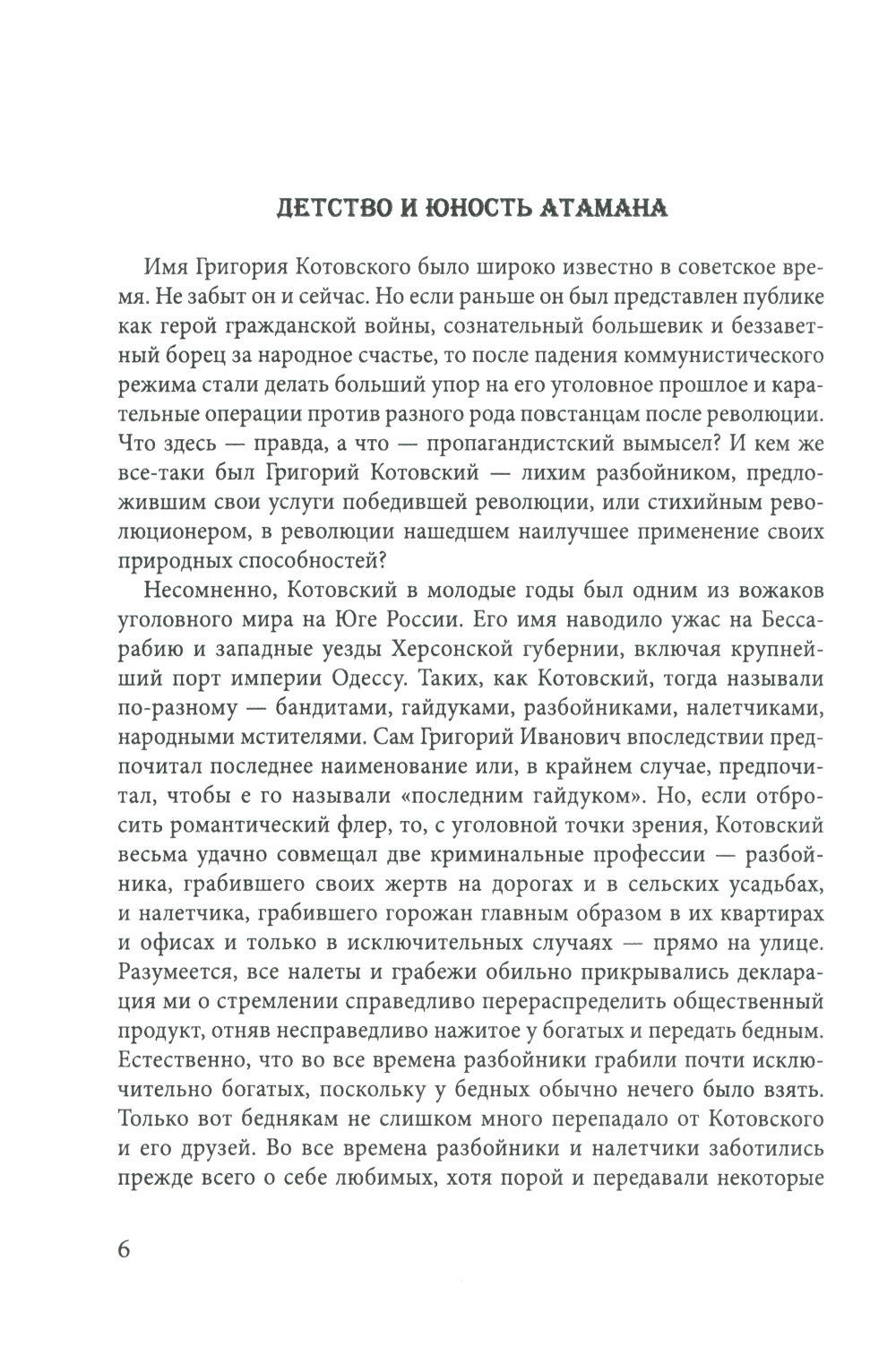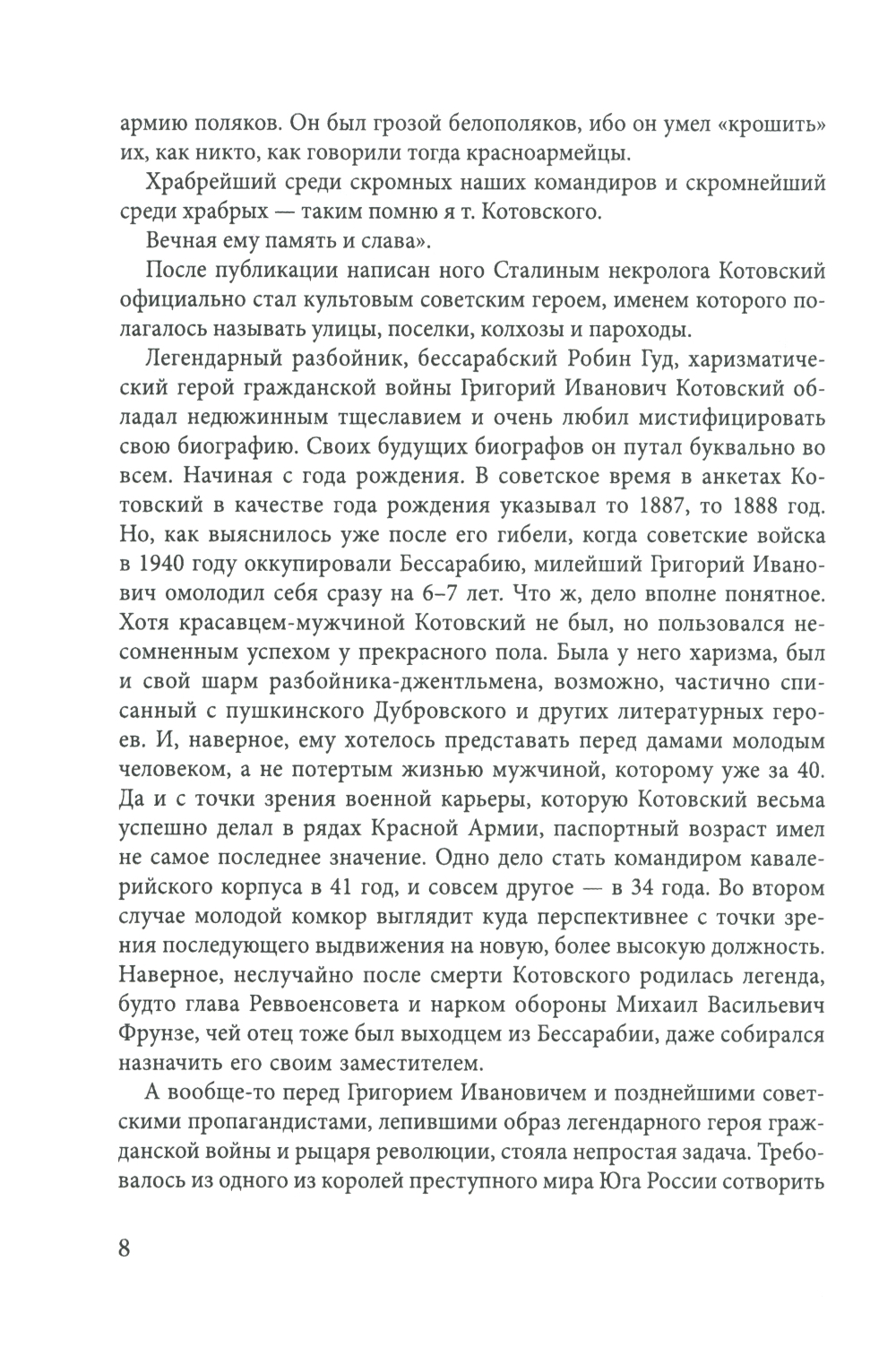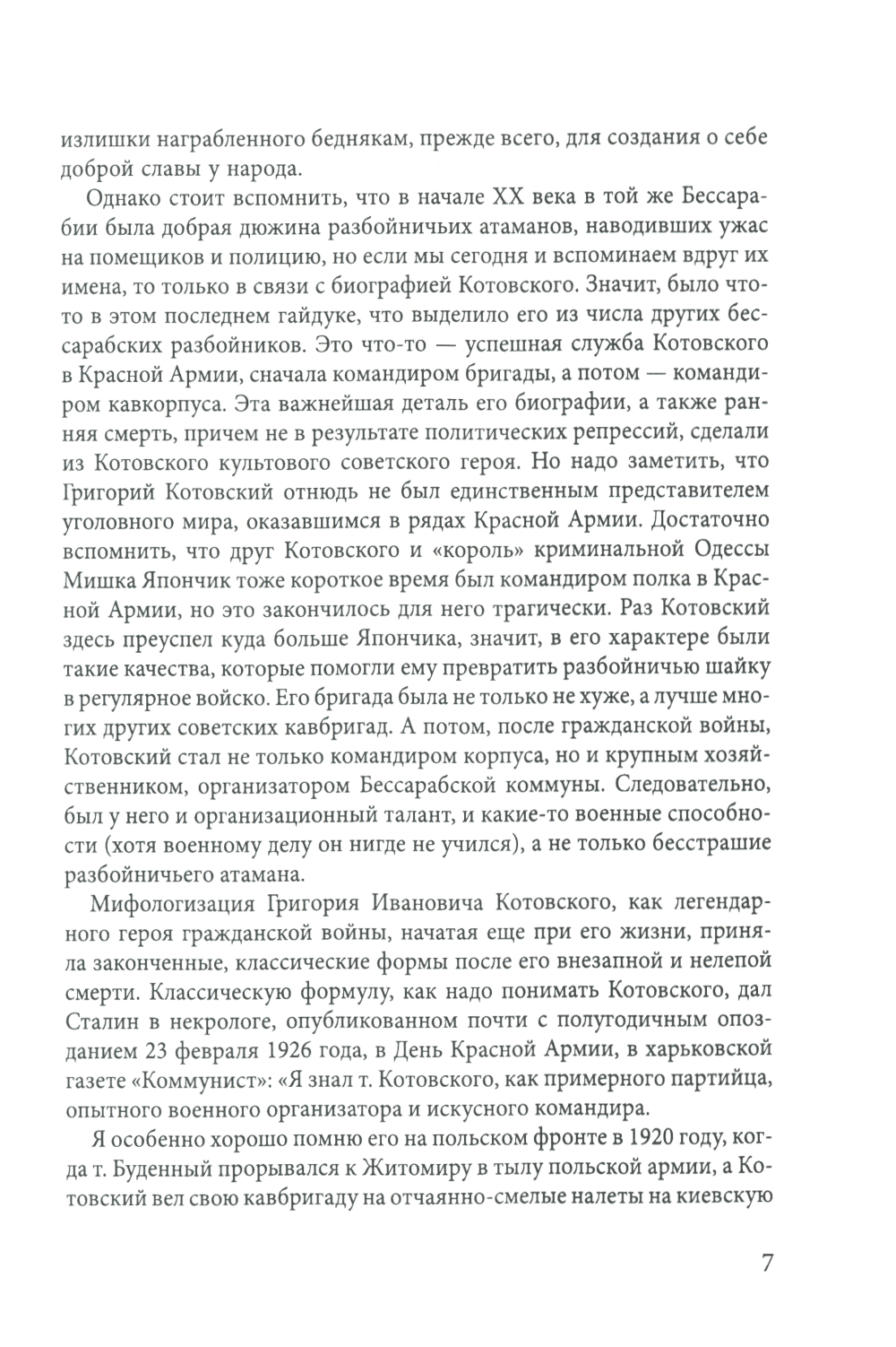 Григорий Иванович Котовский был легендой, как при царской, так и при советской власти. В Российской империи - один из признанных лидеров преступного мира, которого в Бессарабии называли «местным Робин Гудом» и «атаманом Ада». После 1917 года - легендарный командир Красной Армии и народный герой Гражданской войны, член Реввоенсовета СССР, а так же один из руководителей Украинского, Молдавского и Союзного Центрального Исполнительного Комитета. Историк Борис Соколов показывает, что из многочисленных мифов, которыми обросло имя Григория Котовского, соответствует действительности, а что имеет с ними мало общего. Автор подробно рассказывает о таких известных эпизодах биографии главного героя данной книги как участие в занятии Одессы зимой 1920 года и о борьбе с Антоновским восстанием в Тамбовской губернии летом 1921 года. Объясняются причины его популярности, сделана попытка раскрыть мотивы его загадочного убийство. Прослеживается также отражение образа Котовского в романе Виктора Пелевина «Чапаев и Пустота» и в кинематографе. Биография Котовского дана на фоне истории России первой четверти XX века, в том числе и т. н. «Бессарабского вопроса»