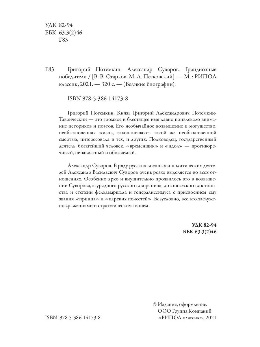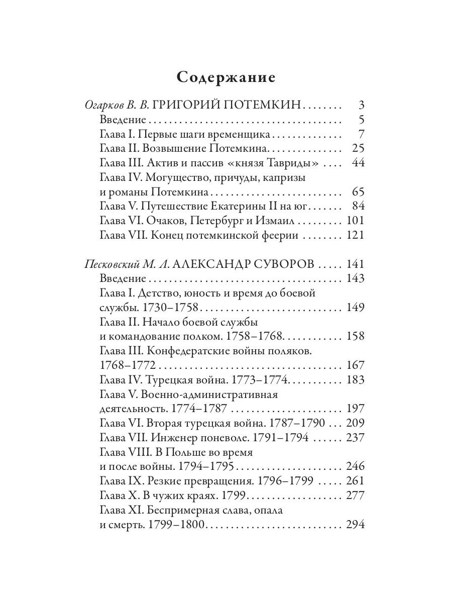 Григорий Потемкин. Князь Григорий Александрович Потемкин-Таврический - это громкое и блестящее имя давно привлекало внимание историков и поэтов. Его необычайное возвышение и могущество, необыкновенная жизнь, закончившаяся такой же необыкновенной смертью, интересовала и тех, и других. Полководец, государственный деятель, богатейший человек, «временщик» и «идол» - противоречивый, ненавистный и обожаемый. Александр Суворов. В ряду русских военных и политических деятелей Александр Васильевич Суворов очень резко выделяется во всех отношениях. Особенно ярко и внушительно проявилось это в возвышении Суворова, заурядного русского дворянина, до княжеского достоинства и степени фельдмаршала и генералиссимуса с присвоением ему звания «принца» и «царских почестей». Безусловно, все это заслужено сражениями и стратегическим гением.| Издательство | Рипол Классик |