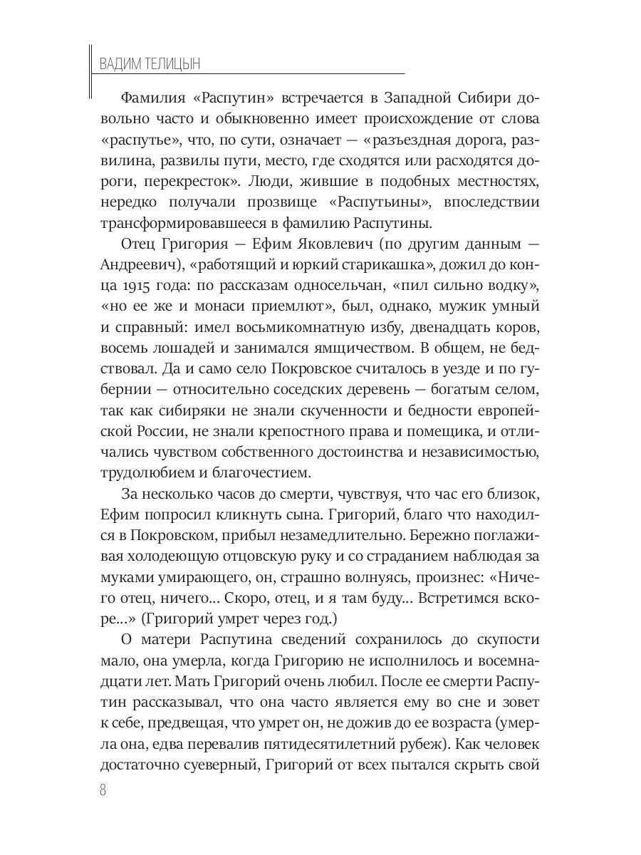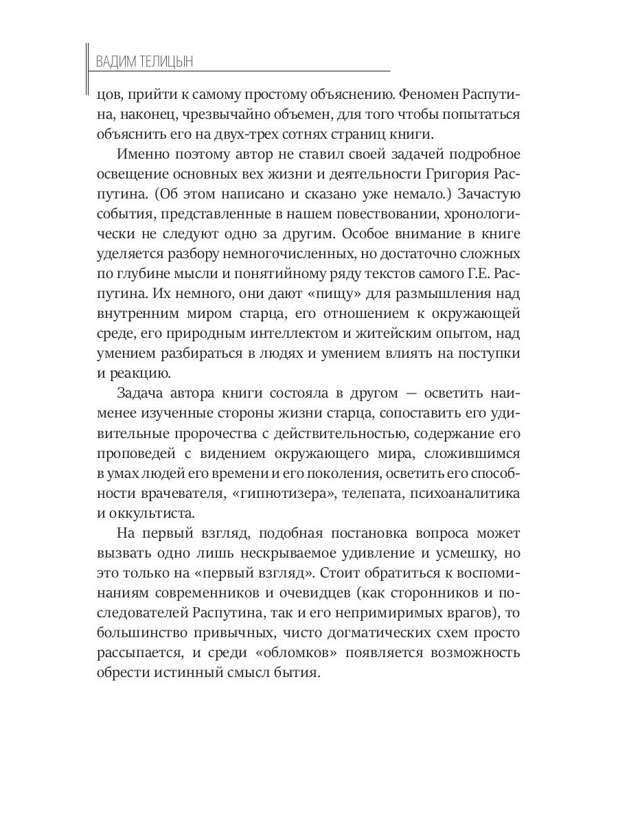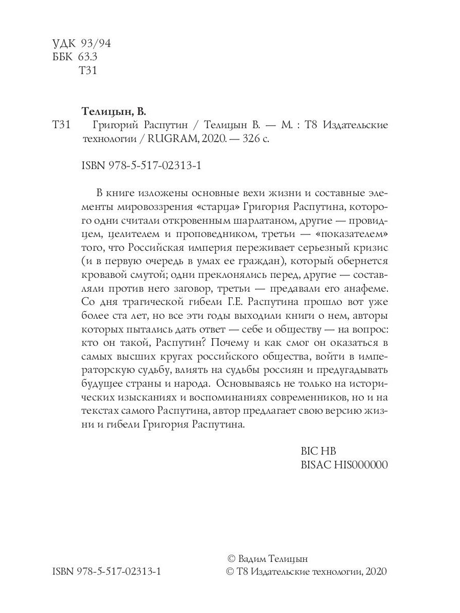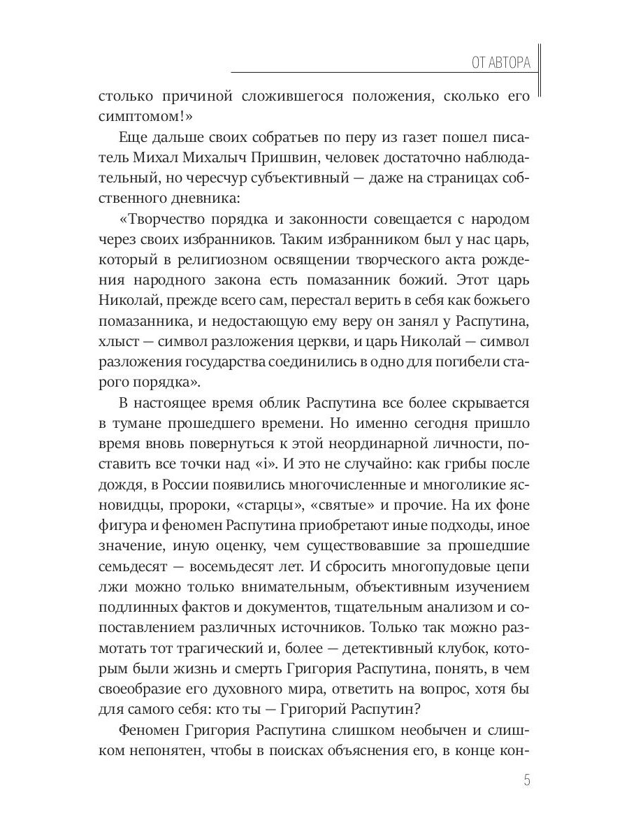 В книге изложены основные вехи жизни и составные элементы мировоззрения «старца» Григория Распутина, которого одни считали откровенным шарлатаном, другие - провидцем, целителем и проповедником, третьи - «показателем» того, что Российская империя переживает серьезный кризис (и в первую очередь в умах ее граждан), который обернется кровавой смутой; одни преклонялись перед, другие - составляли против него заговор, третьи - предавали его анафеме. Со дня трагической гибели Г.Е. Распутина прошло вот уже более ста лет, но все эти годы выходили книги о нем, авторы которых пытались дать ответ - себе и обществу - на вопрос: кто он такой, Распутин? Почему и как смог он оказаться в самых высших кругах российского общества, войти в императорскую судьбу, влиять на судьбы россиян и предугадывать будущее страны и народа. Основываясь не только на исторических изысканиях и воспоминаниях современников, но и на текстах самого Распутина, автор предлагает свою версию жизни и гибели Григория Распутина.| Издательство | Т8 RUGRAM |