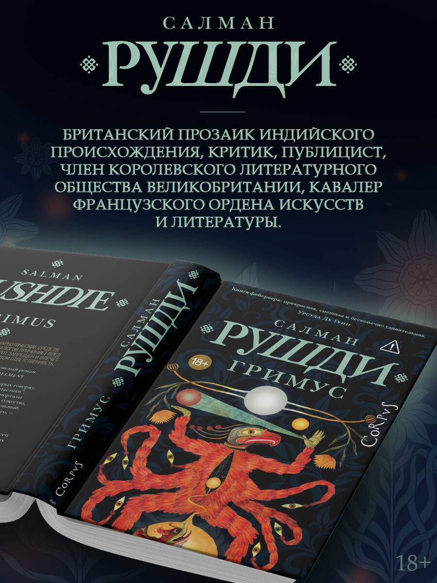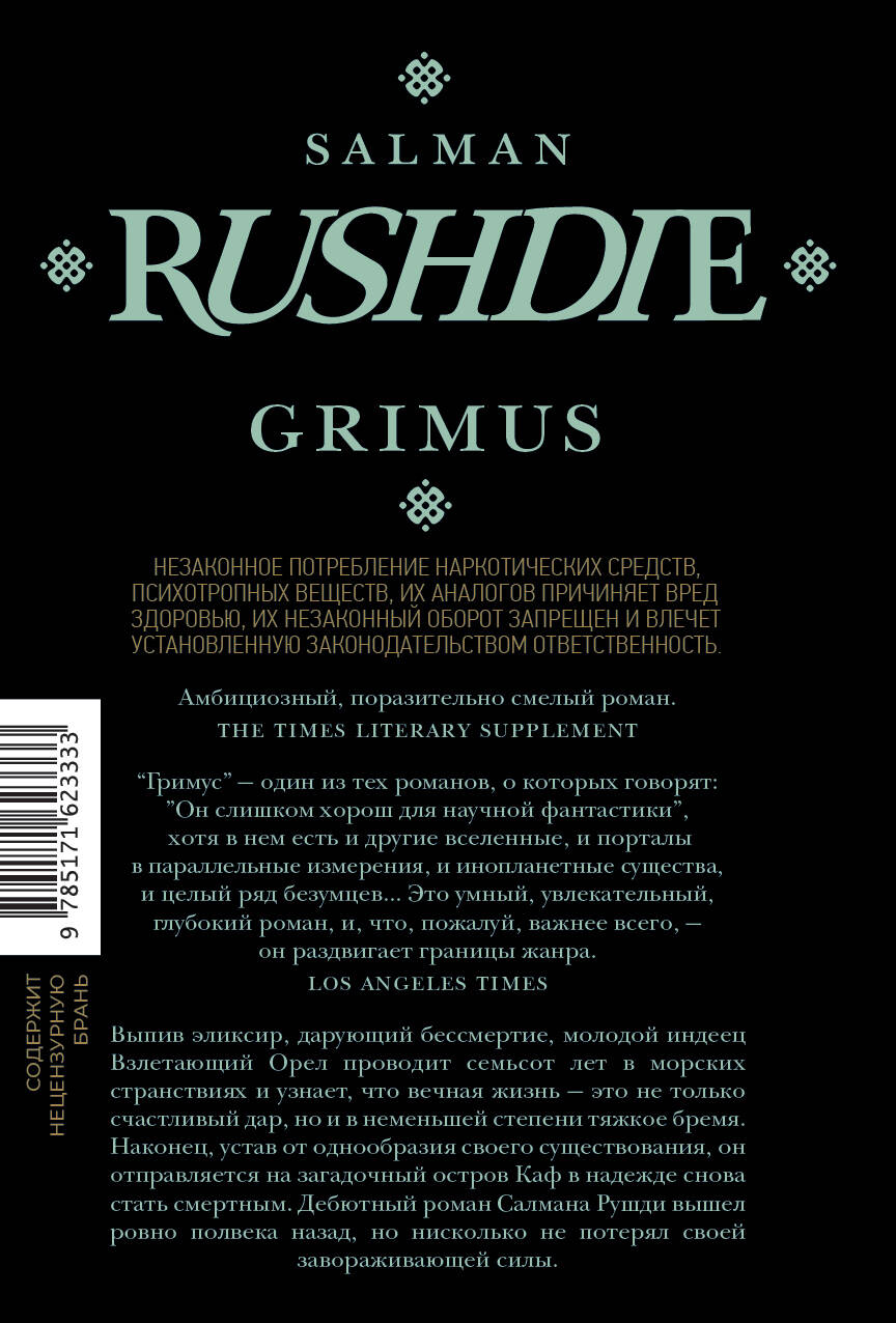 - Дебютный роман знаменитого Салмана Рушди. - «Гримус» был опубликован ровно полвека назад, но ничуть не утратил своей притягательности и новизны. Смелый литературный эксперимент во многом предопределил весь дальнейший творческий путь писателя. - В книге автор не только мастерски сочетает разные жанры, но и смешивает элементы индийской, американской, суфийской и других мировых культур, расширяя наши представления о современной интеллектуальной прозе. - Главный герой романа - молодой индеец, который выпивает эликсир бессмертия. Многие годы он скитается по миру, прежде чем оказаться на загадочном острове, где живут такие же бессмертные, как и он сам. - Философский роман об идентичности, поиске собственного предназначения и природе реальности, который понравится как поклонникам Рушди, так и тем, кто только хочется познакомиться с творчеством культового автора. - Салман Рушди - один из самых титулованных и известных современных писателей. В 1981 году он получил Букеровскую премию за роман «Дети полуночи» и за эту же книгу дважды был отмечен «Букером Букеров».| Издательство | Издательство "АСТ" |