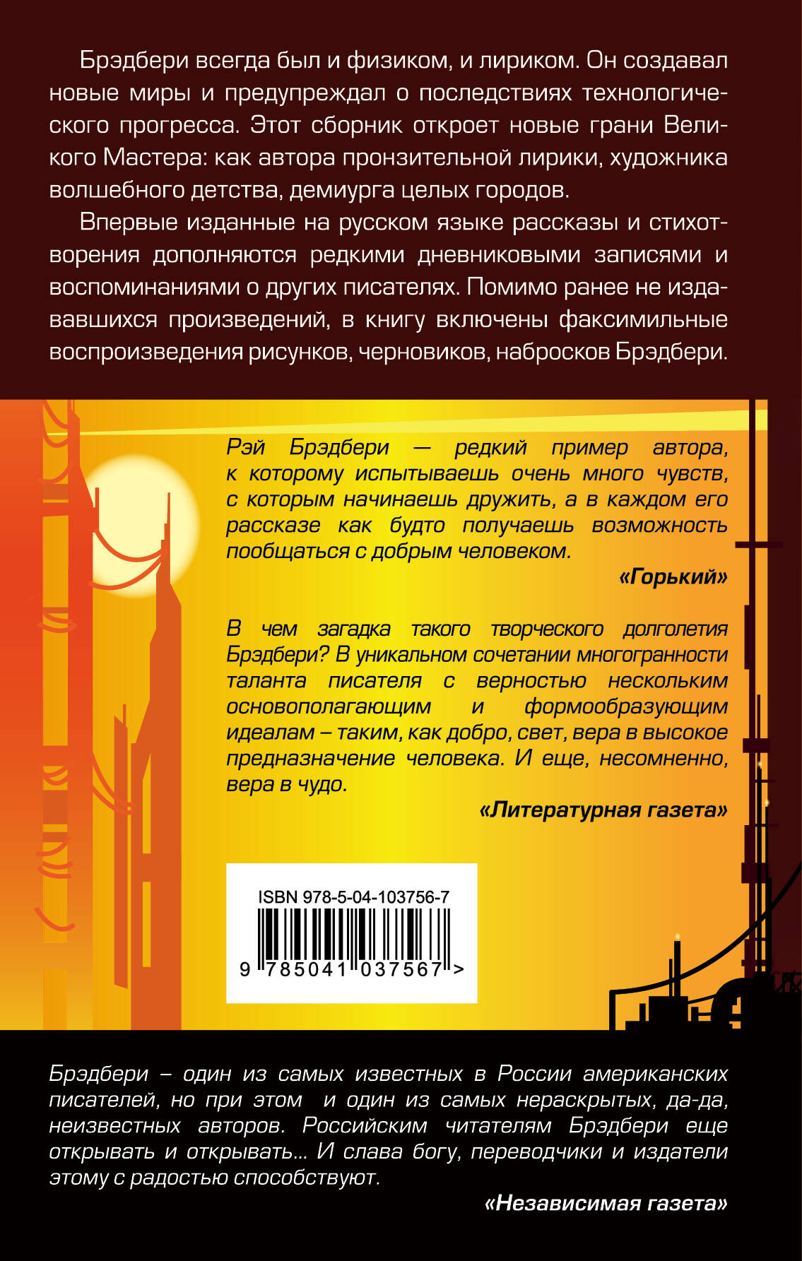 Книги Рэя Брэдбери не вписываются в прокрустово ложе ни одного жанра. Многогранный, разносторонний, Брэдбери всегда был и физиком, и лириком. Он создавал новые миры и предупреждал о последствиях технологического прогресса. Этот сборник откроет новые грани Великого Мастера: как автора пронзительной лирики, художника волшебного детства, демиурга целых городов. Впервые изданные на русском рассказы и стихотворения дополняются редкими дневниковыми записями и воспоминаниями о других писателях. Помимо ранее не издававшихся произведений в книгу включены факсимильные воспроизведения рисунков, черновиков, набросков Брэдбери. «Брэдбери - один из самых известных в России американских писателей, но при этом и один из самых нераскрытых - да-да - неизвестных авторов. Российским читателям Брэдбери еще открывать и открывать… И слава богу, переводчики и издатели этому с радостью способствуют». - «Независимая газета» «Рэй Брэдбери - редкий пример автора, к которому испытываешь очень много чувств, с которым начинаешь дружить, а в каждом его рассказе как будто получаешь возможность пообщаться с добрым человеком». - Горький «В чем загадка такого творческого долголетия Брэдбери? В уникальном сочетании многогранности таланта писателя с верностью нескольким основополагающим и формообразующим идеалам - таким, как добро, свет, вера в высокое предназначение человека. И еще, несомненно, вера в чудо». - «Литературная газета»| Издательство | ООО "Издательство "Эксмо" |
