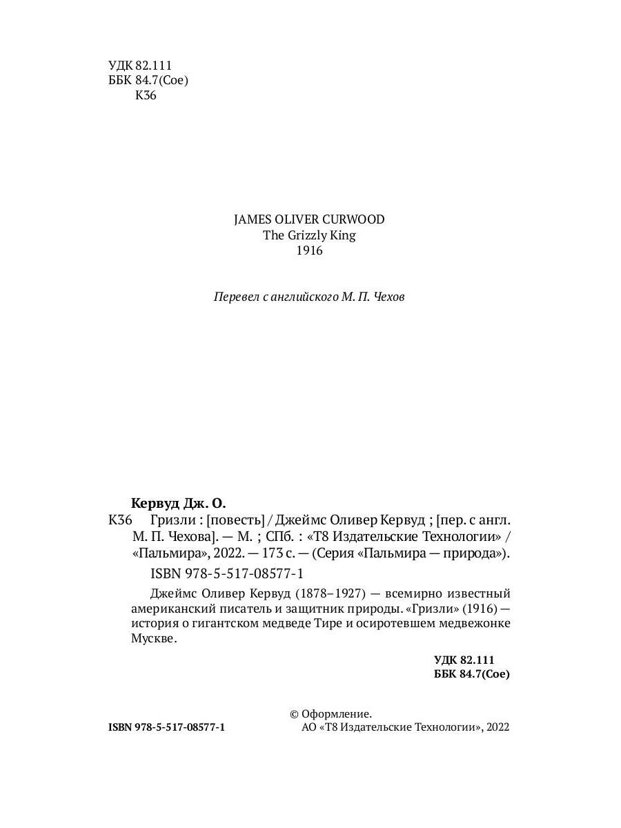 Джеймс Оливер Кервуд (1878-1927) - прозаик, защитник окружающей среды, классик американской приключенческой литературы. Страстный охотник, натуралист и путешественник, Кервуд хорошо знал и любил суровые края Северной Канады и Аляски. В течение своей короткой жизни он написал более 30 романов. Его книги продолжают лучшие традиции европейско-американской приключенческой литературы о Севере. Темы, сюжеты и персонажи произведений Кервуда ведут свое происхождение из глухих районов, в странствиях по которым автор провел значительную часть жизни. На севере Канады, в суровом и безлюдном краю, осиротевший медвежонок Мусква встречает огромного раненого медведя Тира. Их ждут невероятные приключения и открытия, но трогательная дружба поможет преодолеть все опасности. Увлекательный роман Дж. О. Кервуда "Гризли" (1916) повествует о том, как побеждают доброта, верность и мужество.| Издательство | Т8 RUGRAM |