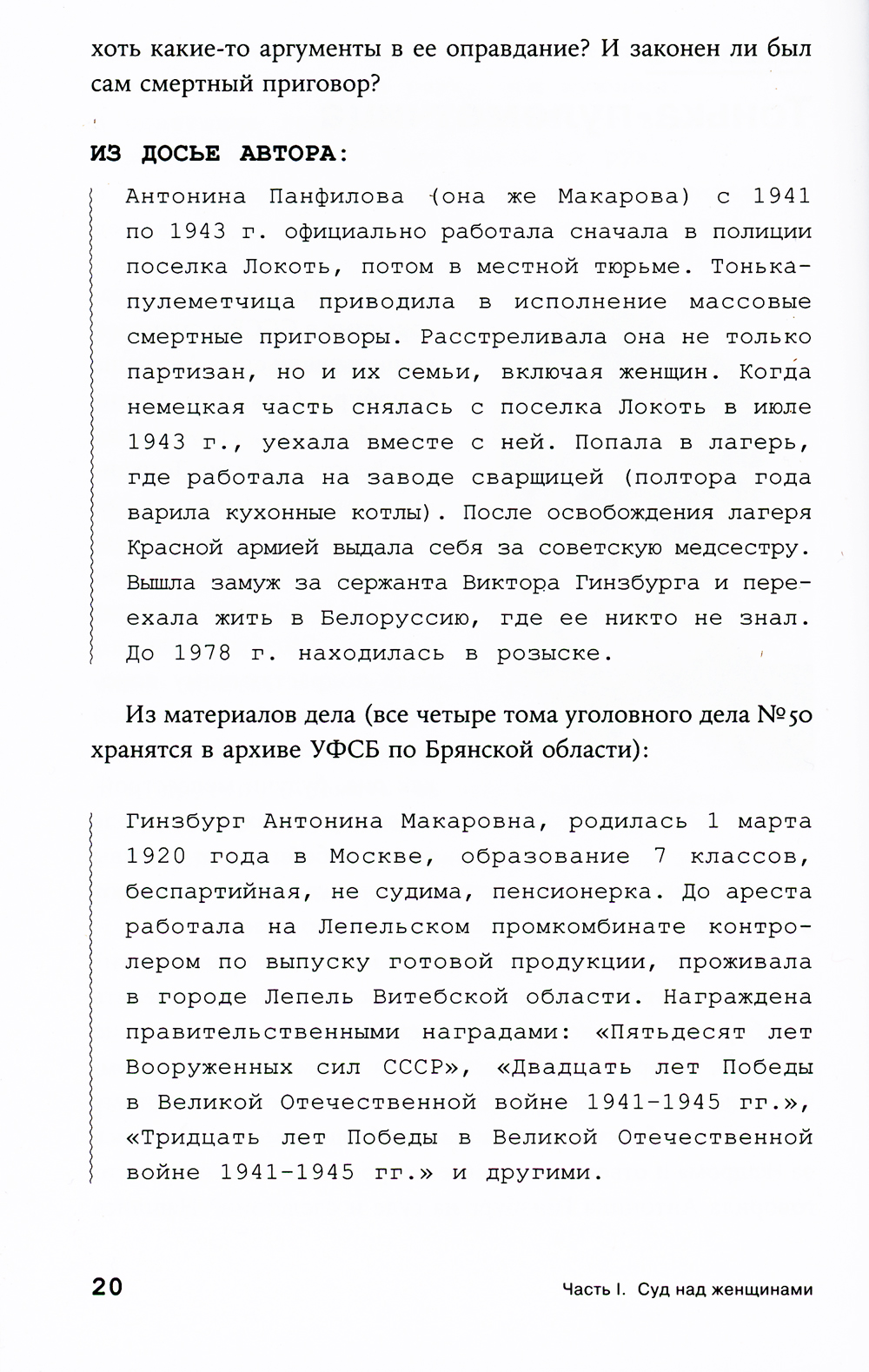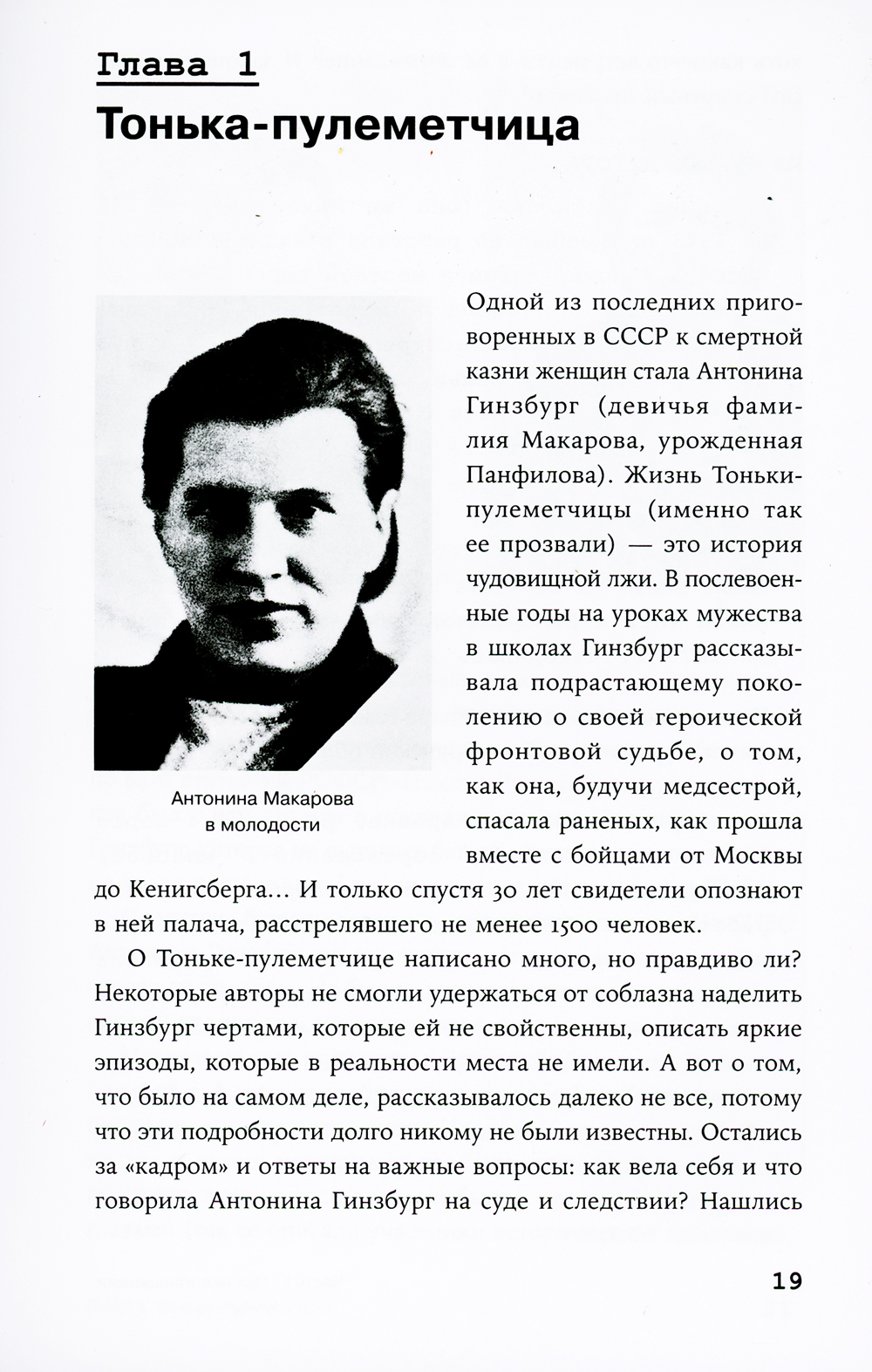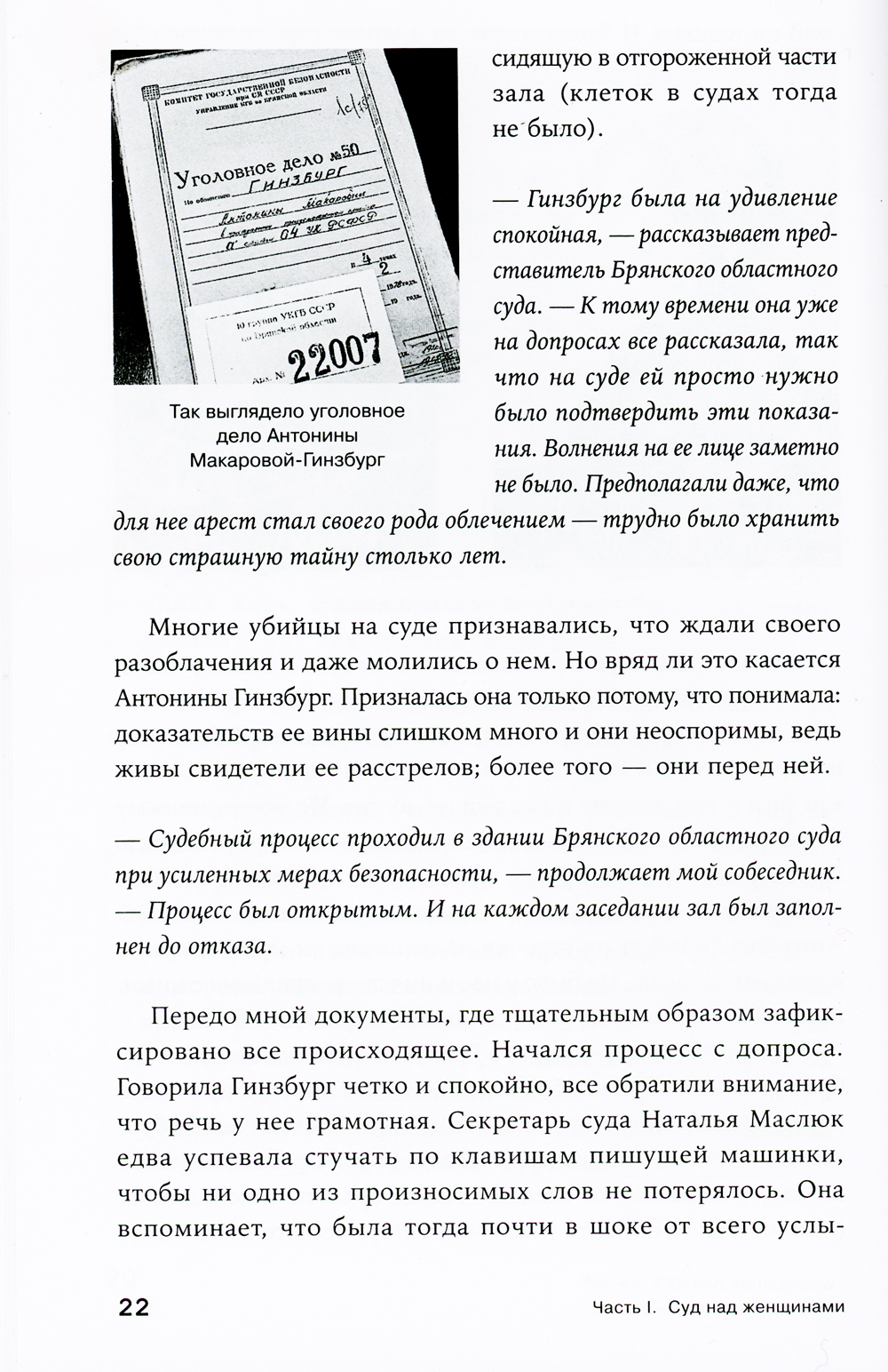 Книга о самых громких уголовных делах советской эпохи. Многие материалы ранее не публиковались и были впервые выданы из архивов лично автору. Благодаря доступу к этим документам и общению с очевидцами Еве Меркачёвой удалось восстановить картины судебных процессов над последним казненным в СССР - маньяком Фишером, над единственным расстрелянным в советское время ребенком Аркадием Нейландом, над палачом Антониной Макаровой по прозвищу Тонька-пулеметчица, над Бертой Бородкиной, накрывавшей столы самому Леониду Брежневу - единственной приговоренной к высшей мере по экономической статье. Перекинуть мостик в прошлое не только интересно и познавательно, но и полезно для осознания тех процессов, что происходят в судебной практике сегодня. К каждой главе прилагаются архивные иллюстрации из уголовных дел и материалов судов - они дают читателю возможность погрузиться в атмосферу описываемых событий и своими глазами увидеть подлинные протоколы допросов, рукописные приговоры, справки об исполнении смертной казни и то, как выглядели тома дел, жертвы, преступники и места преступлений. Завершает книгу единственное досоветское дело «царицы воровского мира» Соньки Золотой Ручки, с которого начался интерес автора к теме судебных расследований.| Издательство | Альпина Паблишер |