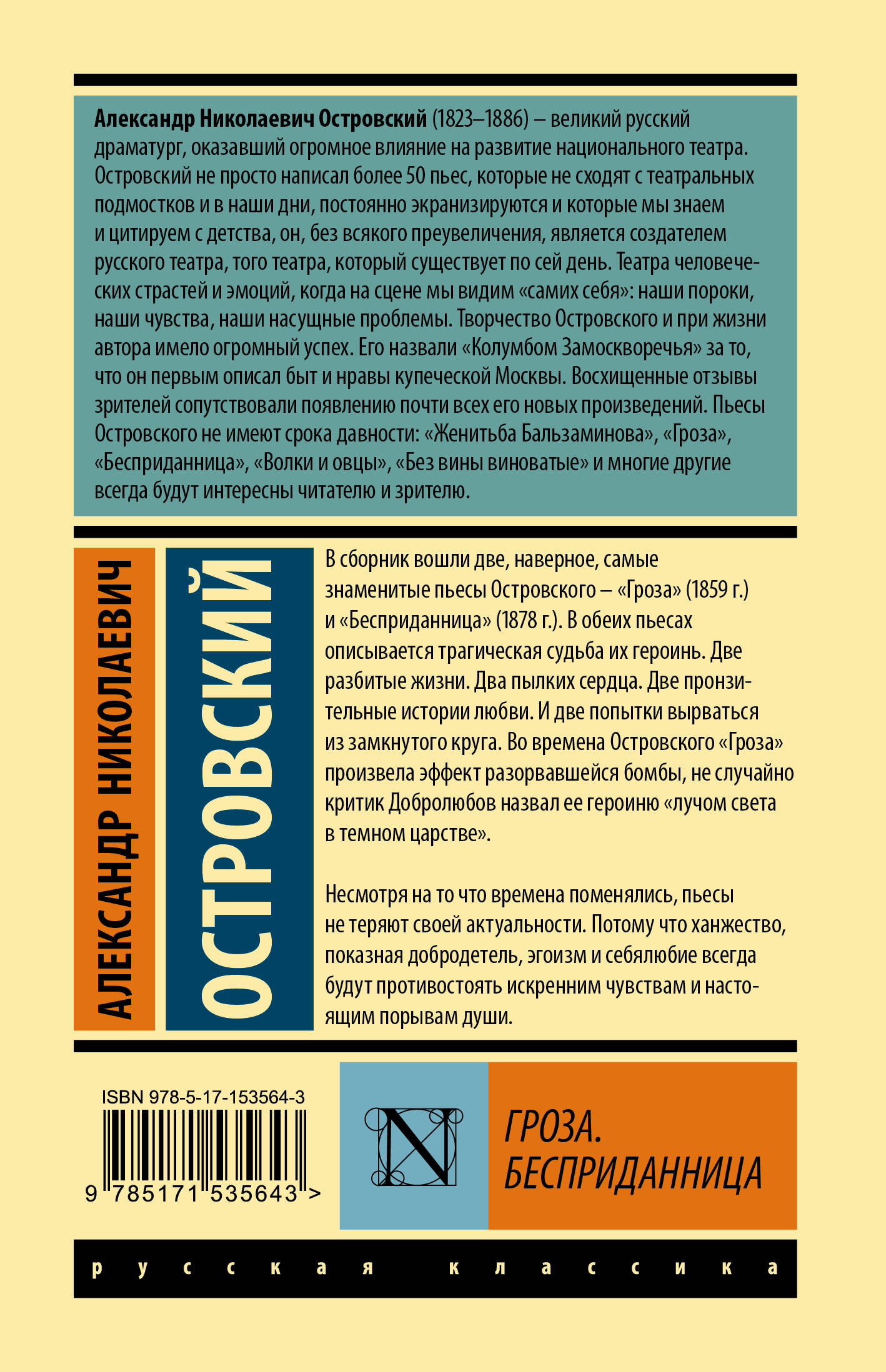 В сборник вошли две, наверное, самые знаменитые пьесы Островского - "Гроза" (1859 г.) и "Бесприданница" (1878 г.). В обеих пьесах описывается трагическая судьба их героинь. Две разбитые жизни. Два пылких сердца. Две пронзительные истории любви. И две попытки вырваться из замкнутого круга. Во времена Островского "Гроза" произвела эффект разорвавшейся бомбы, не случайно критик Добролюбов назвал ее героиню "лучом света в темном царстве". Несмотря на то, что времена поменялись, пьесы не теряют своей актуальности. Потому что ханжество, показная добродетель, эгоизм и себялюбие всегда будут противостоять искренним чувствам и настоящим порывам души.| Издательство | ИЗДАТЕЛЬСТВО "АСТ" |