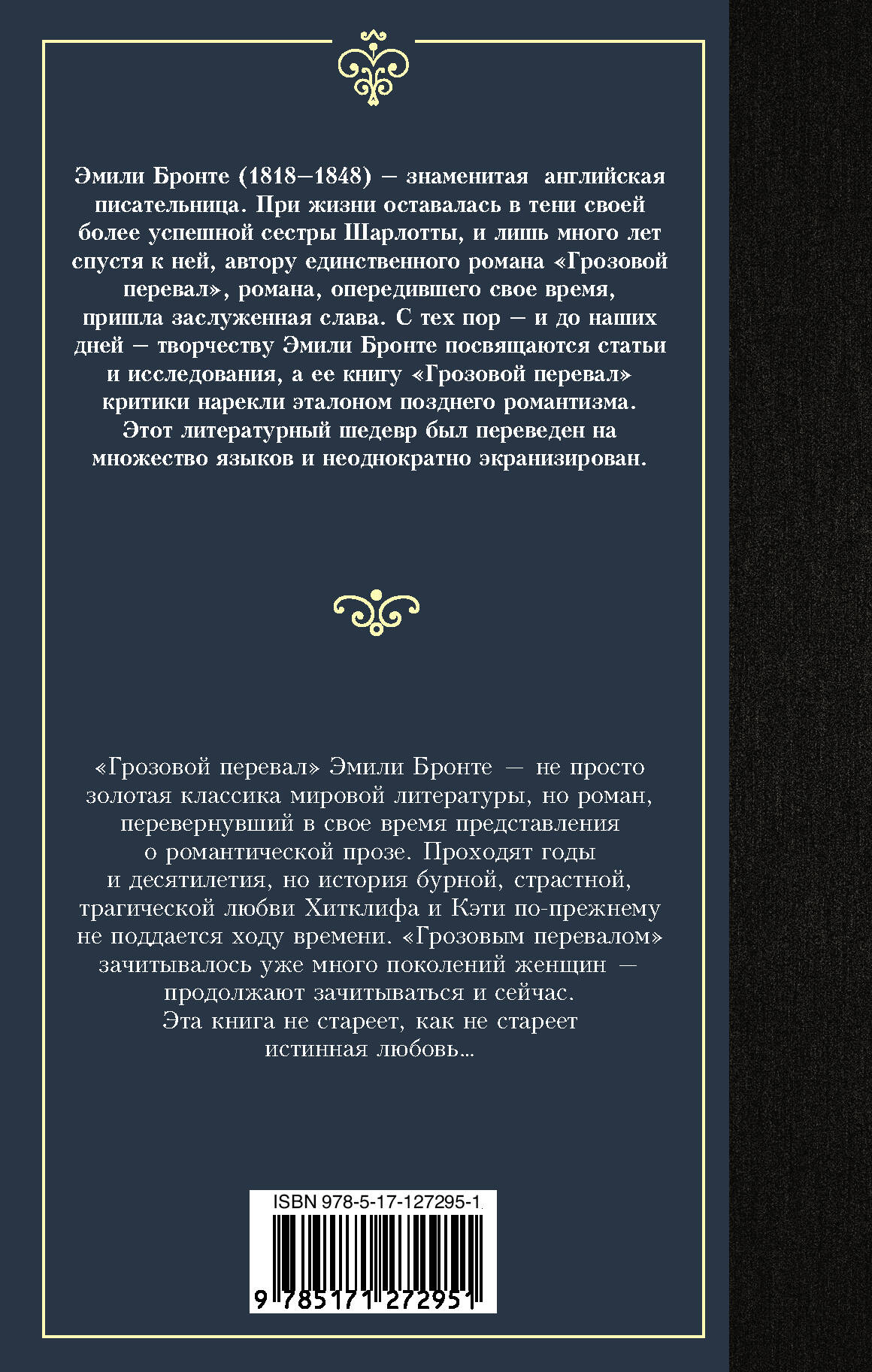 "Грозовой перевал" Эмили Бронте - не просто золотая классика мировой литературы, но роман, перевернувший в свое время представления о романтической прозе. Проходят годы и десятилетия, но история бурной, страстной, трагической любви Хитклифа и Кэти по-прежнему не поддается ходу времени. "Грозовым перевалом" зачитывалось уже много поколений женщин - продолжают зачитываться и сейчас. Эта книга не стареет, как не стареет истинная любовь…| Издательство | ИЗДАТЕЛЬСТВО "АСТ" |