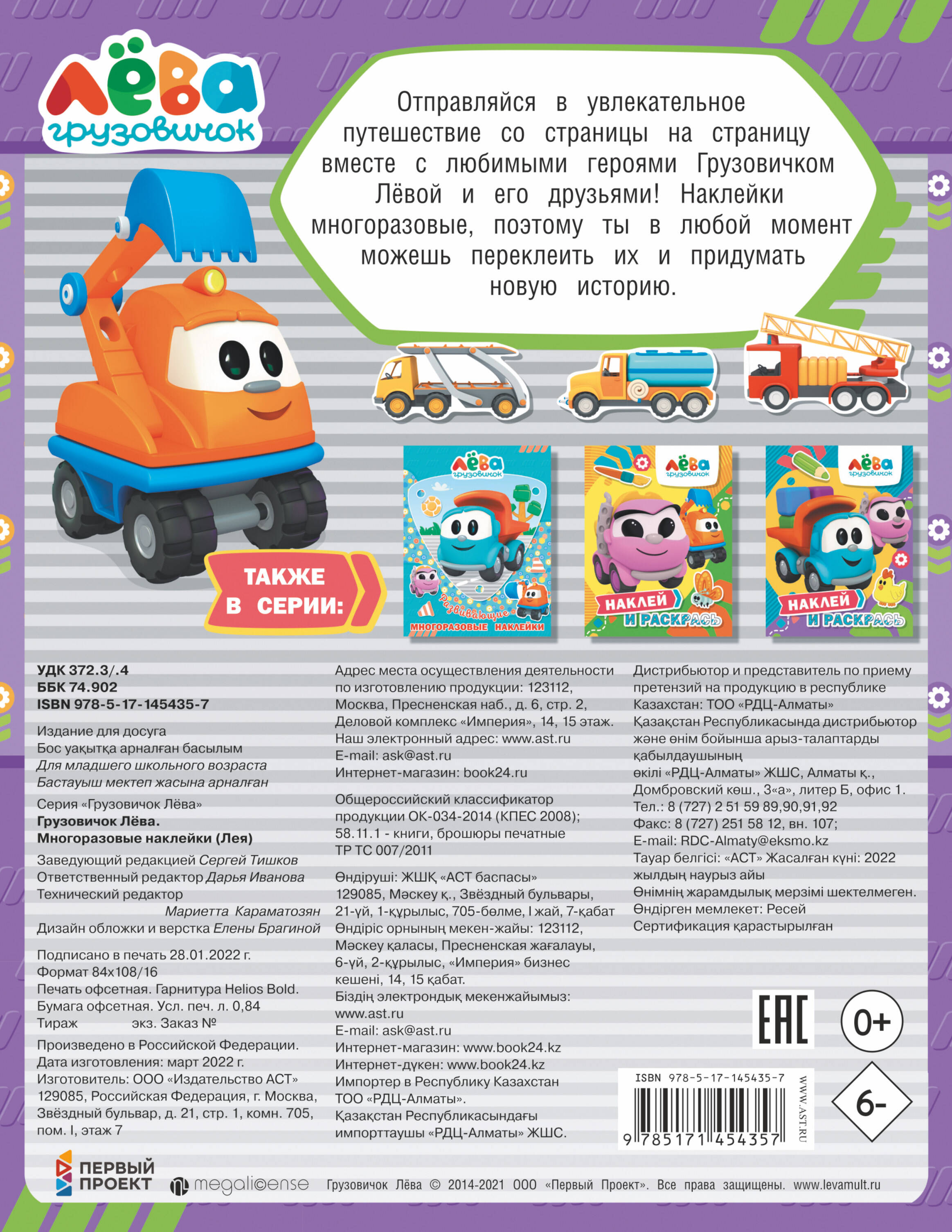 Отправляйся в увлекательное путешествие со страницы на страницу вместе с любимыми героями Грузовичком Лёвой и его друзьями! Наклейки многоразовые, поэтому ты в любой момент можешь переклеить их и придумать новую историю.| Издательство | АСТ |