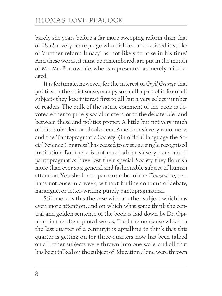 Thomas Love Peacock (1785-1866) was an English novelist, poet, and official of the East India Company. The final novel of Thomas Love Peacock followed the others after a silence of 30 years, its typical Peacockian format intact an idyllic, country house setting, a genial host, many opinionated guests, and a romantic love interest. Like all of Peacocks novels, Gryll Grange dissects the philosophy, manners, and culture of his day through a sparkling cocktail of dialogue and poetry.| Издательство | Т8 RUGRAM |