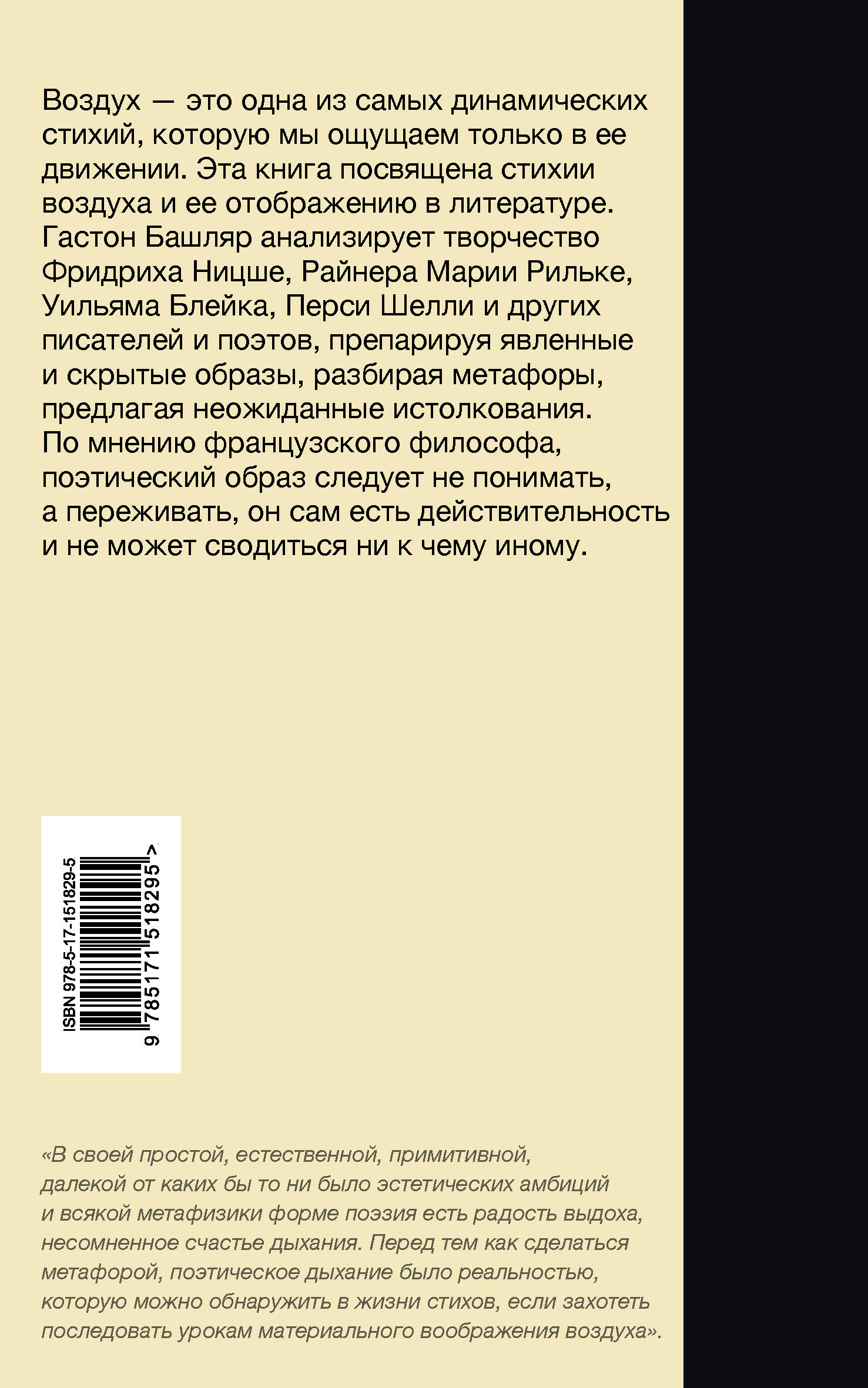 Воздух - это одна из самых динамических стихий, которую мы ощущаем только в ее движении. Эта книга посвящена стихии воздуха и ее отображению в литературе. Гастон Башляр анализирует творчество Фридриха Ницше, Райнера Марии Рильке, Уильяма Блейка, Перси Шелли и других писателей и поэтов, препарируя явленные и скрытые образы, разбирая метафоры, предлагая неожиданные истолкования. По мнению французского философа, поэтический образ следует не понимать, а переживать, он сам есть действительность и не может сводиться ни к чему иному.| Издательство | Издательство "АСТ" |