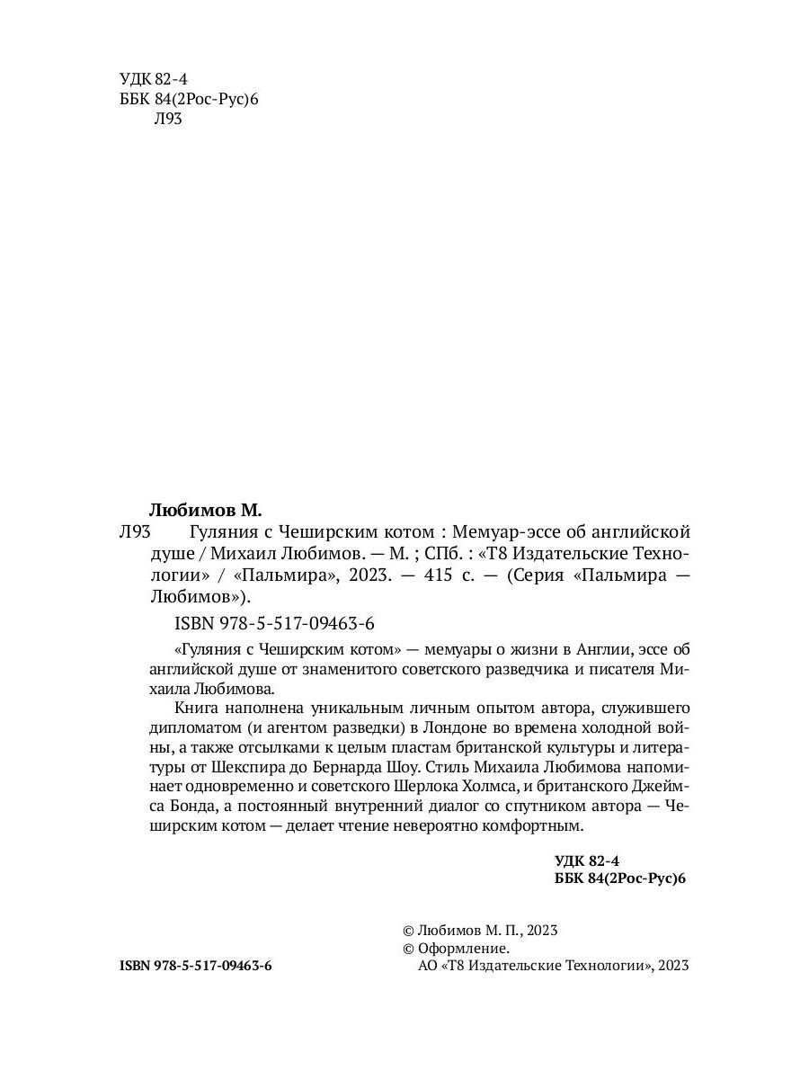 "Гуляния с Чеширским котом" - мемуары о жизни в Англии, эссе об "английской душе". Книга наполнена уникальным личным опытом автора, а также отсылками к целым пластам британской культуры и литературы от Шекспира до Бернарда Шоу. Стиль Михаила Любимова напоминает одновременно и советского Шерлока Холмса, и британского Джеймса Бонда, а постоянный внутренний диалог со спутником автора - Чеширским котом - делает чтение невероятно комфортным.