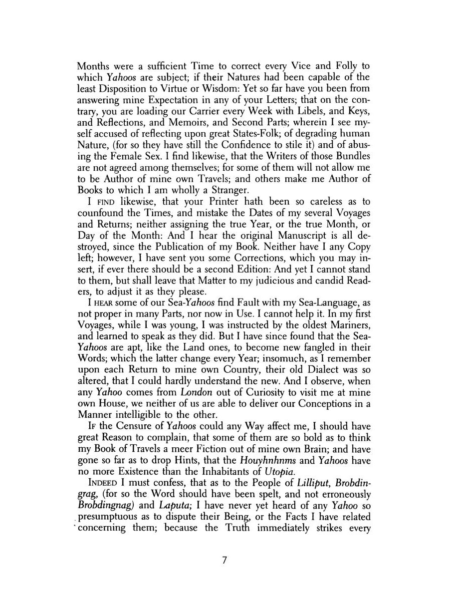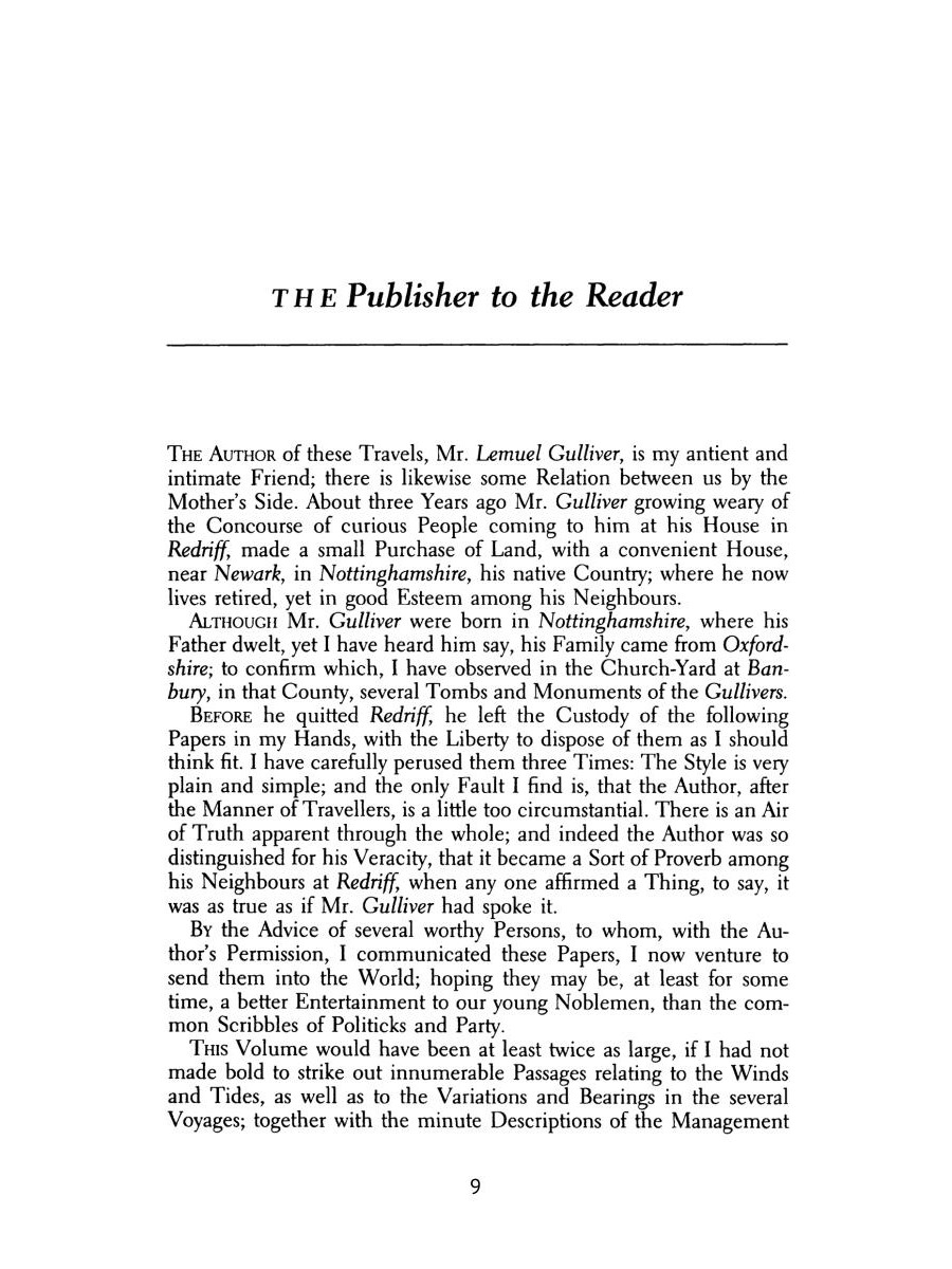 Jonathan Swift (1667-1745) - a famous Anglo-Irish satirist, essayist, political pamphleteer, poet and cleric. Swift is mostly remembered for Gulliver's Travels, A Modest Proposal, A Journal to Stella and other works. His deadpan, ironic writing style has led to such satire being subsequently termed "Swiftian". Travels into Several Remote Nations of the World. In Four Parts. By Lemuel Gulliver, First a Surgeon, and then a Captain of Several Ships, commonly known as Gulliver's Travels (1726, amended 1735), is a prose satire both on human nature and the "travellers tales" literary subgenre of the day. It is Swift's best known full-length work, and a classic of English literature.