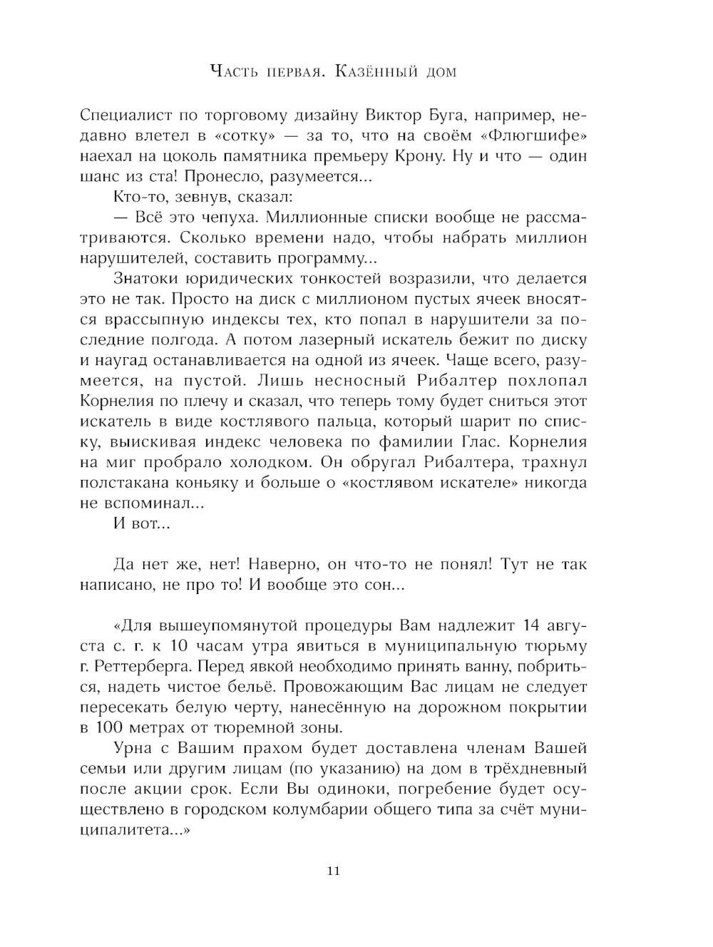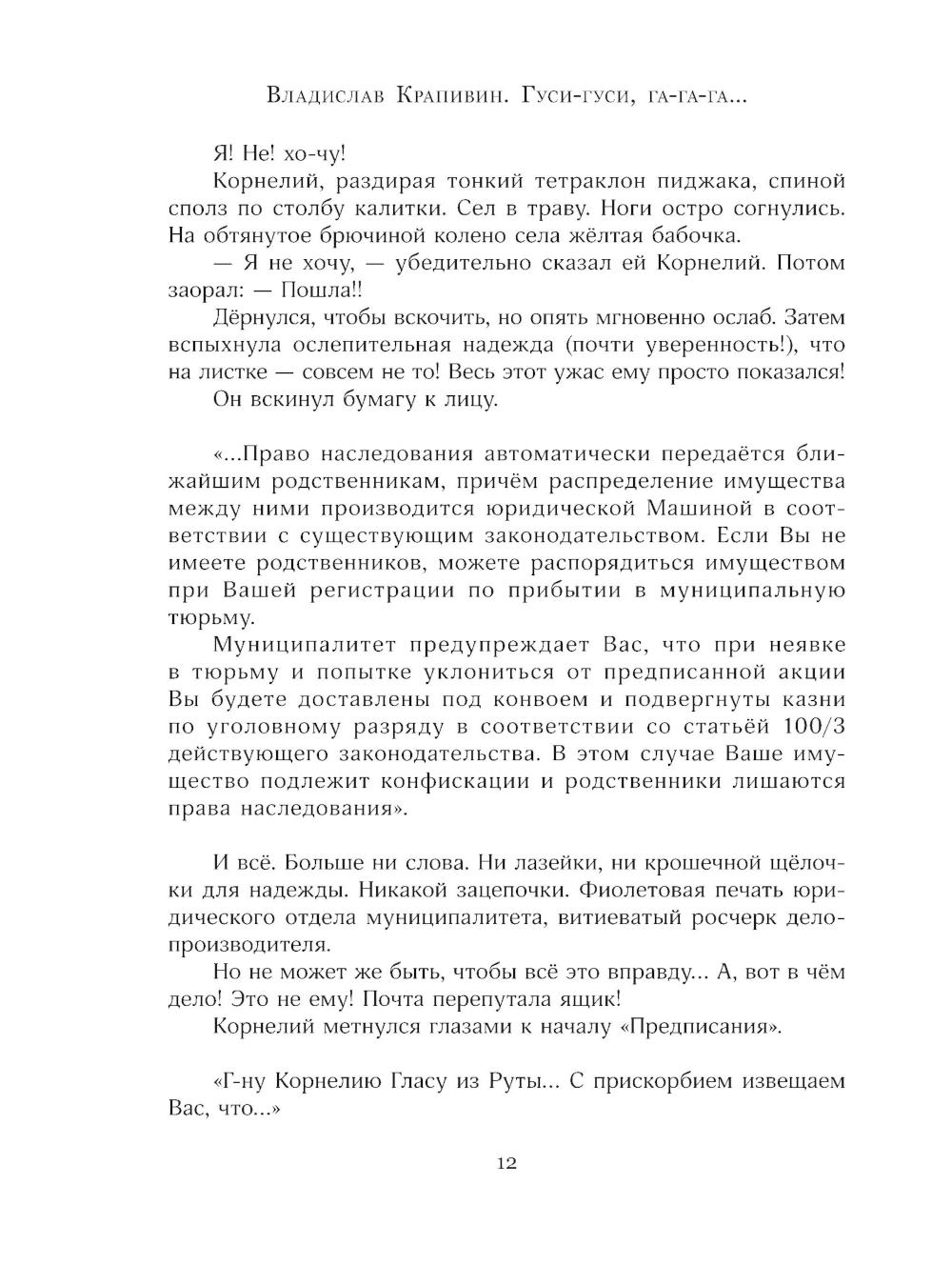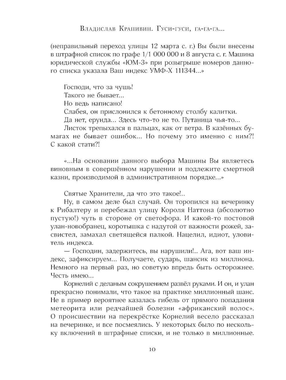 Миром будущего управляет всемогущая Машина. Жителям Вест-Федерации при рождении присваивают цифровой индекс, они живут в комфортных «умных» домах и превыше всего ценят стабильность. Но плата за сытую и спокойную жизнь высока: Машина постоянно контролирует людей и за малейший проступок может покарать смертью. Корнелию Гласу не повезло, и однажды он получает предписание явиться в тюрьму на собственную казнь... Антиутопия «Гуси-гуси, га-га-га...» продолжает цикл фантастических повестей «В глубине Великого Кристалла». Для детей 11-14 лет.| Издательство | Изд. Лабиринт Пресс |