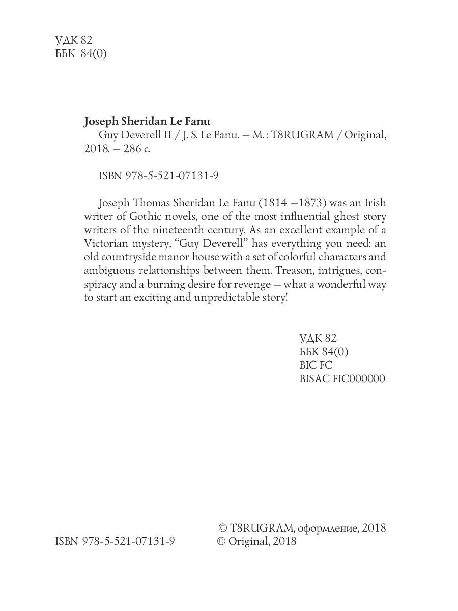 Joseph Thomas Sheridan Le Fanu (1814 -1873) was an Irish writer of Gothic novels, one of the most influential ghost story writers of the nineteenth century. As an excellent example of a. Victorian mystery, "Guy Deverell" has everything you need: an old countryside manor house with a set of colorful characters and ambiguous relationships between them. Treason, intrigues, conspiracy and a burning desire for revenge - what a wonderful way to start an exciting and unpredictable story!| Издательство | Т8 RUGRAM |