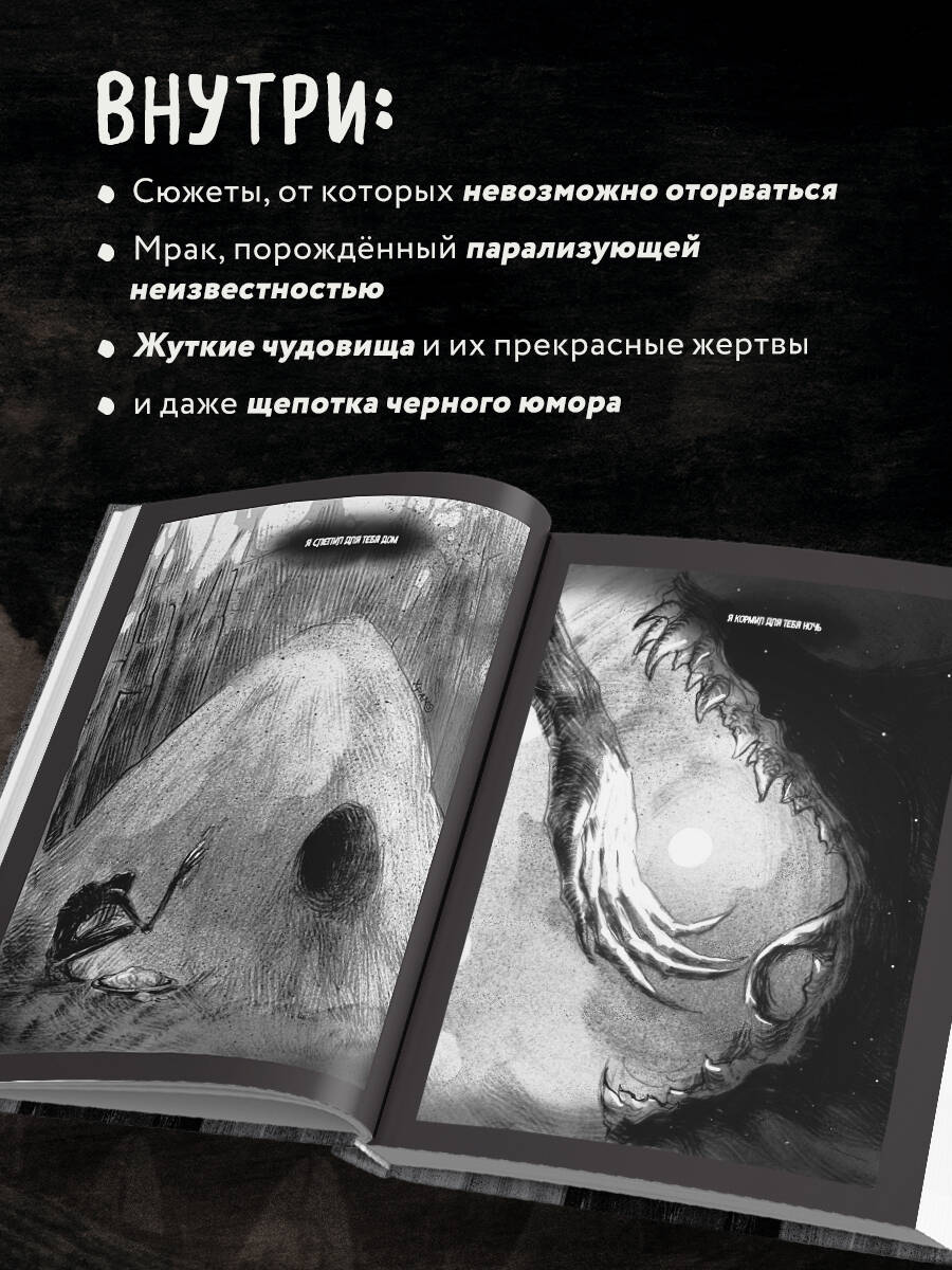 Это издание - коллекция из 11 оригинальных комиксов, наполненных густой атмосферой саспенса, чудовищами, неожиданными сюжетами и щепоткой чёрного юмора. Эта книга для чтения в темноте. Пока ты держишь её в руках, тени вокруг сгущаются и обретают лица. Искажённые и противоестественные гримасы с упоением наблюдают твоё добровольное погружение в кошмар. Каждый комикс сочетает в себе оригинальные идеи и стилистическую гиперболу, создавая ощущение безысходности и погружая в атмосферу настоящего арт-хоррора. Этой коллекцией автор подарил поклонникам возможность по-новому взглянуть на мир тёмных фантазий и погрузиться в сюжеты, от которых невозможно оторваться.| Издательство | ООО "Издательство "Эксмо" |