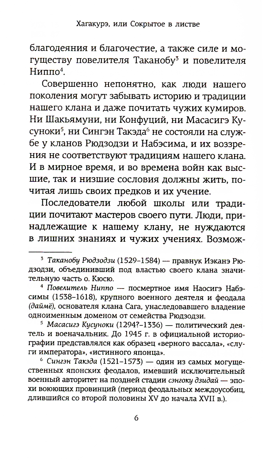 «Хагакурэ, или Сокрытое в листве» - знаменитый трактат о кодексе чести самурая (бусидо), выдержанный в канонах дзен-буддизма, синтоизма и конфуцианства и составленный на основе бесед с самураем XVII века Цунэтомо Ямамото, ставшим буддийским монахом под именем Дзётё Ямамото. Эти истории о боевой доблести и воинском долге, совести и ответственности, записанные одним из учеников Дзётё, - не сборник заповедей, а оригинальная методика познания мира и постижения мудрости. «Возможно, "Хагакурэ" - изначально книга-парадокс, - писал современный классик Юкио Мисима. - Во время войны она излучала свет, но средь белого дня он был не очень заметен, и лишь во мраке книга засияла по-настоящему. "Эта книга исповедует свободу. Эта книга взывает к жару сердец". Публикуется в переводе с японского - большинство предыдущих изданий «Хагакурэ» по-русски брали за основу английский перевод.| Издательство | КоЛибри |