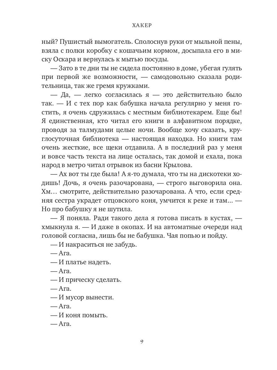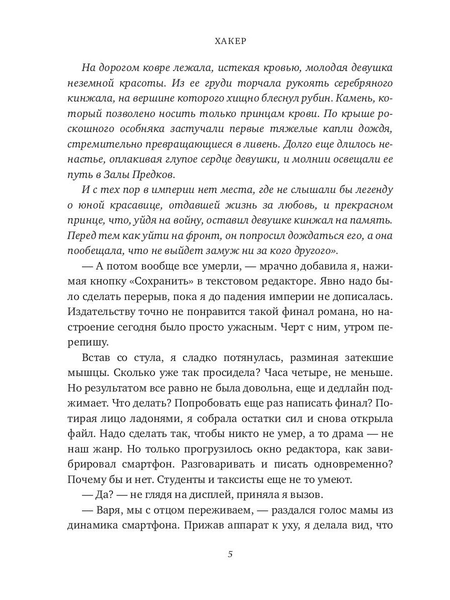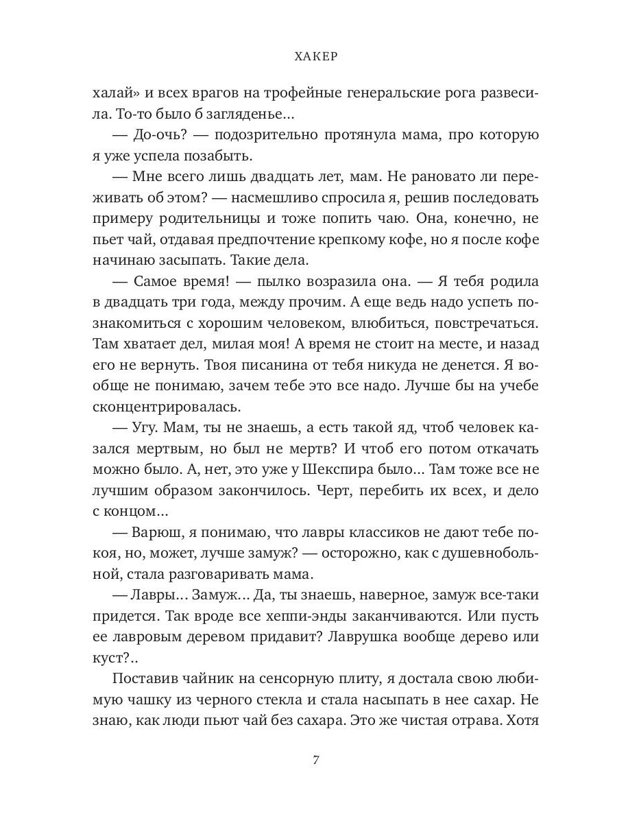 Эта история о том, как один парень установил круглосуточную слежку за понравившейся ему девушкой. С этого момента ее проблемы начнут решаться словно по мановению волшебной палочки, а окружение меняться согласно его желанию. Однако загадочный хакер не спешит раскрывать свою личность, даже после установления тотального контроля над жизнью девушки. Сталкером может оказаться кто угодно: сосед, друг брата, однокурсник, новый преподаватель или вообще кто угодно. Так кто же он такой? Как это делает? И что нужно таинственному поклоннику, который ни о чем не просит? На все эти вопросы Варя намерена попытаться найти ответы, а вместе с ними и самого Хакера.| Издательство | Рипол Классик |
