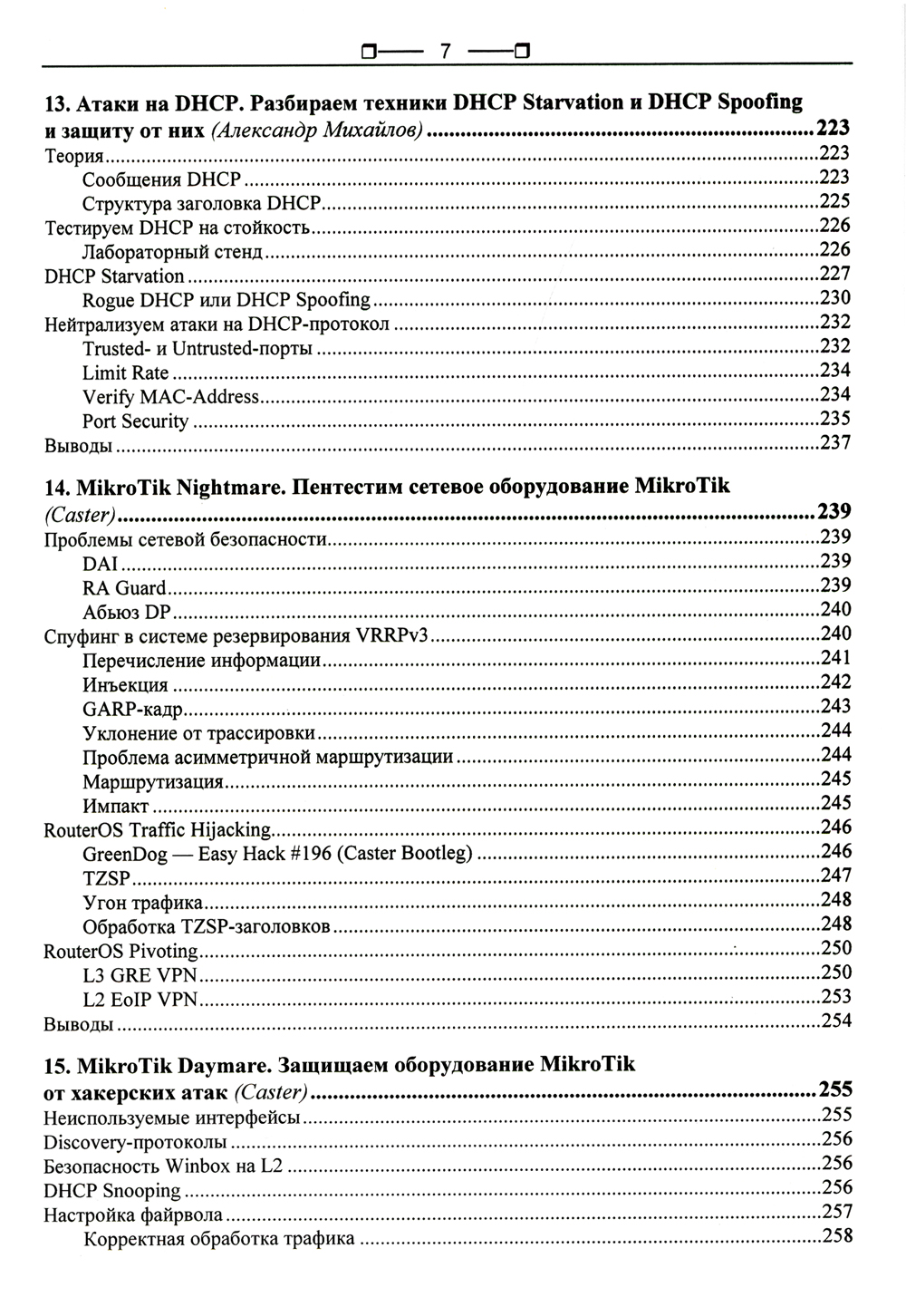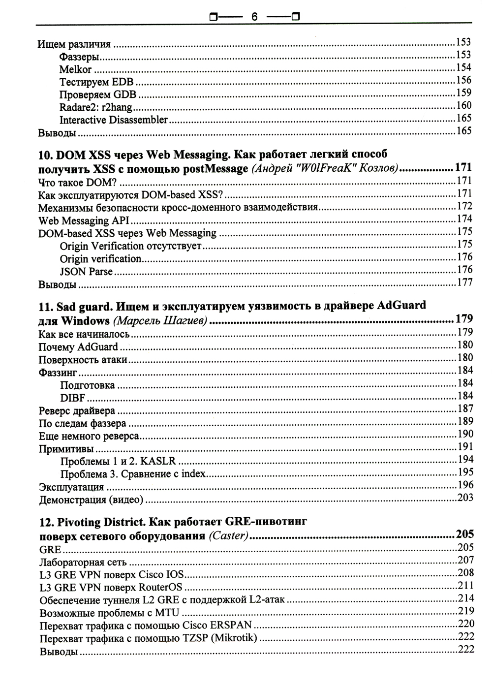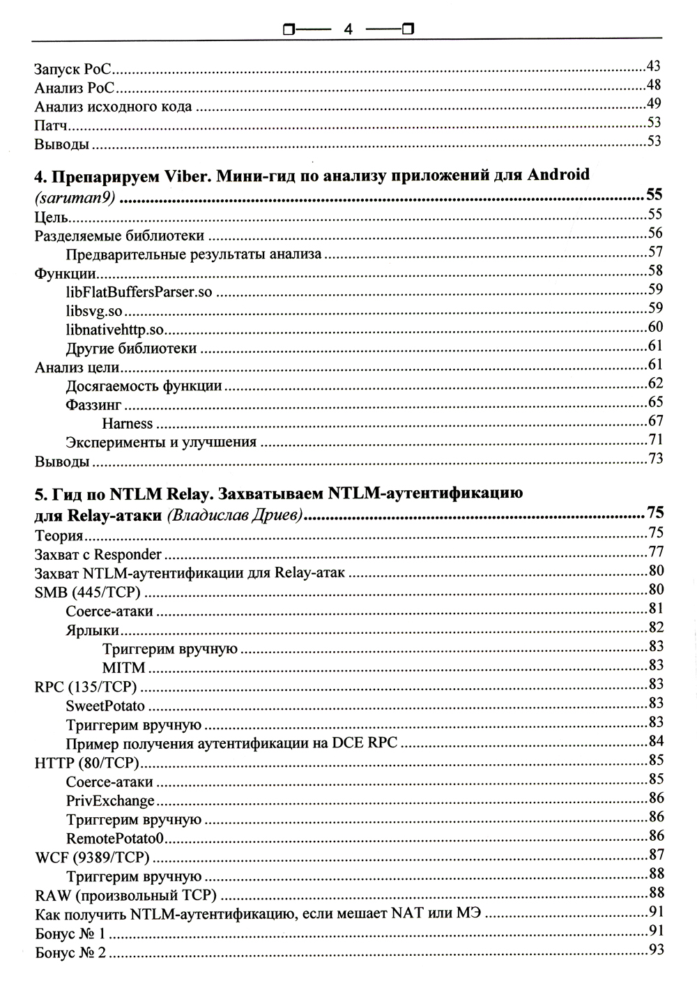 В сборнике избранных статей из журнала «Хакер» описаны способы поиска уязвимостей в сетевом оборудовании MikroTik и использования этого оборудования для постэксплуатации Windows. Показаны методы защиты MikroTik от хакерских атак. Рассказывается об эксплуатации XSS-уязвимостей DOM XSS с помощью Web Messaging, о поиске уязвимостей в приложениях Android на примере Viber и в драйвере AdGuard для Windows. Приводится подробное руководство по атакам NTLM Relay и защите от них. Даны инструкции по фаззингу JS-приложений при помощи Fuzzilli, описана ошибка use after free в движке Blink. Изложены практические способы реализации антиотладки в исполняемых файлах для Linux. Показано, как работает GRE-пивотинг поверх сетевого оборудования. Отдельная глава посвящена практическому способу спуфинга GPS.| Издательство | BHV(БХВ) |