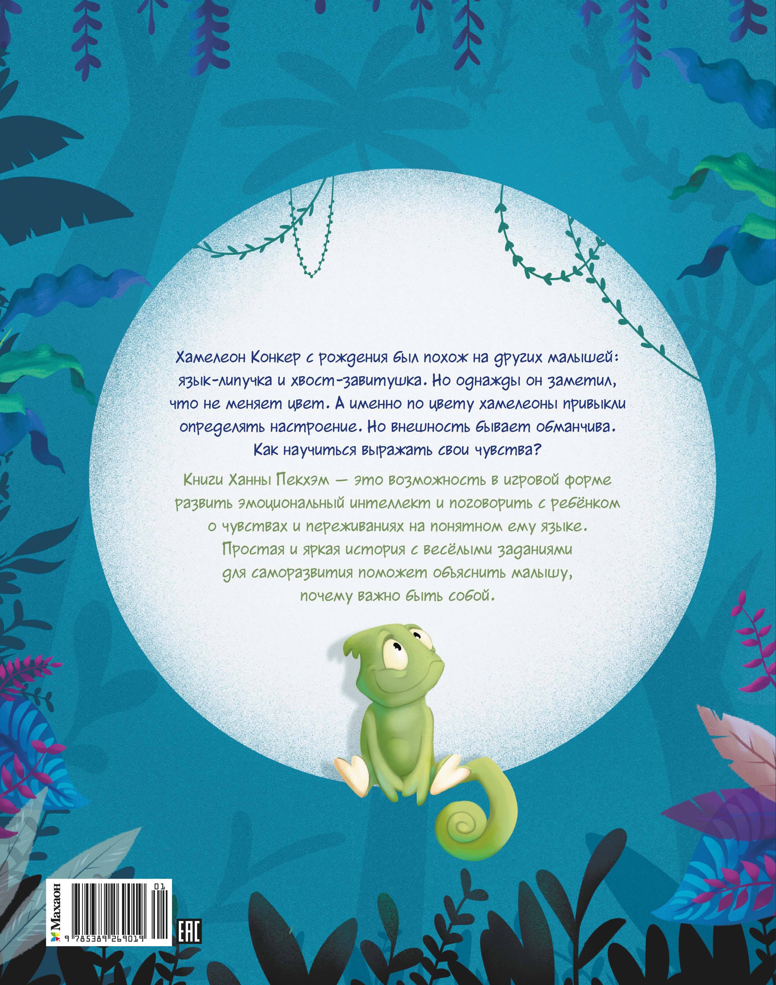 Хамелеон Конкер с рождения был похож на других малышей: язык-липучка и хвост-завитушка. Но однажды он заметил, что не меняет цвет. А именно по цвету хамелеоны привыкли определять настроение. Но внешность бывает обманчива. Как научиться выражать свои чувства? Простая и яркая история с заданиями для саморазвития поможет объяснить малышу, почему важно быть собой. Развитый эмоциональный интеллект - основа гармоничного формирования ребенка. Сказки Ханны Пекхэм с живыми добрыми героями помогут понять и принять собственные эмоций и чувства окружающих. Веселые задания в конце книги в игровой форме позволят родителям поговорить с ребенком о самом важном. ∙ Плотная белая бумага, большой формат, крупный шрифт, удобно читать с ребенком на коленях! ∙ Красочные иллюстрации удерживают внимание. ∙ Никаких сложных слов, короткие предложения, простой язык помогает легче усвоить материал. ∙ Задания в конце книги помогут на реальных примерах проиграть эмоции и научиться управлять или и распознавать разные чувства.| Издательство | Издательство АЗБУКА ООО |
