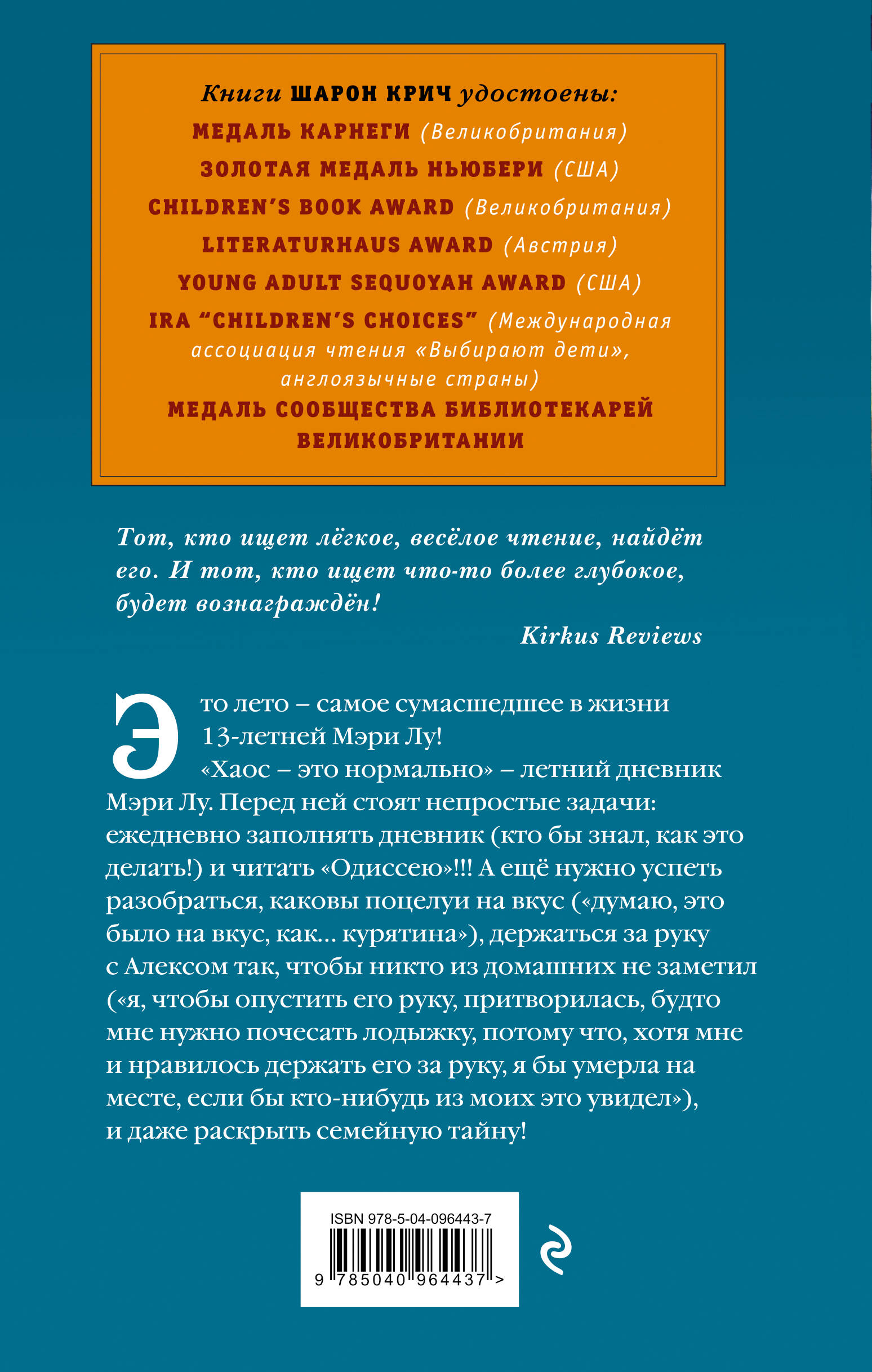 «Хаос - это нормально» - летний дневник 13-летней Мэри Лу Финни. Это история про первую любовь, про дружбу, про жизнь и смерть, про то, как сложно правильно держаться за руки, когда тебе тринадцать, и про то, каковы на вкус первые поцелуи, и даже про то, как раскрыть семейную тайну. Хаос - идеальное описание жизни любого подростка. Эта книга для тебя и про тебя! Тот, кто ищет лёгкое, весёлое чтение, найдёт его. И тот, кто ищет что-то более глубокое, будет вознаграждён! Книги Шарон Крич - абсолютные бестселлеры. Их читают вот уже несколько поколений во всём мире. «Хаос - это нормально» вошла в 100 наиболее часто заказываемых книг в Нью-Йоркской публичной библиотеке!| Издательство | ООО "Издательство "Эксмо" |