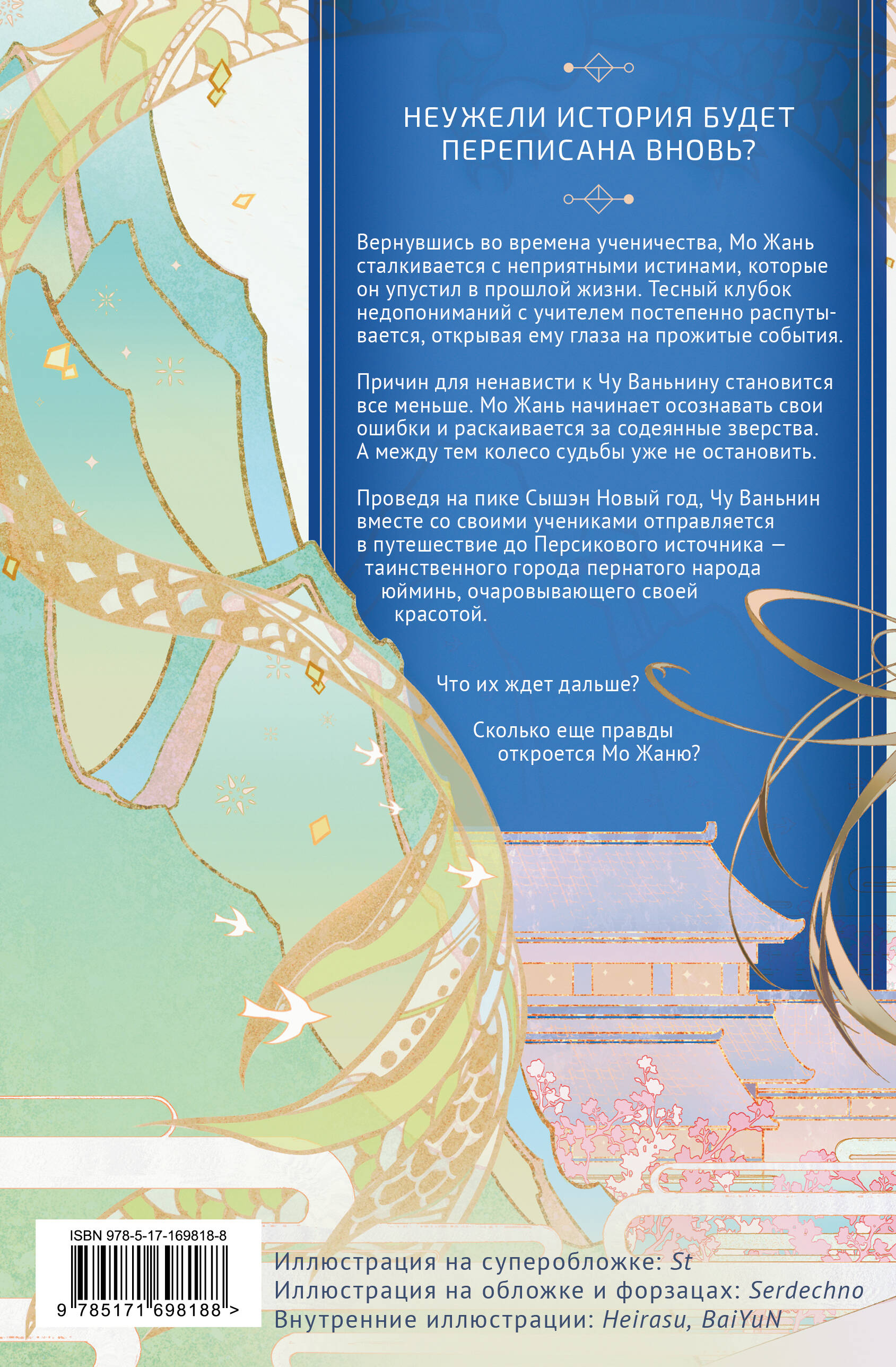 Вернувшись во времена ученичества, Мо Жань сталкивается с неприятными истинами, которые он упустил в прошлой жизни. Тесный клубок недопониманий с учителем постепенно распутывается, открывая ему глаза на прожитые события. Причин для ненависти к Чу Ваньнину становится все меньше. Мо Жань начинает осознавать свои ошибки и раскаивается за содеянные зверства. А между тем колесо судьбы уже не остановить. Проведя на пике Сышэн Новый год, Чу Ваньнин вместе со своими учениками отправляется в путешествие до Персикового источника - таинственного города пернатого народа юйминь, очаровывающего своей красотой. Что их ждет дальше? Сколько еще правды откроется Мо Жаню?| Издательство | Издательство "АСТ" |