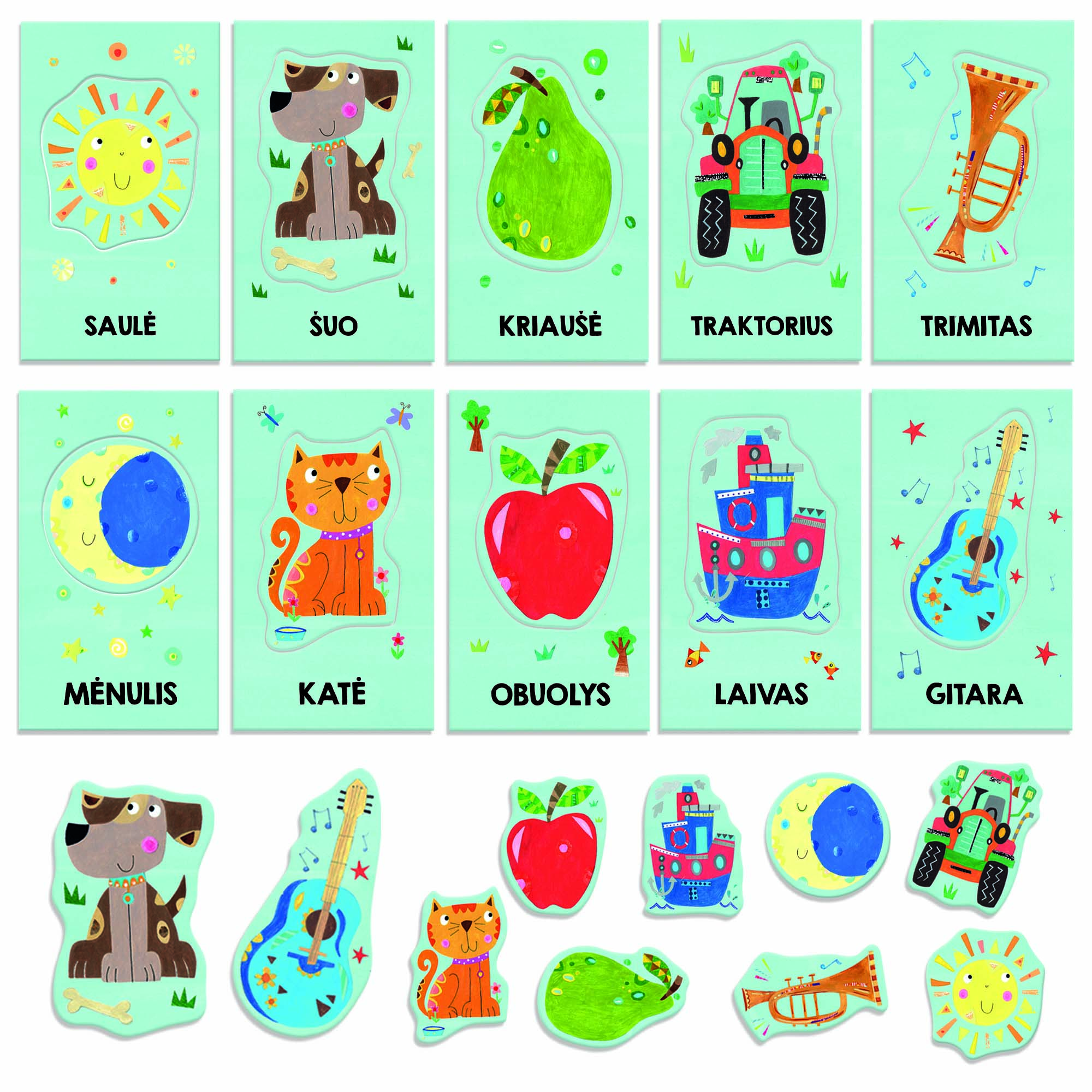 Эта игра развивает языковые способности детей и предлагает первый опыт игры с абстрактными идеями. Он основан на учении Марии Монтессори, использующей различные органы чувств для усиления познавательного опыта и использующей трехэтапный метод для содействия естественному, спонтанному обучению. Карточки для малышей сделаны из фигурного картона со вставками для стимуляции осязания. Они также стимулируют зрительное восприятие, поскольку дети узнают и запоминают картинки. В то же время карточки для малышей - полезный способ обучения дополнительным понятиям, таким как звуки слов.