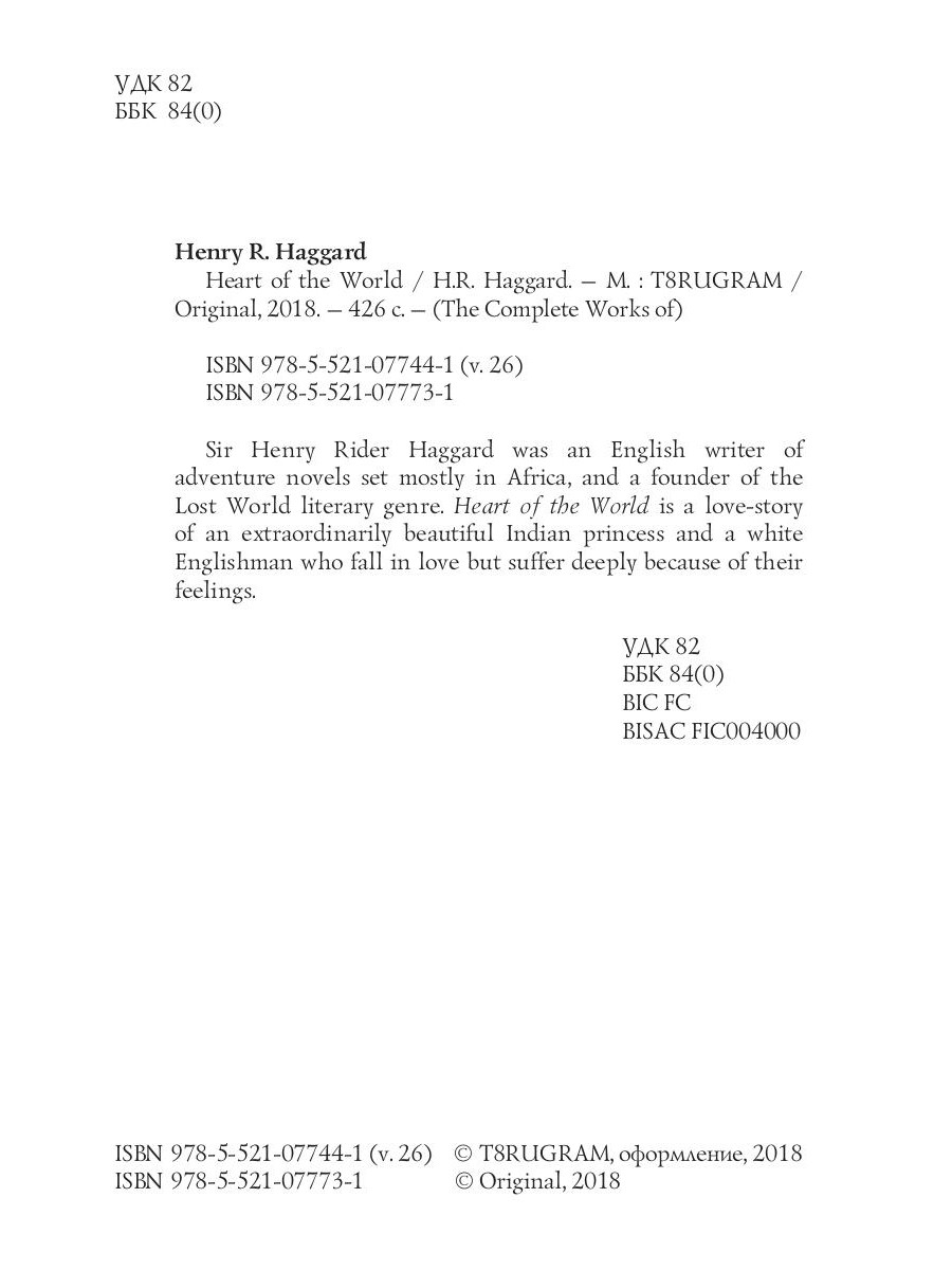 Sir Henry Rider Haggard was an English writer of adventure novels set mostly in Africa, and a founder of the Lost World literary genre. Heart of the World is a love-story of an extraordinarily beautiful Indian princess and a white Englishman who fall in love but suffer deeply because of their feelings.| Издательство | Т8 RUGRAM |