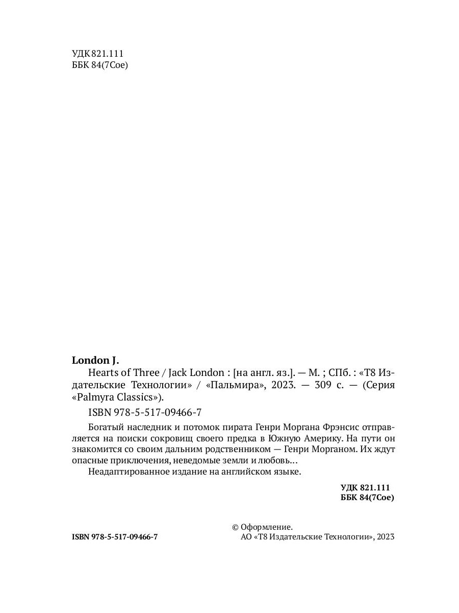 Jack London, born John Griffith Chaney (1876-1916) - a famous American novelist and short-story writer, journalist, and social activist. In his works Jack London deals romantically with elemental struggles for survival. His works have been extensively translated and he was one of the first fiction writers to obtain a large fortune from his works alone. Hearts of Three - an adventure novel about young descendant of the pirate Henry Morgan who wants to find the treasure of his ancestor. On the way, he meets his distant cousin, also Henry Morgan. Together, they will find dangerous adventures, unknown lands, and love.| Издательство | Т8 RUGRAM |