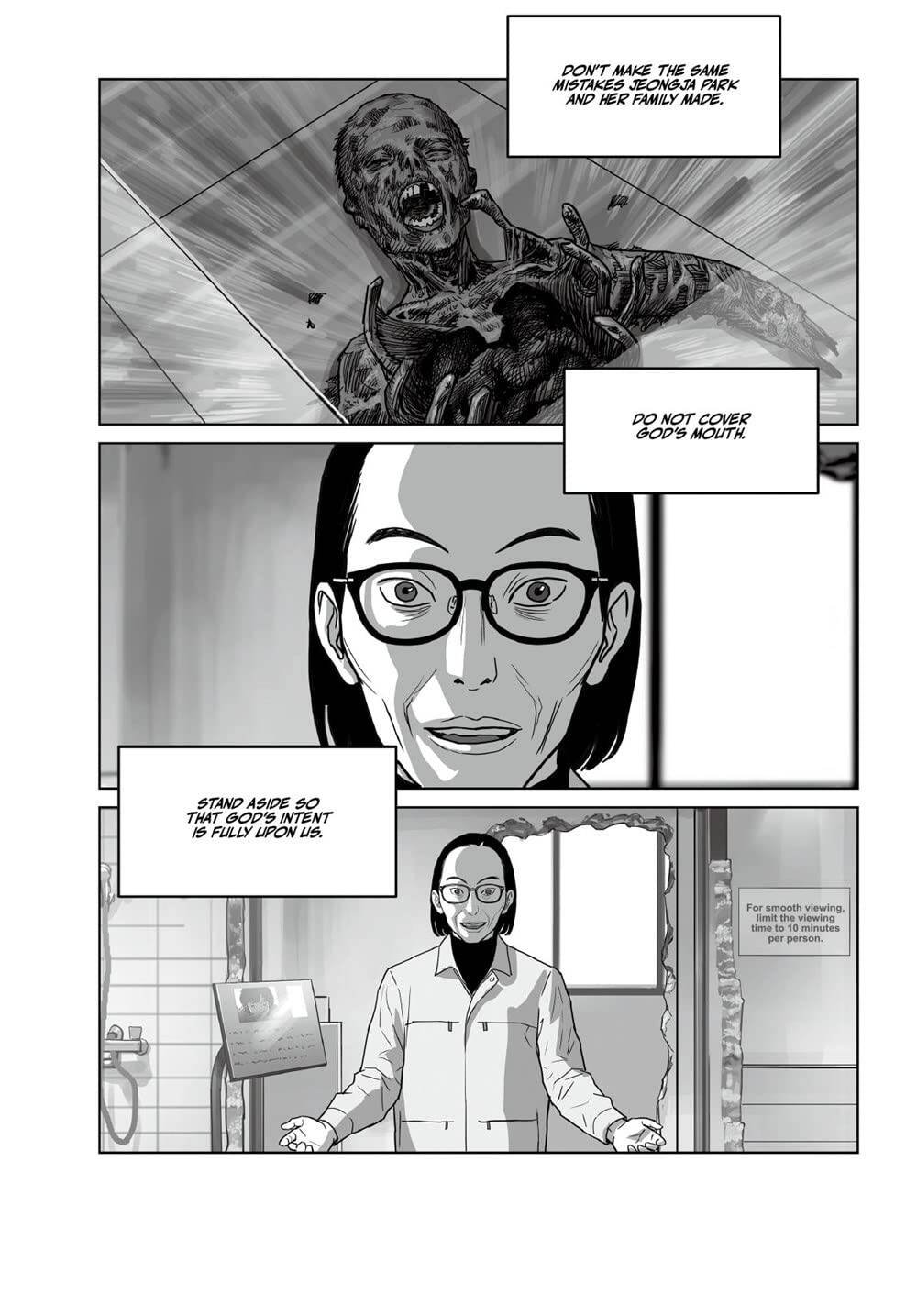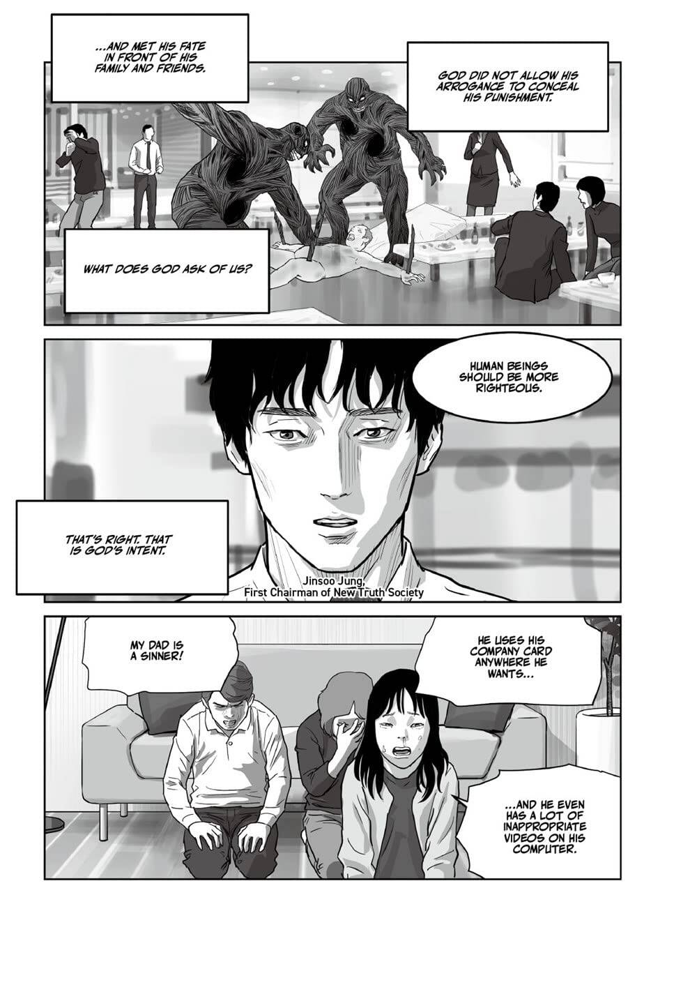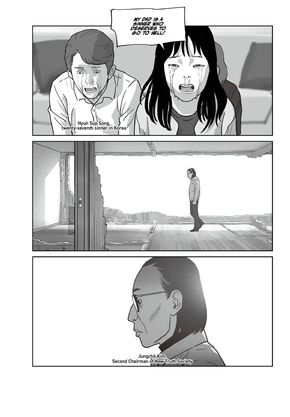 Terror intensifies as the truth behind a series of deadly and mysterious attacks is revealed... Death, murder, and hysteria. The reality of hell on earth has reached new heights following numerous public massacres. The fear-striken public begin to reexamine their lives, while others find refuge in cults, religious dogma, and internet hearsay. Does there exist salvation from this sentence of death or is the notice an irrefutable condemnation? With horror befalling the chairmain, what future lies for the New Truth Society? And who or what is responsible for creating this nightmarish world? It is time to make amends and face the mistakes of the past-atone. Available for the first time in English! The thrilling conclusion to the provocative horror of The Hellbound by Yeon Sang-Ho, director of the internatonal hit and cult favorite film Train to Busan and cartoonist Choi Gyu-Seok. Террор усиливается по мере того, как раскрывается правда о серии смертоносных и загадочных нападений... Смерть, убийство и истерия. Реальность ада на земле достигла новых высот после многочисленных публичных убийств. Охваченная страхом общественность начинает пересматривать свою жизнь, в то время как другие находят убежище в культах, религиозных догмах и слухах в Интернете. Существует ли спасение от этого смертного приговора или это предупреждение является неопровержимым осуждением? Учитывая ужас, постигший председателя, какое будущее ждет Общество Новой Истины? И кто или что несет ответственность за создание этого кошмарного мира? Пришло время исправить ошибки прошлого и признать их искупление. Впервые доступно на английском языке! Захватывающее завершение провокационного ужастика "Преисподняя" У Сан Хо, режиссера международного хита и культового фильма "Поезд в Пусан" и карикатуриста Чхве Гю Сока.