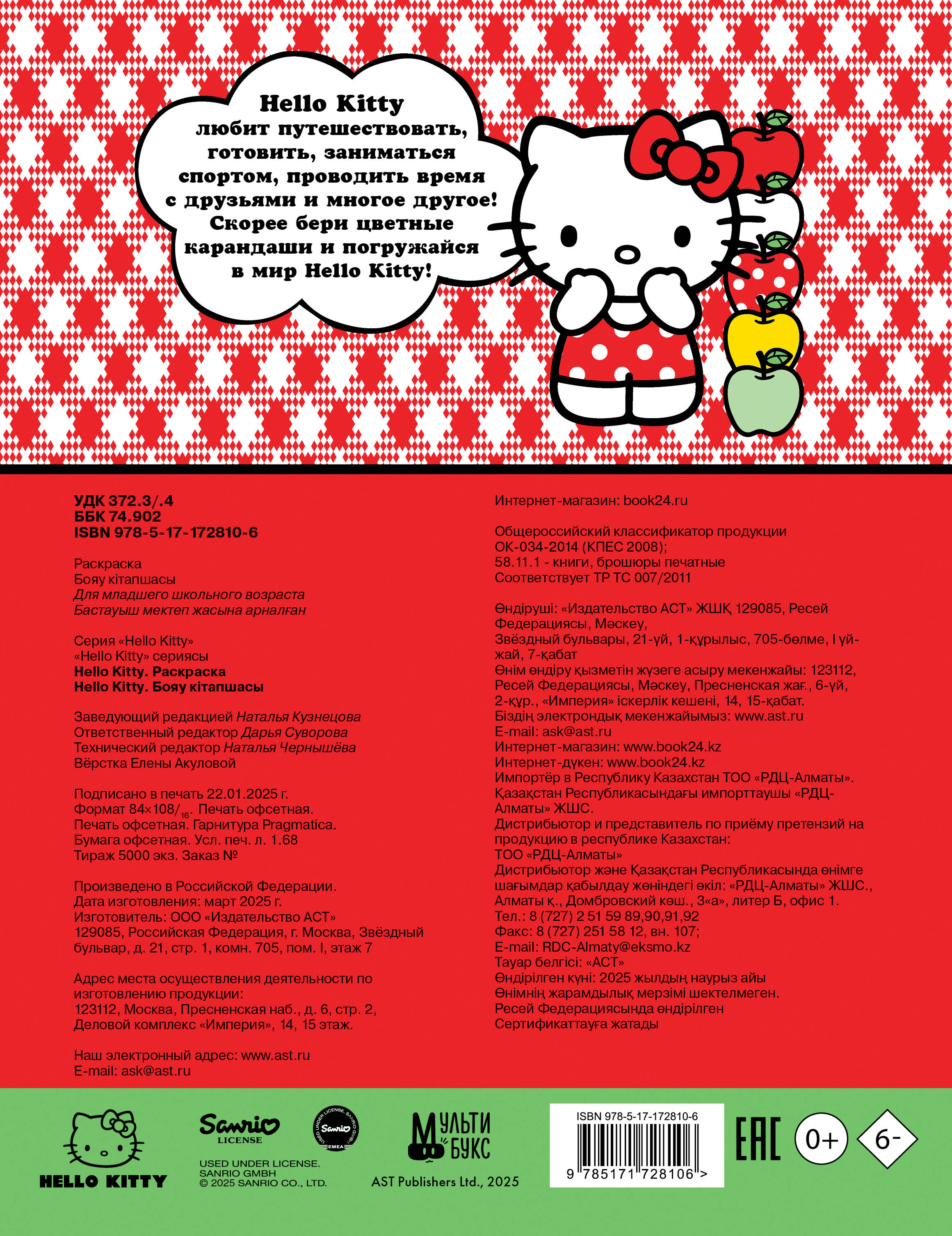 Hello Kitty любит путешествовать, готовить, заниматься спортом, проводить время с друзьями и многое другое! Скорее бери цветные карандаши и погружайся в мир Hello Kitty!| Издательство | Издательство "АСТ" |