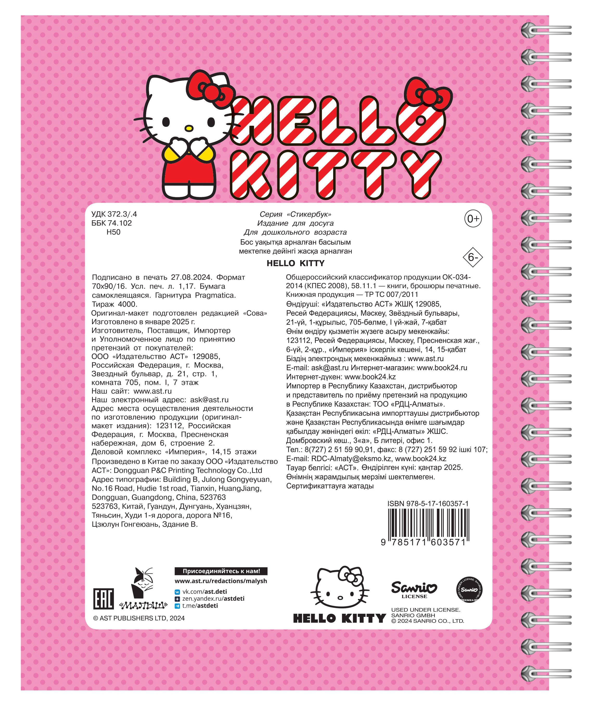 • «Hello Kitty» - замечательный мультсериал, который завоевал внимание зрителей по всему миру. Очаровательная кошечка Китти и её друзья обожают приключения, весёлые, смешные и захватывающие путешествия. • Любимые герои - теперь в формате наклеек! Целый блокнот стикеров, которыми можно украсить дневники, тетради и всё, на что хватит бурной фантазии! Осталось добавить красок к черно-белым наклейкам и создать свой шедевр, который будет радовать каждый день. • Начни раскрашивать первую страницу - и ты уже не сможешь оторваться! Маркеры, акварель, карандаши, фломастеры, гелевые ручки, линеры, мелки - подойдёт всё! Прекрасная возможность почувствовать вдохновение и выразить себя!| Издательство | Издательство "АСТ" |