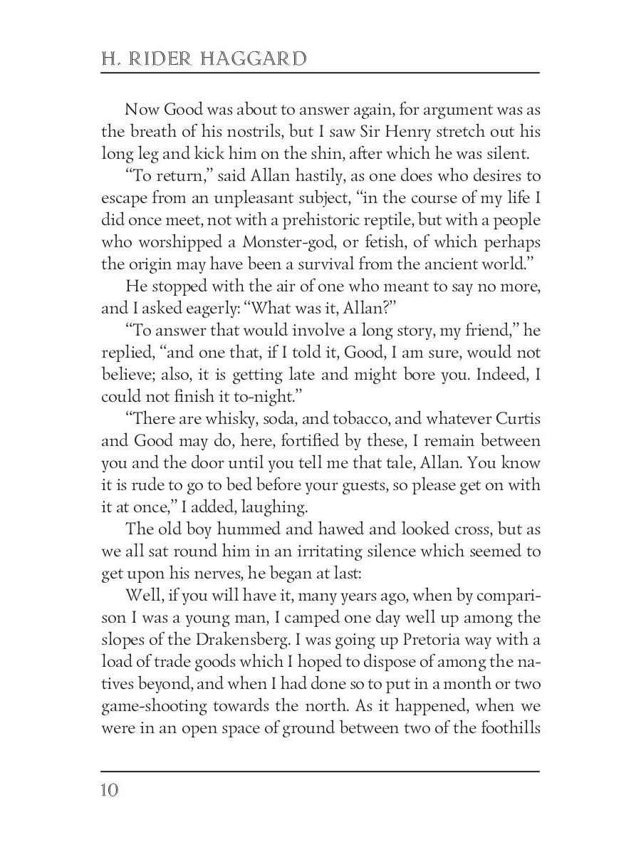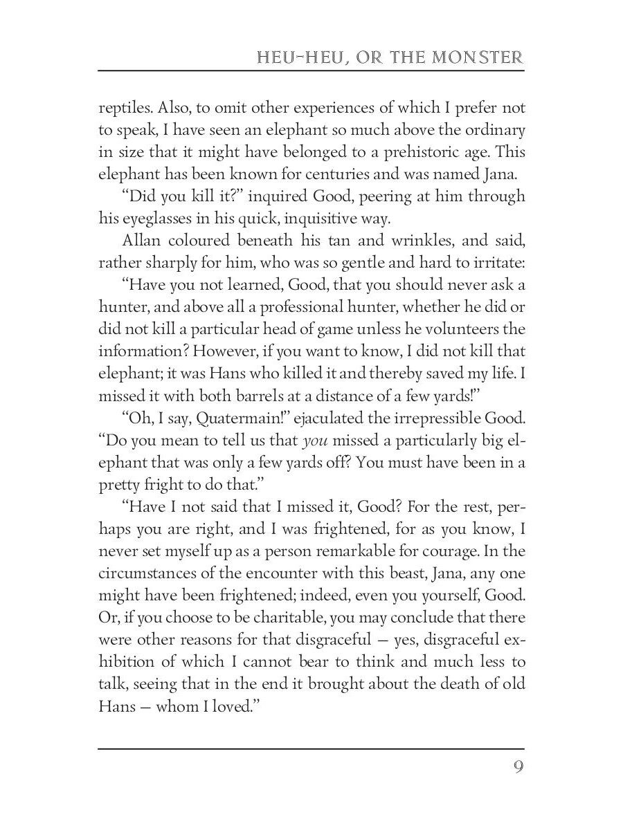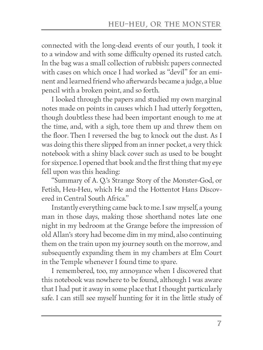 Allan Quatermain is confronted with the legend of the Heu-Heu, a monster who eats humans, while sheltering from a thunderstorm in the Drakensberg mountains. The legend appears to be reality as Quatermain is to find out after arriving in Zululand and being summond by Zikali, a Zulu Sangoma of indeterminate age. Together with his trusted companion, Hans, Quatermain is sent on a mission by Zikali.