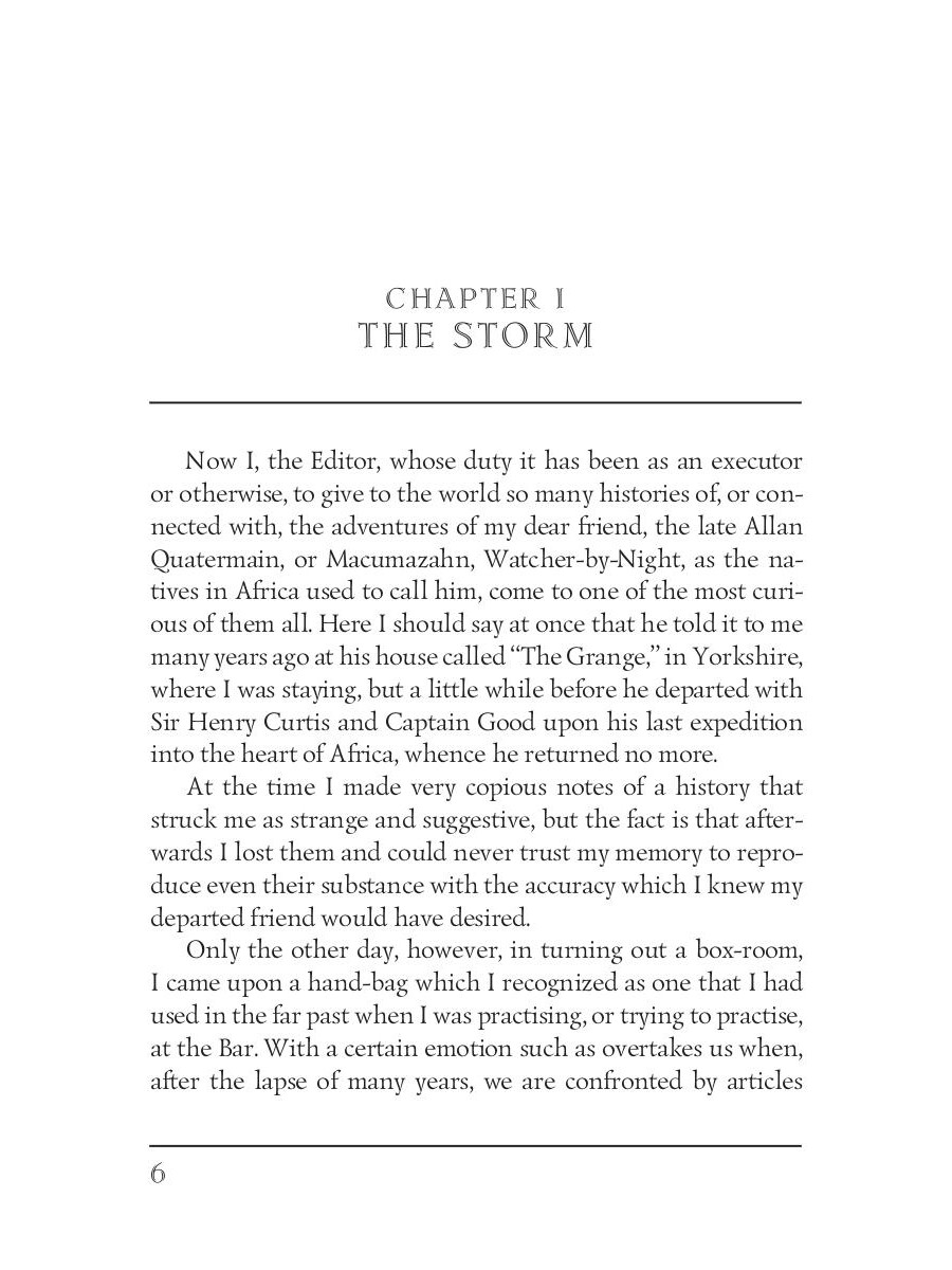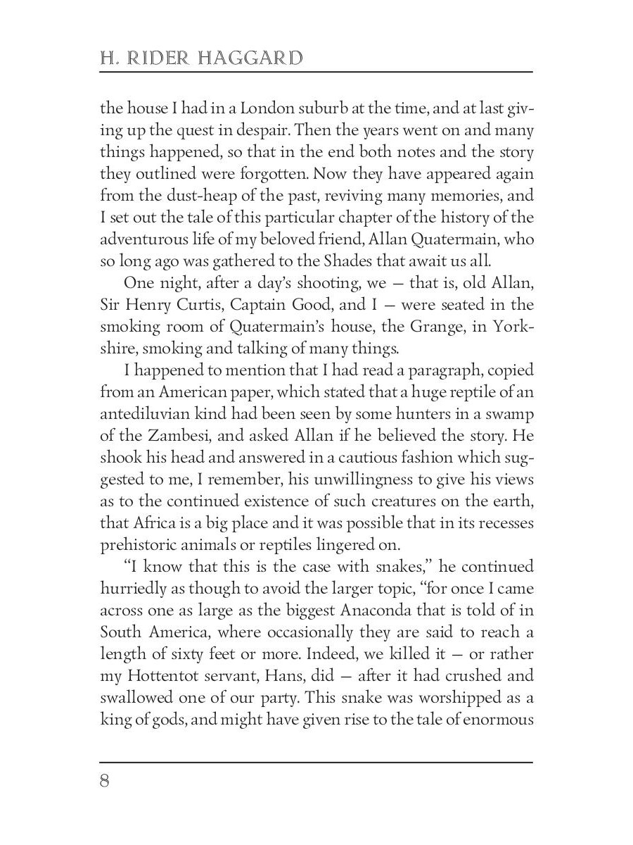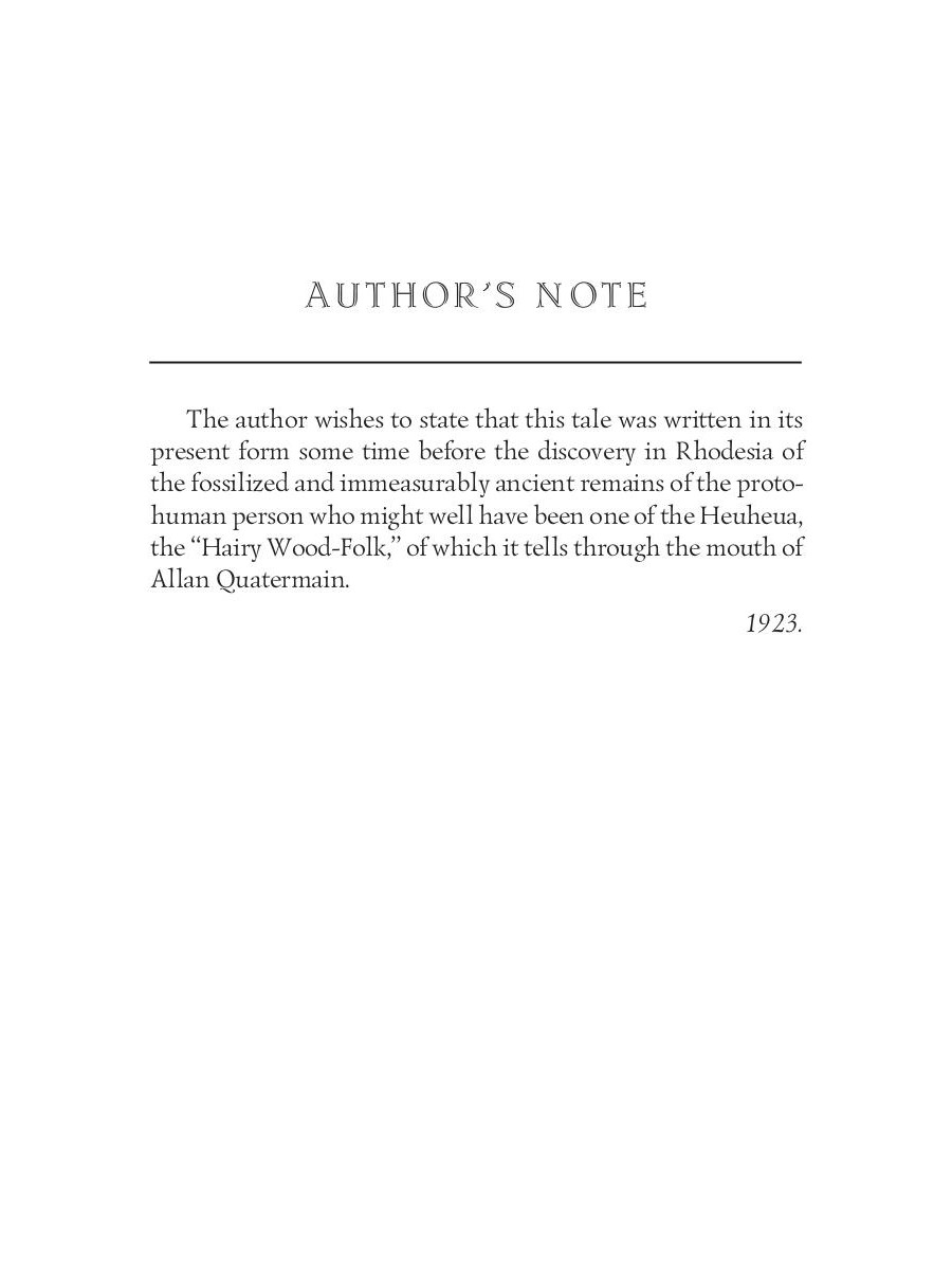 Allan Quatermain is confronted with the legend of the Heu-Heu, a monster who eats humans, while sheltering from a thunderstorm in the Drakensberg mountains. The legend appears to be reality as Quatermain is to find out after arriving in Zululand and being summond by Zikali, a Zulu Sangoma of indeterminate age. Together with his trusted companion, Hans, Quatermain is sent on a mission by Zikali.