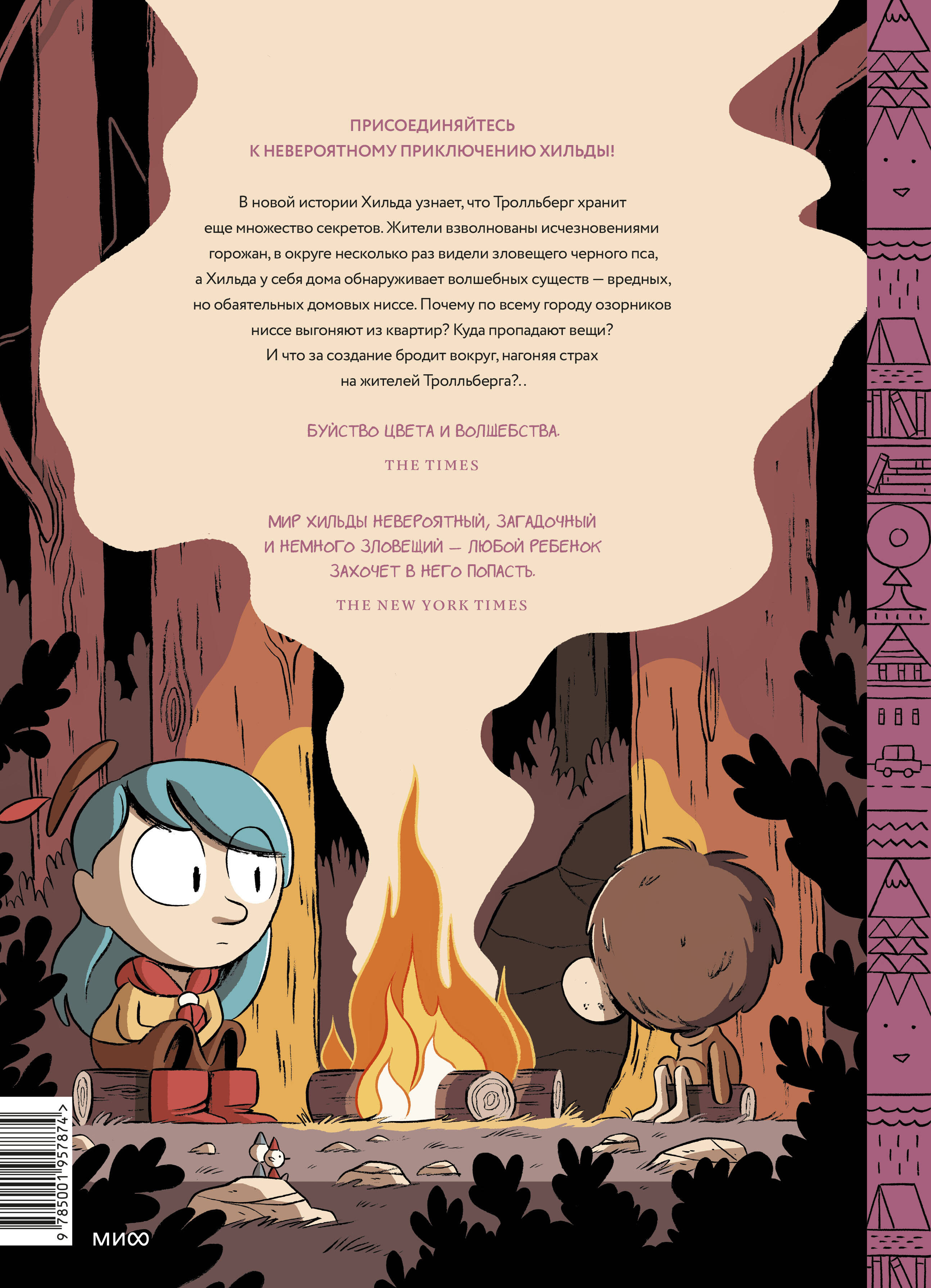 В новой истории Хильда узнает, что Тролльберг хранит еще множество секретов. Жители взволнованы исчезновениями горожан, в округе несколько раз видели огромного черного пса, а Хильда даже у себя дома обнаруживает волшебных существ - вредных, но обаятельных ниссе. Почему по всему городу озорников-ниссе выгоняют из квартир? Куда пропадают вещи? И что за создание бродит вокруг, нагоняя страх на жителей Тролльберга?.. На этот раз Хильде предстоит разгадать настоящую детективную загадку в полном волшебства скандинавском мире. Фишки книги: - Эта книга - уже не просто приключение, а настоящий детектив! События закручиваются все сильнее. - В 2014 году Люк Пирсон был номинирован на премию Айснера в категории "Лучшая книга для детей". - В 2018 году Netflix начнет транслировать мультсериал по мотивам комикса. Для кого эта книга: Для детей 8-12 лет и всех любителей комиксов. Для взрослых, которые неравнодушны к детской иллюстрации и скандинавской мифологии. О серии: Серия комиксов "Хильдафолк" (от исландского Huldufólk, где huldu - "скрывающиеся, тайные" и fólk - "народ", "народец", так в исландской мифологии называют эльфов) рассказывает о приключениях скандинавской девочки Хильды, которая дружит с гномами, троллями и другими странными существами. Хильда живет с мамой и своим домашним питомцем Твигом - ручной лисой с рогами. Люк Пирсон создал в комиксах уникальный мир, населенный странными существами из скандинавской мифологии.| Издательство | МАНН, ИВАНОВ И ФЕРБЕР ООО |