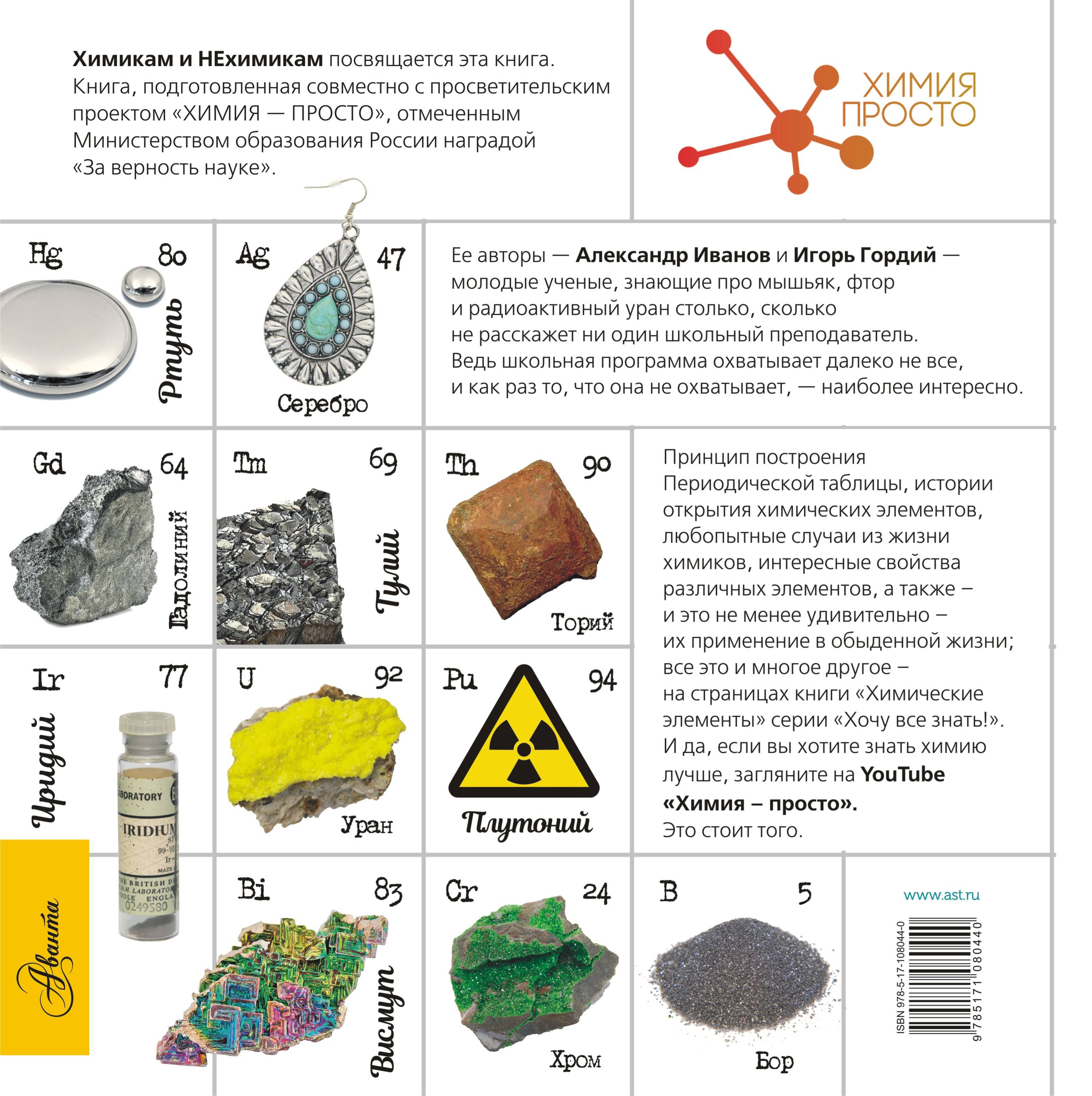 Ну что, дорогие читатели, вы готовы? Встречайте! Химикам и НЕхимикам посвящается эта книга. Книга, которую мы долго делали, которую долго ждали. Книга, подготовленная совместно с просветительским проектом "ХИМИЯ - ПРОСТО", отмеченным министерством образования России наградой "За верность науке". Её авторы - Александр Иванов и Игорь Гордий - молодые учёные, знающие про мышьяк, фтор и радиоактивный уран столько, сколько не расскажет ни один школьный преподаватель. Ведь школьная программа охватывает далеко не всё, и как раз то, что она не охватывает, - наиболее интересно. Да и многие данные, про ту же радиохимию, были до недавнего времени засекречены. Итак, принцип построения Периодической таблицы, истории открытия химических элементов, любопытные случаи из жизни химиков, интересные свойства различных элементов, а также - это не менее удивительно - их применение в обыденной жизни - всё это и многое другое - на страницах книги "Химические элементы" серии "Хочу всё знать!" И да, если вы хотите знать химию лучше, загляните на YouTube "Химия-просто". Это стоит того. Для среднего школьного возраста.| Издательство | Издательство "АСТ" |