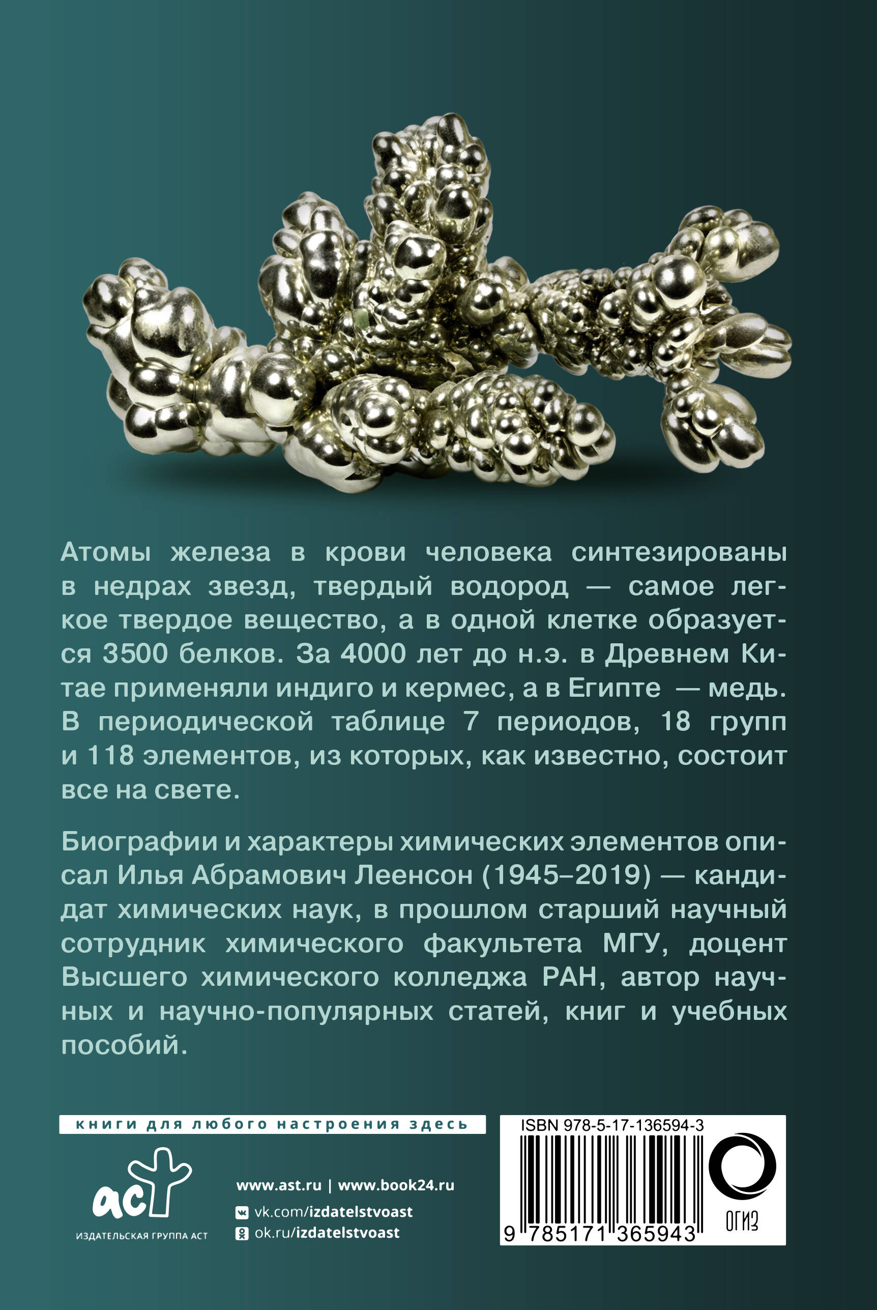 Атом железа в крови человека синтезированы в недрах звезд, твердый водород -- самое легкое твердое вещество, а в одной клетке образуется 3500 белков. За 4000 лет до н.э. в Древнем Китае применяли индиго и кермес, а в Египте -- медь. В Периодической таблице 7 периодов, 18 групп и 118 элементов, из которых, как известно, состоит все на свете. Биографии и характеры химических элементов описал Илья Абрамович Леенсон -- кандидат химических наук, старший научный сотрудник химического факультета МГУ, доцент Высшего химического колледжа РАН, автор научных и научно-популярных статей, книг и учебных пособий.| Издательство | Издательство "АСТ" |
