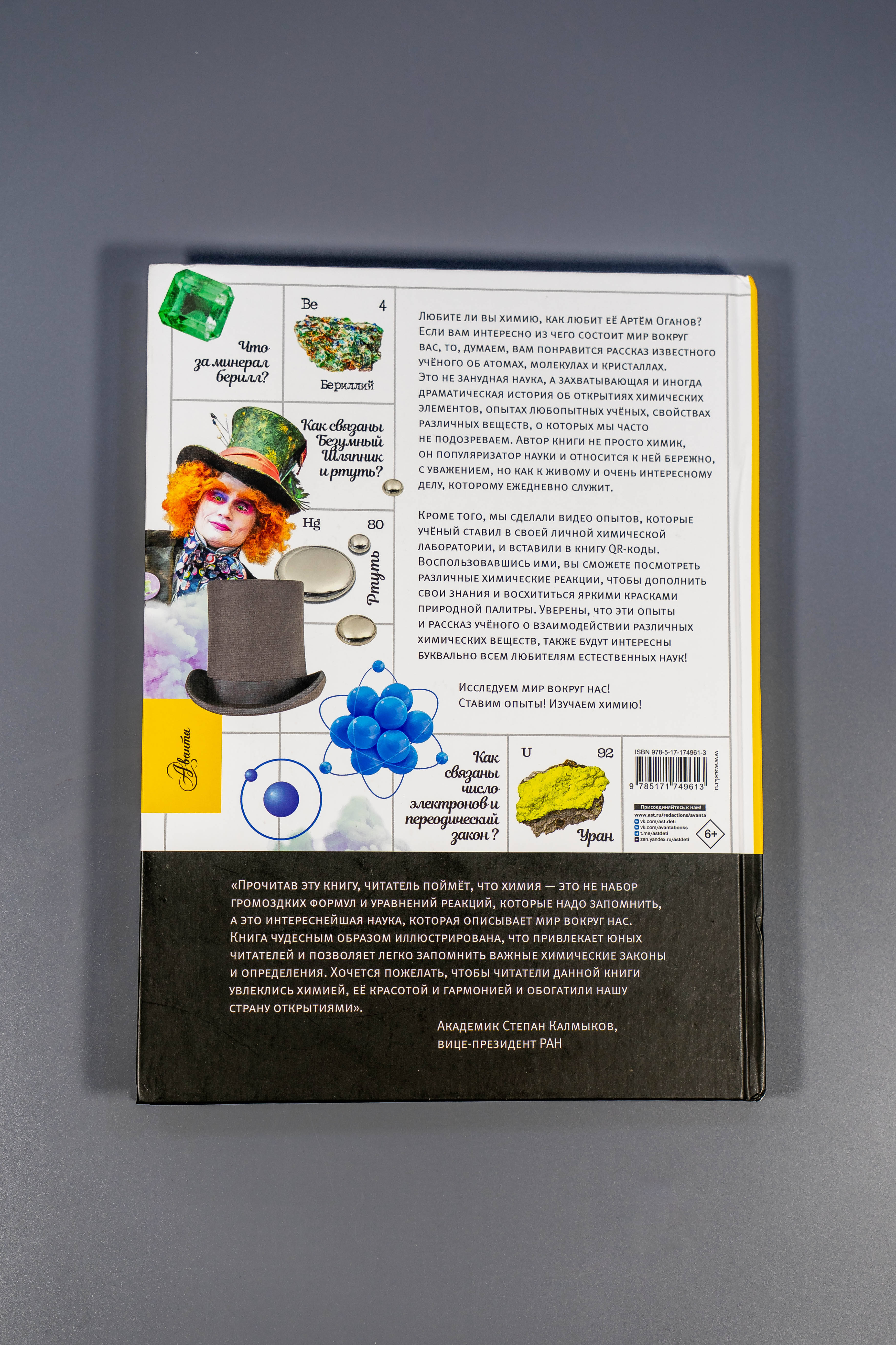 Книга известного учёного Артёма Оганова расскажет школьникам о химических элементах, атомах и молекулах, кристаллах, а яркие запоминающиеся иллюстрации художника Василисы Зинковой дополнят интересный рассказ, заставив подростков улыбнуться. В книгу добавлены QR-коды, с помощью которых можно посмотреть видео химических опытов, поставленных в лаборатории автором. Для среднего и старшего школьного возраста.| Издательство | Издательство "АСТ" |