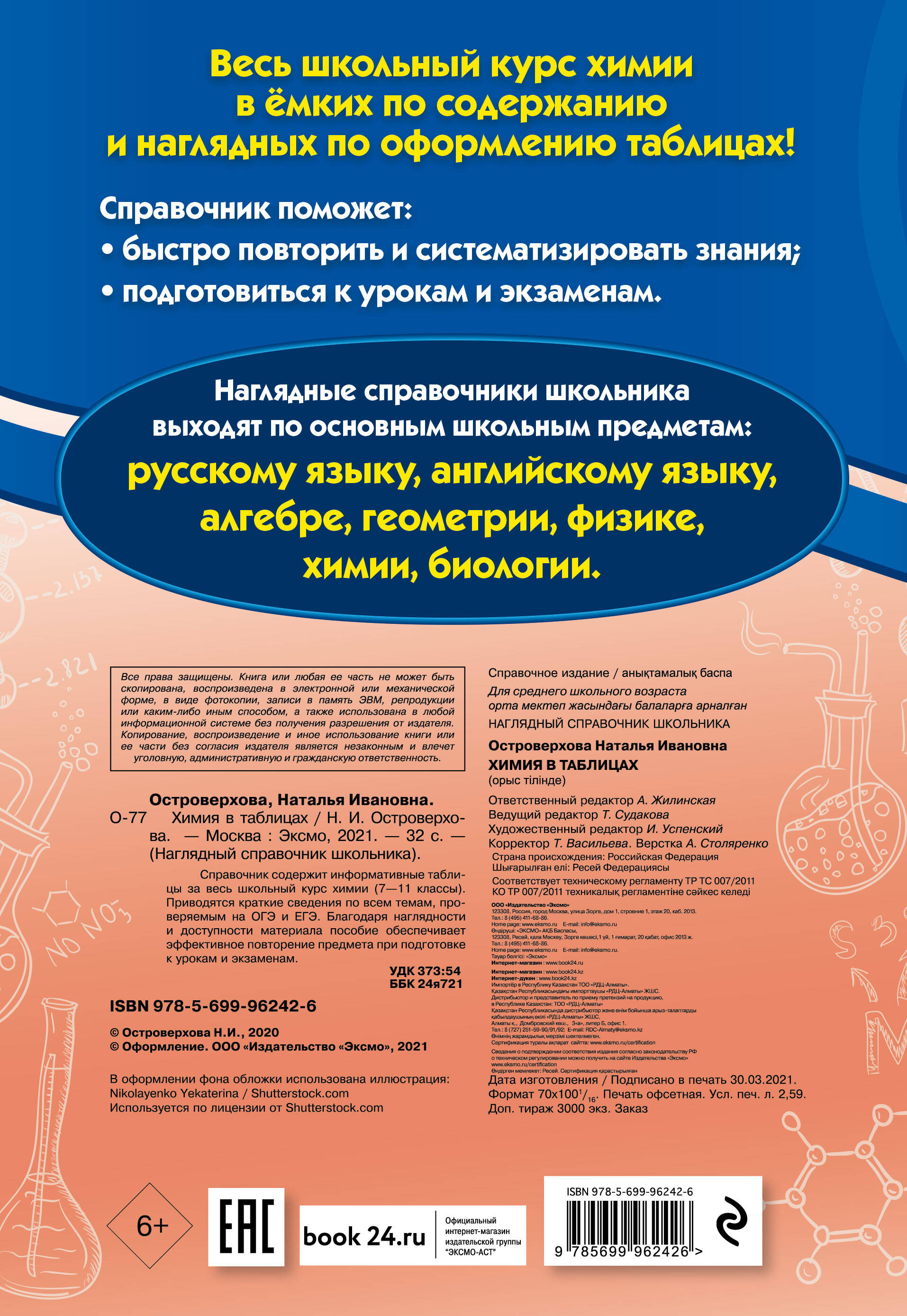Справочник содержит информативные таблицы за весь школьный курс химии (8-11 классы). Приводятся краткие сведения по всем темам, проверяемым на ОГЭ и ЕГЭ. Благодаря наглядности и доступности материала пособие обеспечивает эффективное повторение предмета при подготовке к урокам и экзаменам. Двухцветное справочное пособие содержит важные материалы школьного курса химии в табличной форме. Небольшой по объёму, но ёмкий по содержанию справочник поможет школьникам быстро и точно запомнить все необходимые темы и основные понятия, а также повторить их перед уроками, контрольными и экзаменами. Всё просто и наглядно!| Издательство | ООО "Издательство "Эксмо" |