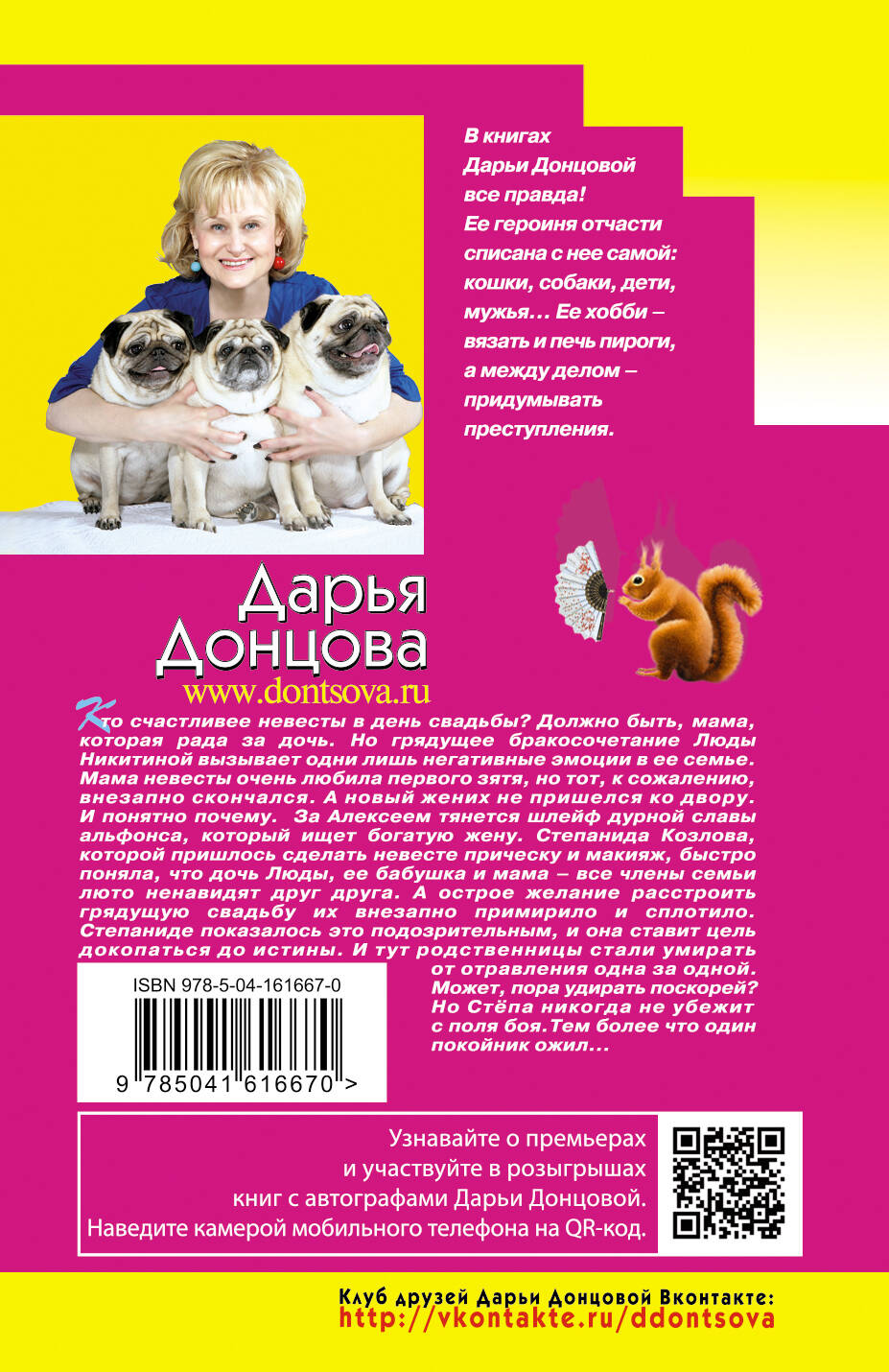 Кто счастливее невесты в день свадьбы? Должно быть, мама, которая рада за дочь. Но грядущее бракосочетание Люды Никитиной вызывает одни лишь негативные эмоции в ее семье. Мама невесты очень любила первого зятя, но тот, к сожалению, внезапно скончался. А новый жених не пришелся ко двору. И понятно почему. За Алексеем тянется шлейф дурной славы альфонса, который ищет богатую жену. Степанида Козлова, которой пришлось сделать невесте прическу и макияж, быстро поняла, что дочь Люды, ее бабушка и мама - все члены семьи люто ненавидят друг друга. А острое желание расстроить грядущую свадьбу их внезапно примирило и сплотило. Степаниде показалось это подозрительным, и она ставит цель докопаться до истины. И тут родственницы стали умирать от отравления одна за одной. Может, пора удирать поскорей? Но Стёпа никогда не убежит с поля боя. Тем более что один покойник ожил… Дарья Донцова - самый популярный и востребованный автор в нашей стране, любимица миллионов читателей. В России продано более 200 миллионов экземпляров ее книг. Детективы Дарьи Донцовой написаны в особой манере: помимо интереснейшего сюжета, в них всегда присутствует тонкий юмор, здравый оптимизм и безусловная вера в торжество добра над злом. Это всё, что нужно для отдыха, релаксации и душевного успокоения. Прочтите книги Дарьи, и ваши сердца и души наполнятся светом, оптимизмом, радостью, уверенностью в завтрашнем дне! Они заразят вас желанием жить, радоваться каждому дню и верить в лучшее. -------------------------------------------------- «Донцова невероятная работяга! Я не знаю ни одного другого писателя, который столько работал бы. Я отношусь к ней с уважением, как к образцу писательского трудолюбия. Женщины нуждаются в психологической поддержке и получают ее от Донцовой. Я и сама в свое время прочла несколько романов Донцовой. Ее читают очень разные люди. И очень занятые бизнес-леди, чтобы на время выключить голову, и домохозяйки, у которых есть перерыв 15-20 минут между отвести-забрать детей». - Галина Юзефович, литературный критик «У Дарьи вся детективная закваска всего лишь фон для раскрытия характеров, взаимоотношений между людьми. Всегда есть интрига, и до последнего эпизода непонятно, что, как и почему. В этом смысле условия жанра абсолютно выполняются. Дарья Донцова, конечно, одна из лучших». - Дмитрий Харатьян «Давно начала читать, и так втянулась! И сейчас читаю романы Дарьи. Я отдыхаю за ними. Сама Донцова интеллигентная женщина, у неё мягкий юмор и нестрашный сюжет, всё с позитивом и надеждой на хороший конец. Это прекрасно». - Лариса Удовиченко| Издательство | Эксмо |