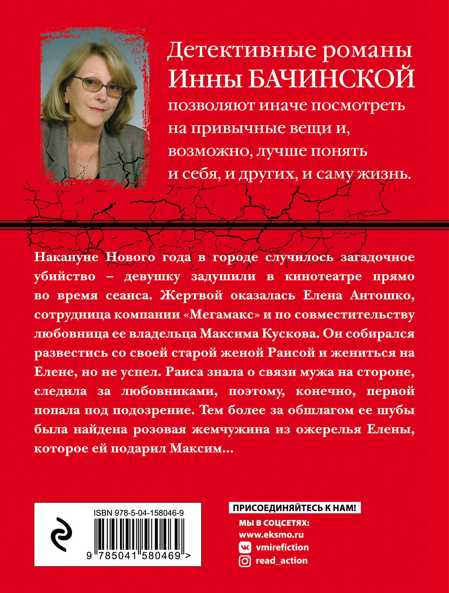 Накануне Нового года в городе случилось загадочное убийство - девушку задушили в кинотеатре прямо во время сеанса. Жертвой оказалась Елена Антошко, сотрудница компании «Мегамакс» и по совместительству любовница ее владельца, Максима Кускова. Он собирался развестись со своей старой женой Раисой и жениться на Елене, но не успел. Раиса знала о связи мужа на стороне, следила за любовниками, поэтому, конечно, первой попала под подозрение. Тем более, за обшлагом ее шубы была найдена розовая жемчужина из ожерелья Елены, которое ей подарил Максим... Детективные романы Инны Бачинской - новое слово в мире остросюжетной литературы. Тонкие, стильные и изящные, они удивляют нестандартностью подхода и нетривиальными сюжетами. Блестящая эрудиция и оригинальный взгляд автора позволяют иначе посмотреть на привычные вещи и, возможно, лучше понять, и себя, и других, и саму жизнь.| Издательство | ООО "Издательство "Эксмо" |